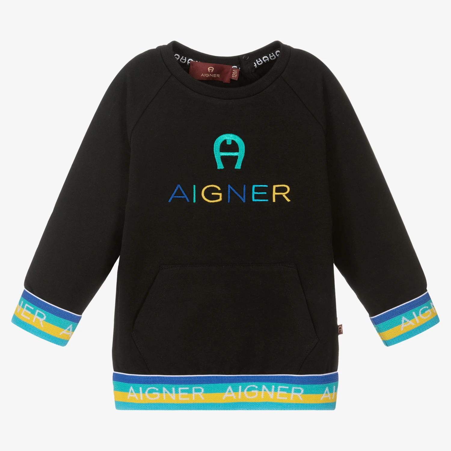 Black crew neck sweatshirt for baby boys, by German brand AIGNER. Made in soft cotton jersey, it has the signature ‘A’ horseshoe logo embroidered on the front in vibrant shades of blue and yellow. Fastening with easy poppers on the back, it has blue and yellow striped cuffs and a matching logo hem for a fun, statement look.