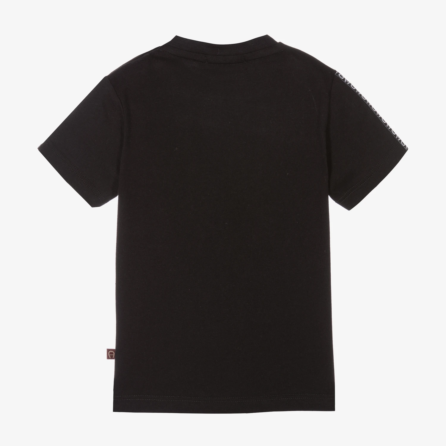 Casual black T-shirt for baby boys, by German brand AIGNER. Made in soft cotton jersey, it has the brand’s signature ‘A’ horseshoe logo printed on the front in blue and yellow for a recognisable look. It fastens with useful poppers on one shoulder and has black logo taping on the sleeves.