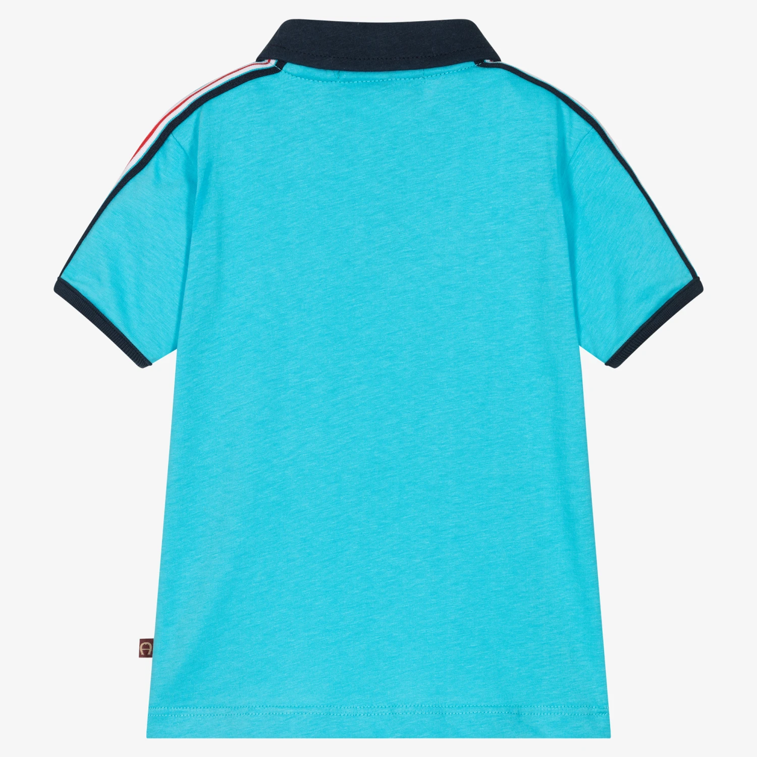 Turquoise blue polo shirt for baby boys from AIGNER, made in soft jersey. The collar and cuffs have a contrasting navy blue trim, and there is a patterned white logo panel across the front featuring the designer’s signature ‘A’ horseshoe motif. The shoulders have a sporty look with striped red, white, and blue trim, and the top fastens with branded buttons. The shirt is finished with an embroidered logo on the chest and a logo tab on the side seam for a designer touch.