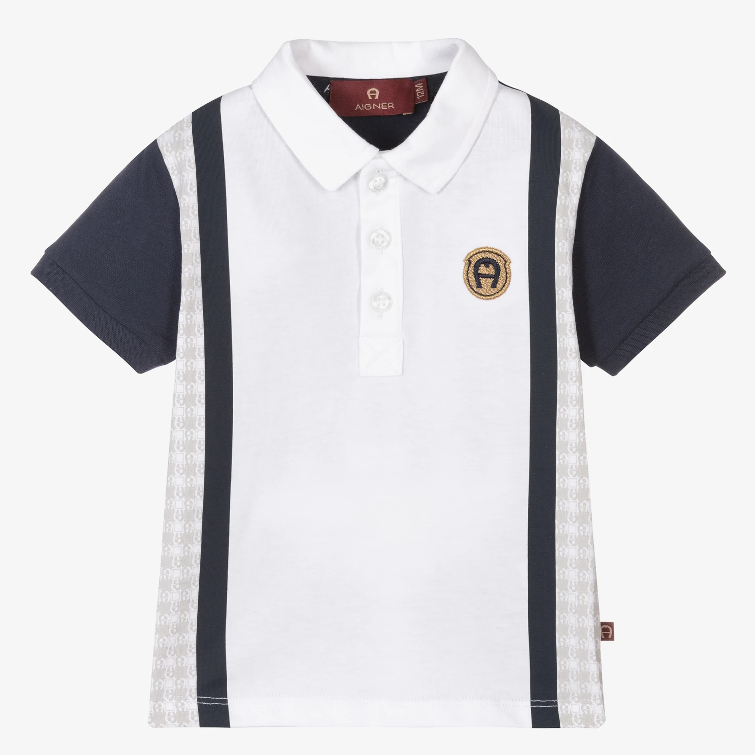 Navy blue and white polo shirt for baby boys by AIGNER, made in soft cotton jersey. The designer’s signature ‘A’ horseshoe logo is embroidered on the chest in gold and navy blue, with grey and white logo patterned panels down the sides. It fastens with branded buttons and has a small logo tab sewn on the side.