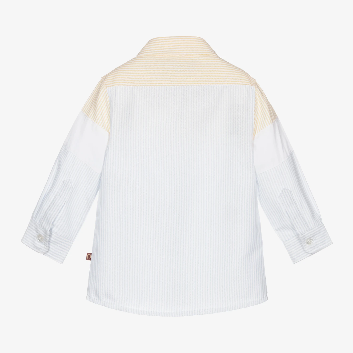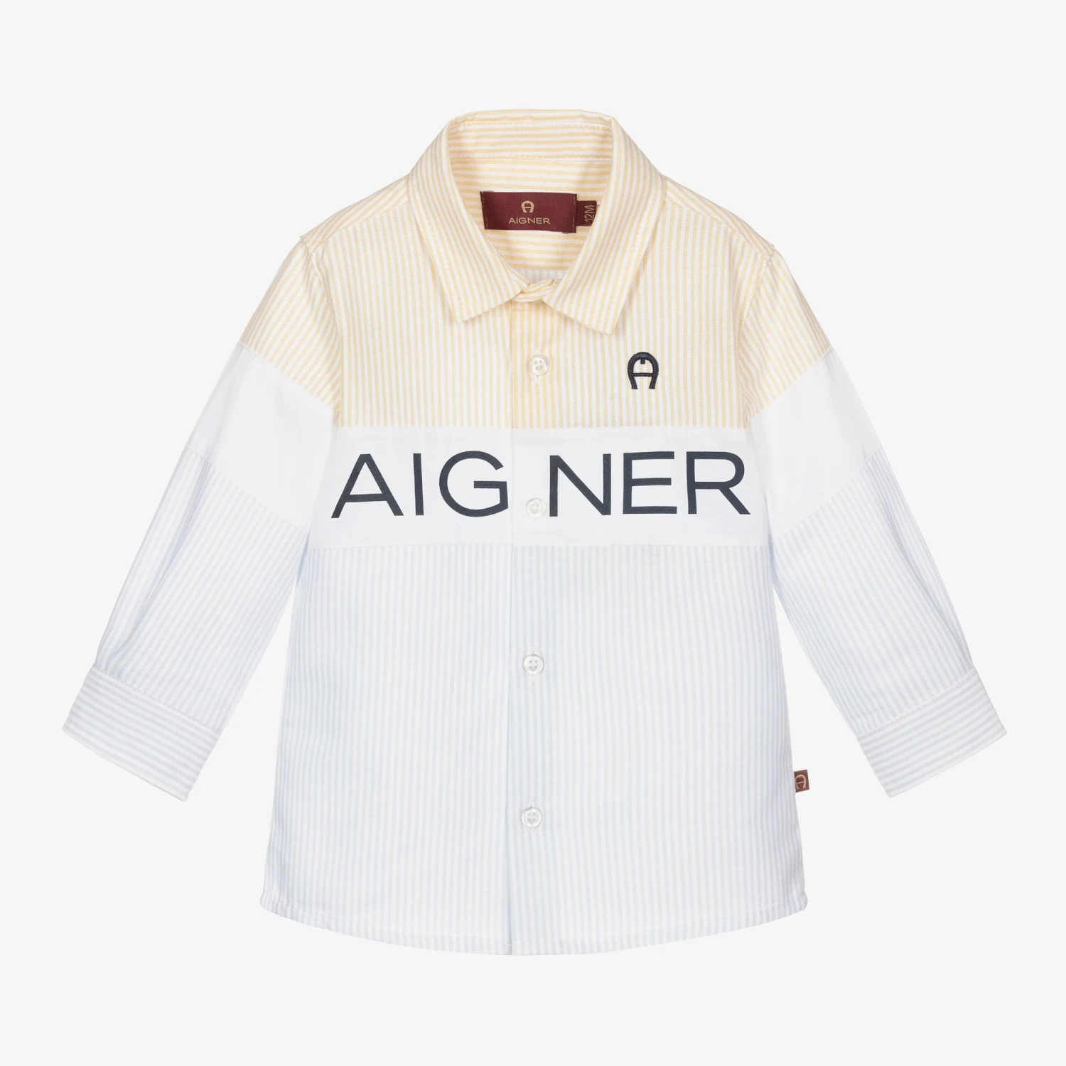 Blue and yellow striped shirt for baby boys by AIGNER, made in soft Oxford cotton. Designed in a half-and-half style, this button-up shirt has the brand’s signature ‘A’ horseshoe logo embroidery on the chest and a white poplin panel across the front with a navy blue logo print.
