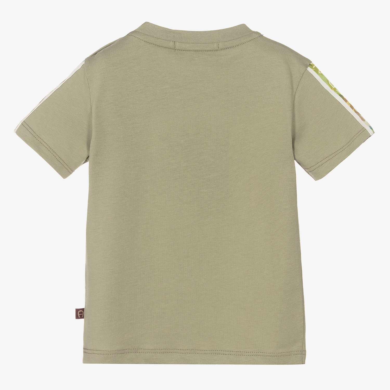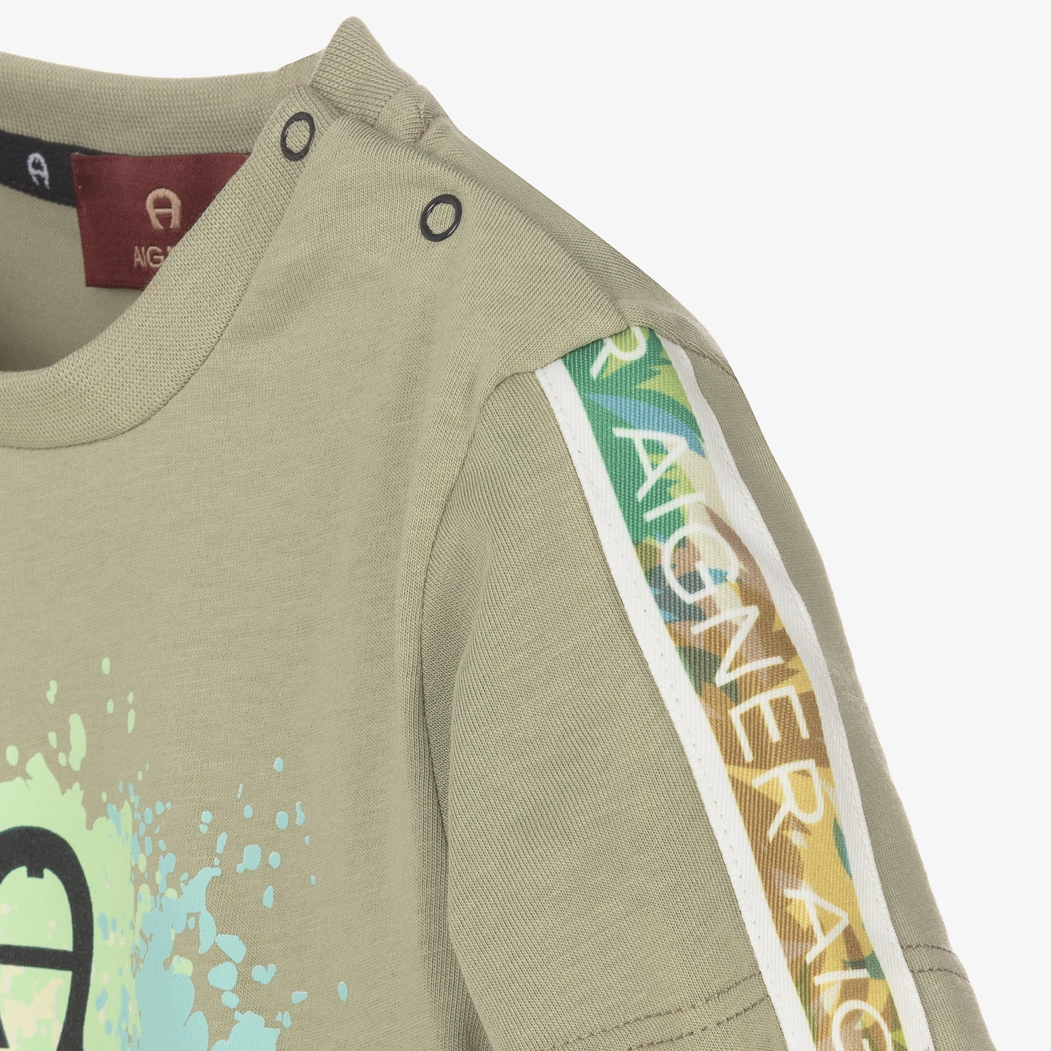 Khaki green T-shirt for baby boys by German designer AIGNER, made from soft and stretchy cotton jersey. This breathable top features an orange, green, yellow and blue splashed paint design, complemented by the brands signature ‘A’ horseshoe logo print. It has green and white logo tape trims on both shoulders and popper fastenings on one shoulder for easy dressing.