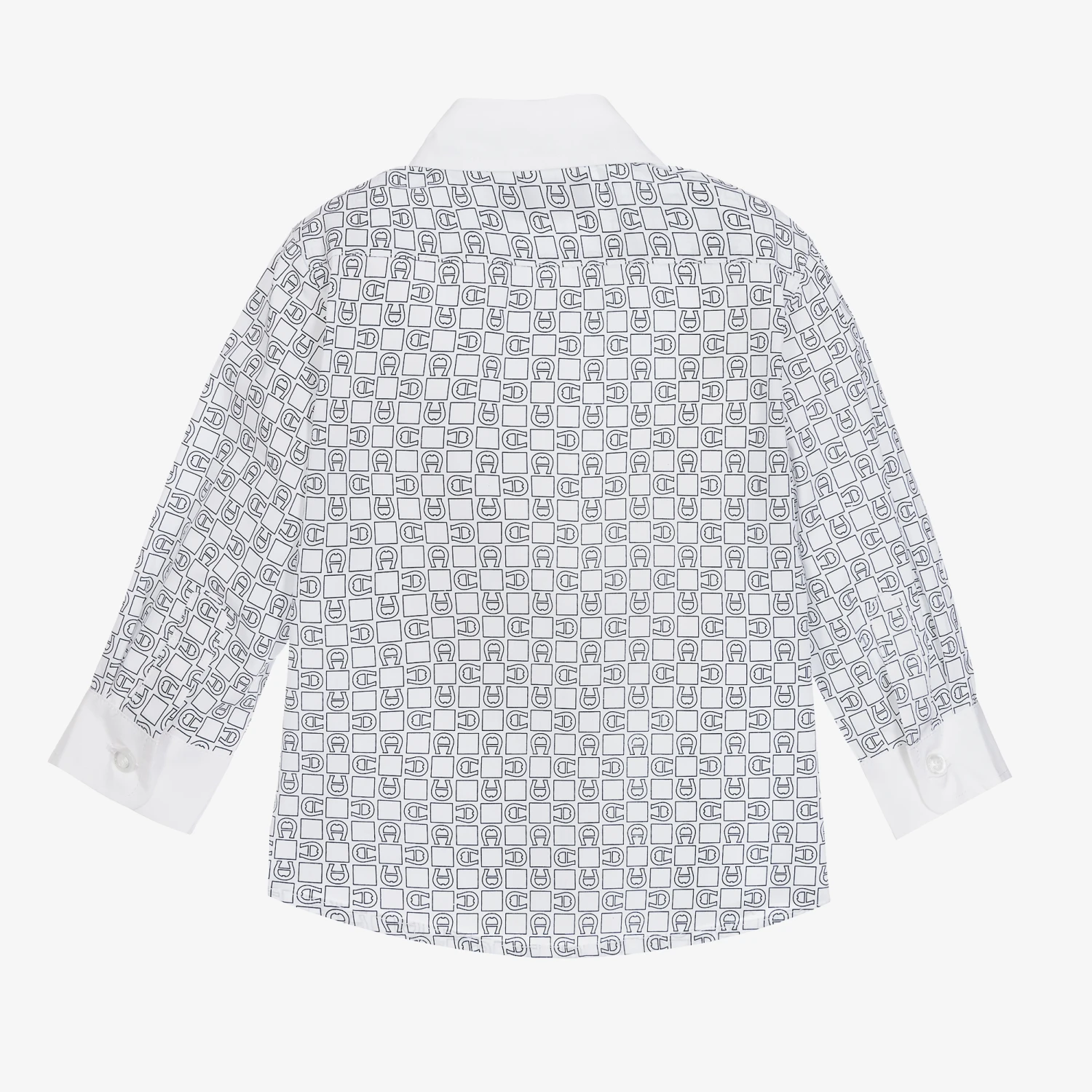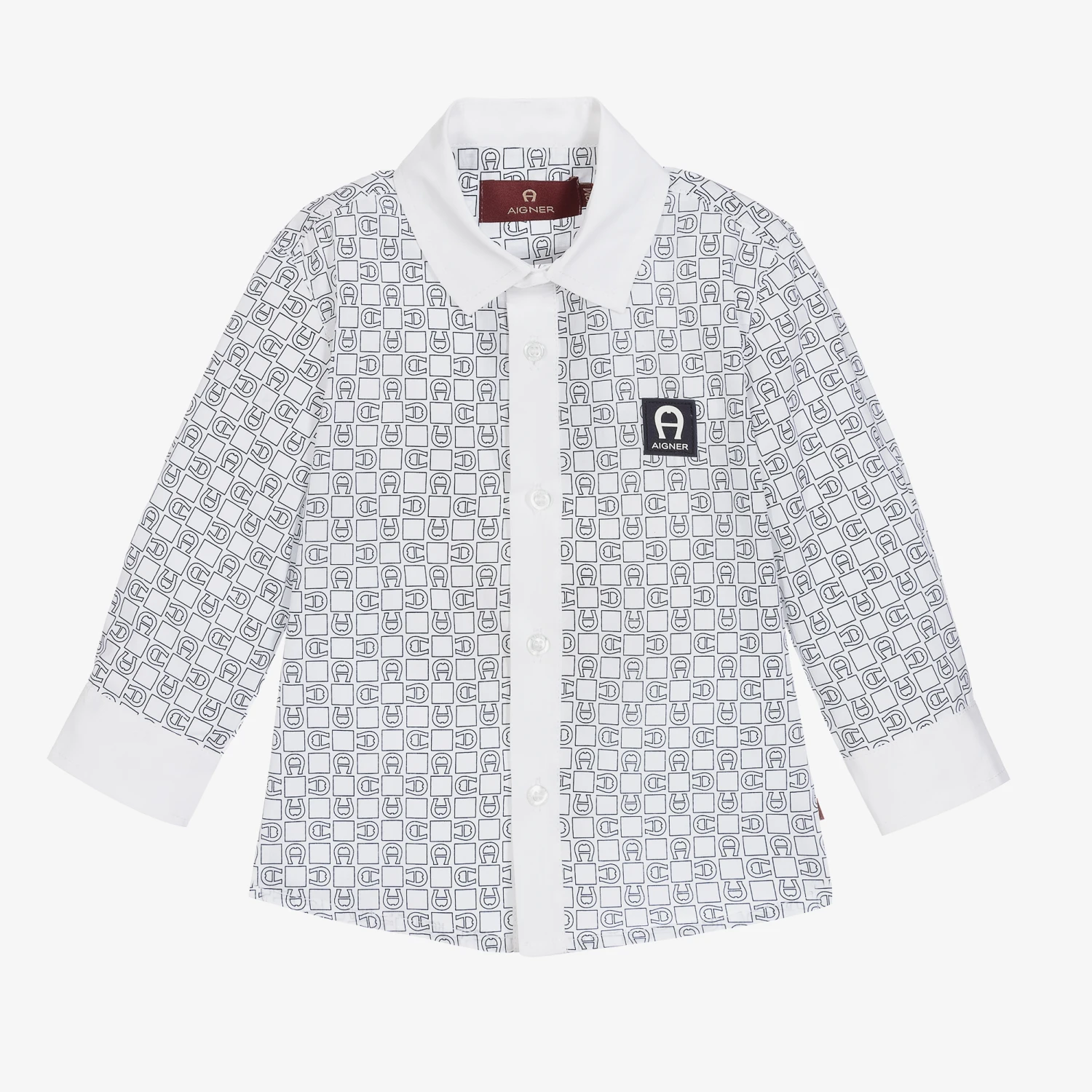 Baby boys smart white shirt from AIGNER, with an all-over signature ‘A’ horseshoe logo pattern in navy blue. Made in cotton poplin, it has white trim, branded button fastenings, and a rubberised logo patch on the chest.