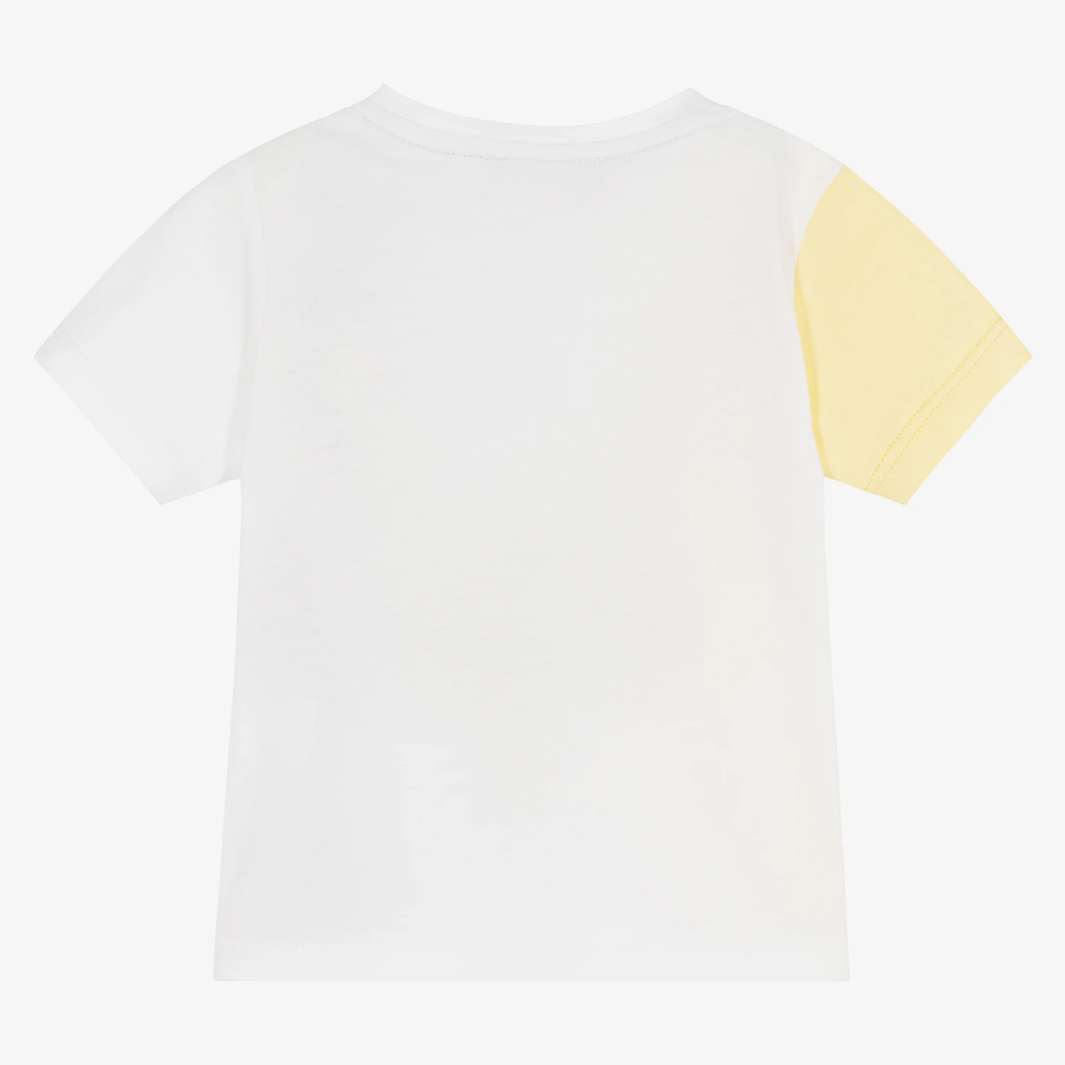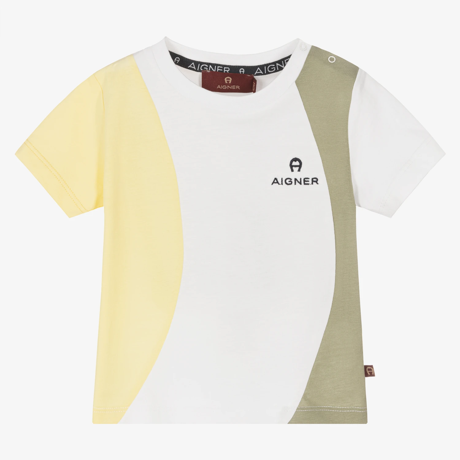 Colourblock T-shirt for baby boys by AiGNER, with curved panels in white, yellow and green. Made in soft and comfortable cotton jersey, it has an embroidered navy blue logo design on the chest and a branded tab on the side seam for a designer finish. There are popper fastenings on one shoulder to help with dressing.