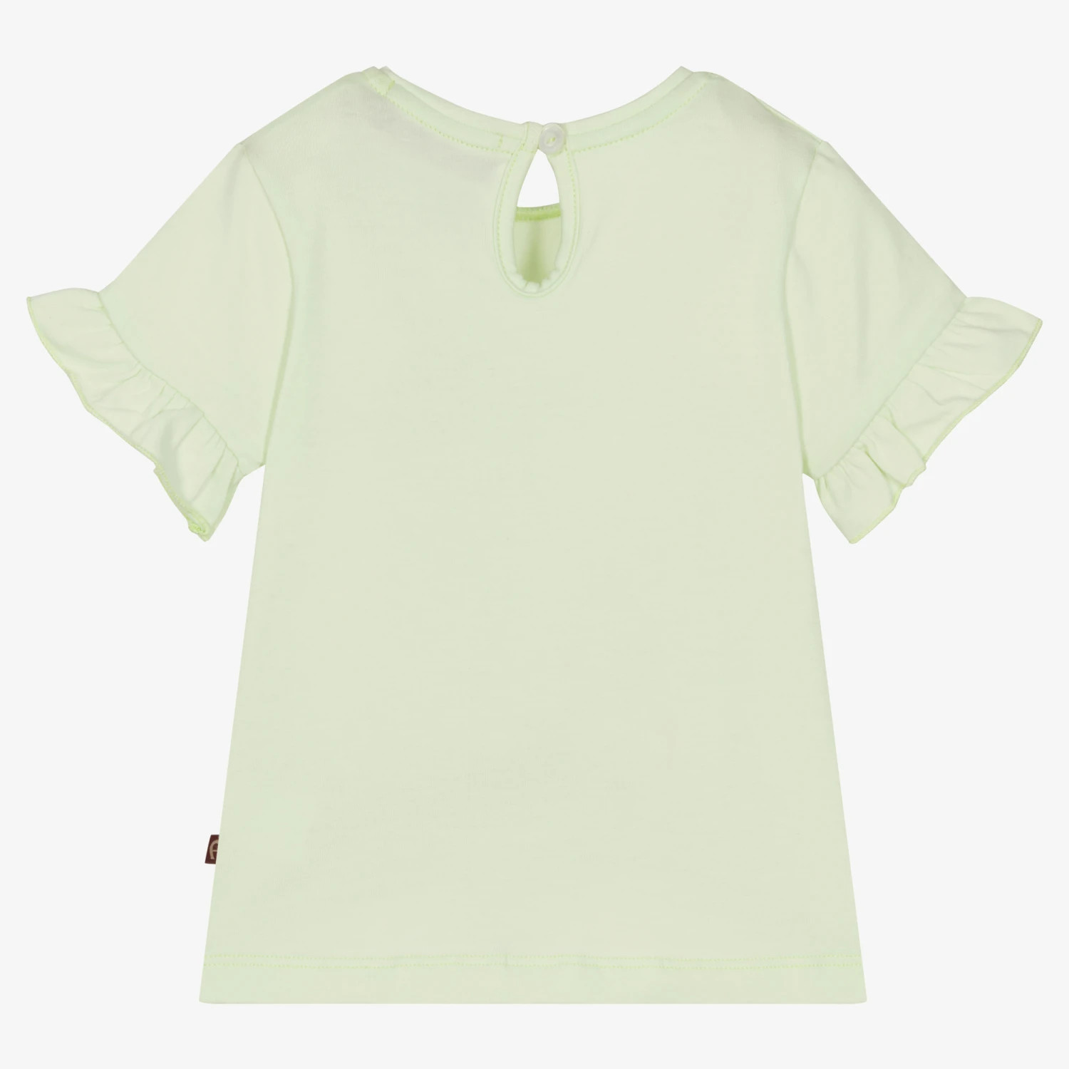 Pale green T-shirt for little girls from AIGNER, with cute ruffle trim on the sleeves. Made in soft and comfortable cotton jersey, it is printed with the brand’s crest logo motif in gold and green, featuring the signature ‘A’ horseshoe. It has a stylish keyhole fastening on the back and a logo tab on the side seam.