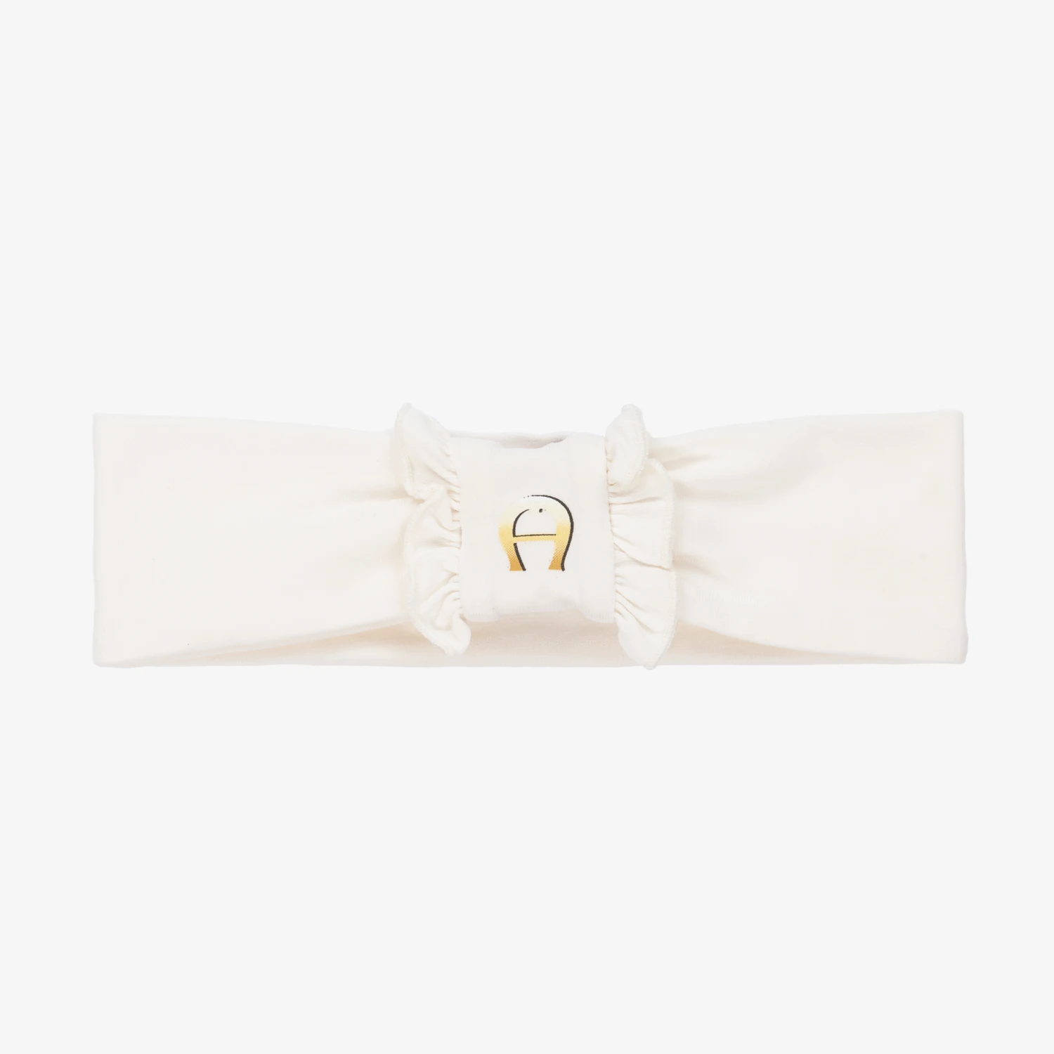 Ivory headband for baby girls by AIGNER, made in super soft Pima cotton jersey. It has a pretty bow detail on the front, with the brand’s signature ‘A’ horseshoe logo printed in golden yellow and black.