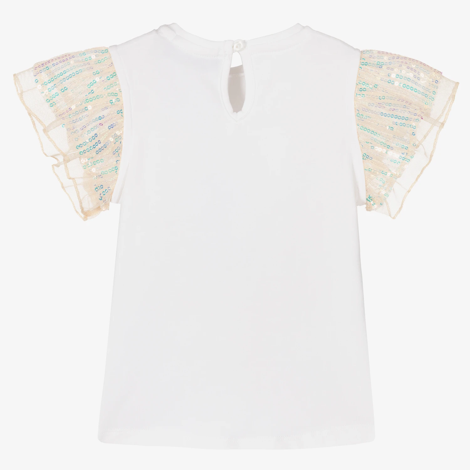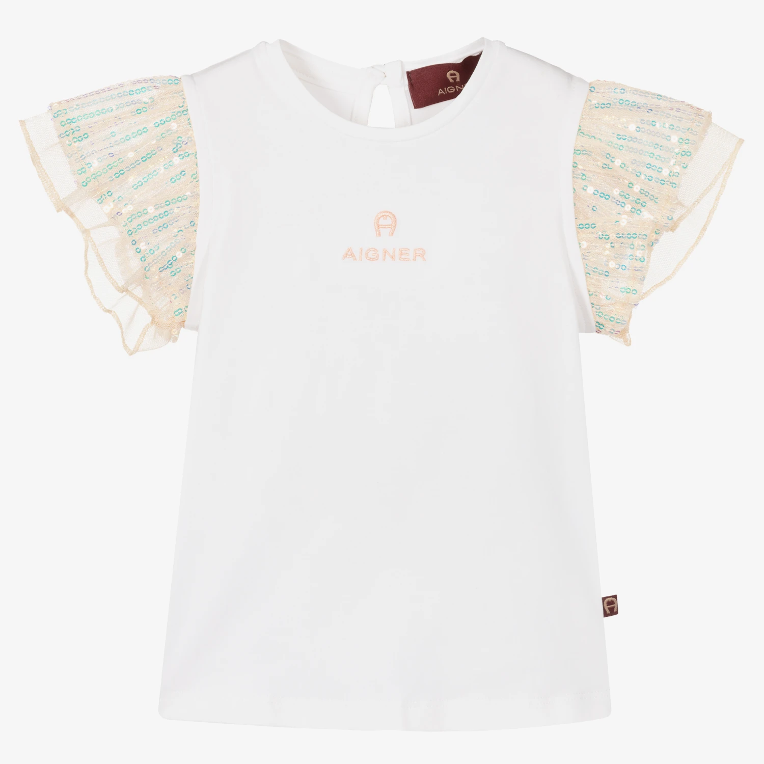 White T-shirt for baby girls by German designer AIGNER, made in soft and stretchy cotton jersey. This pretty top has the brands signature ‘A’ horseshoe logo in pink embroidery, complemented by pink ruffled mesh sequin sleeves for a sparkly, contemporary look. It has a keyhole button fastening on the back.