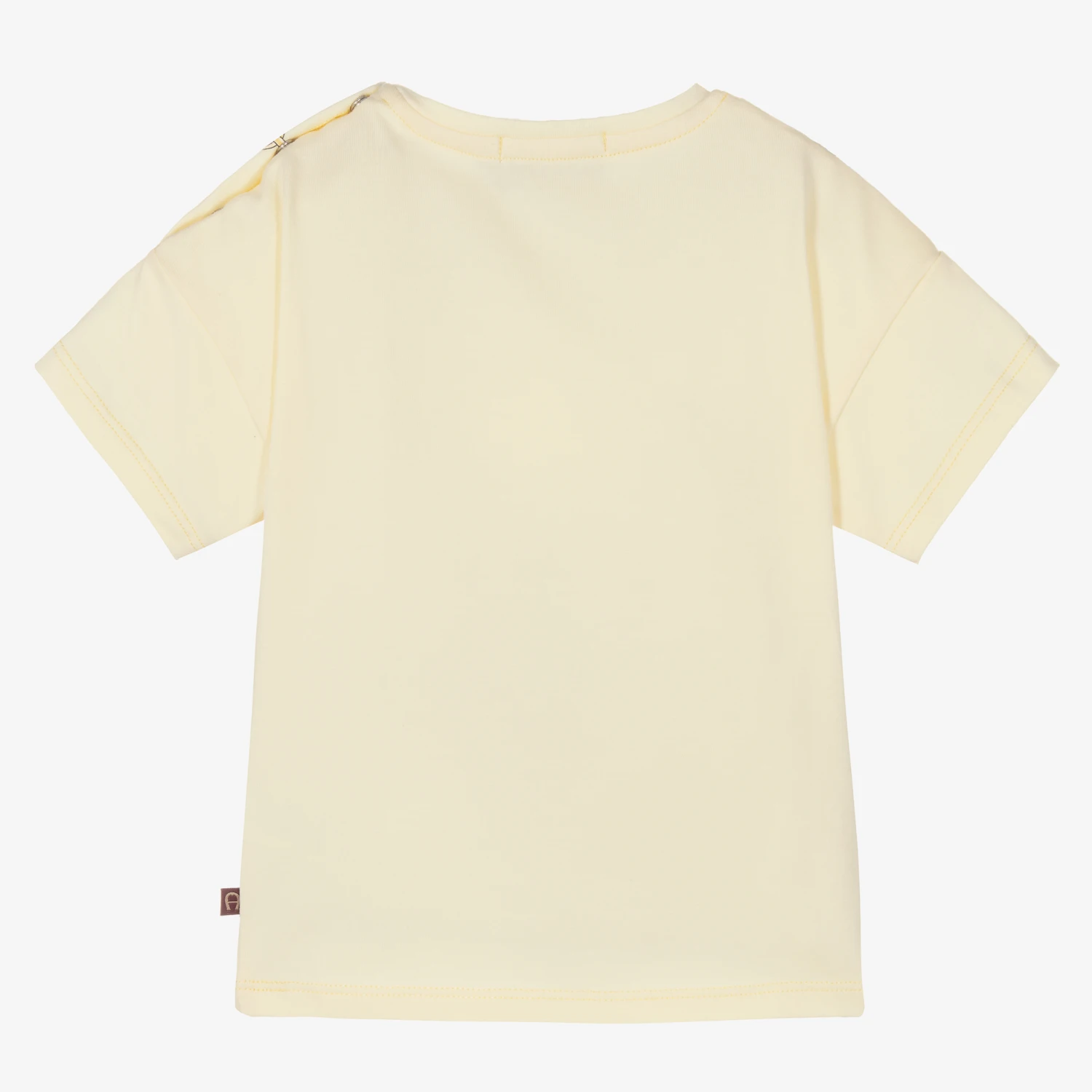 Pastel yellow T-shirt for baby girls by German designer AIGNER, made in soft and stretchy cotton jersey. It has a crossbody bag print, with a gold chain pattern and the brand’s signature ‘A’ horseshoe logo print. There are concealed popper fastenings on one shoulder for comfort and easy dressing.