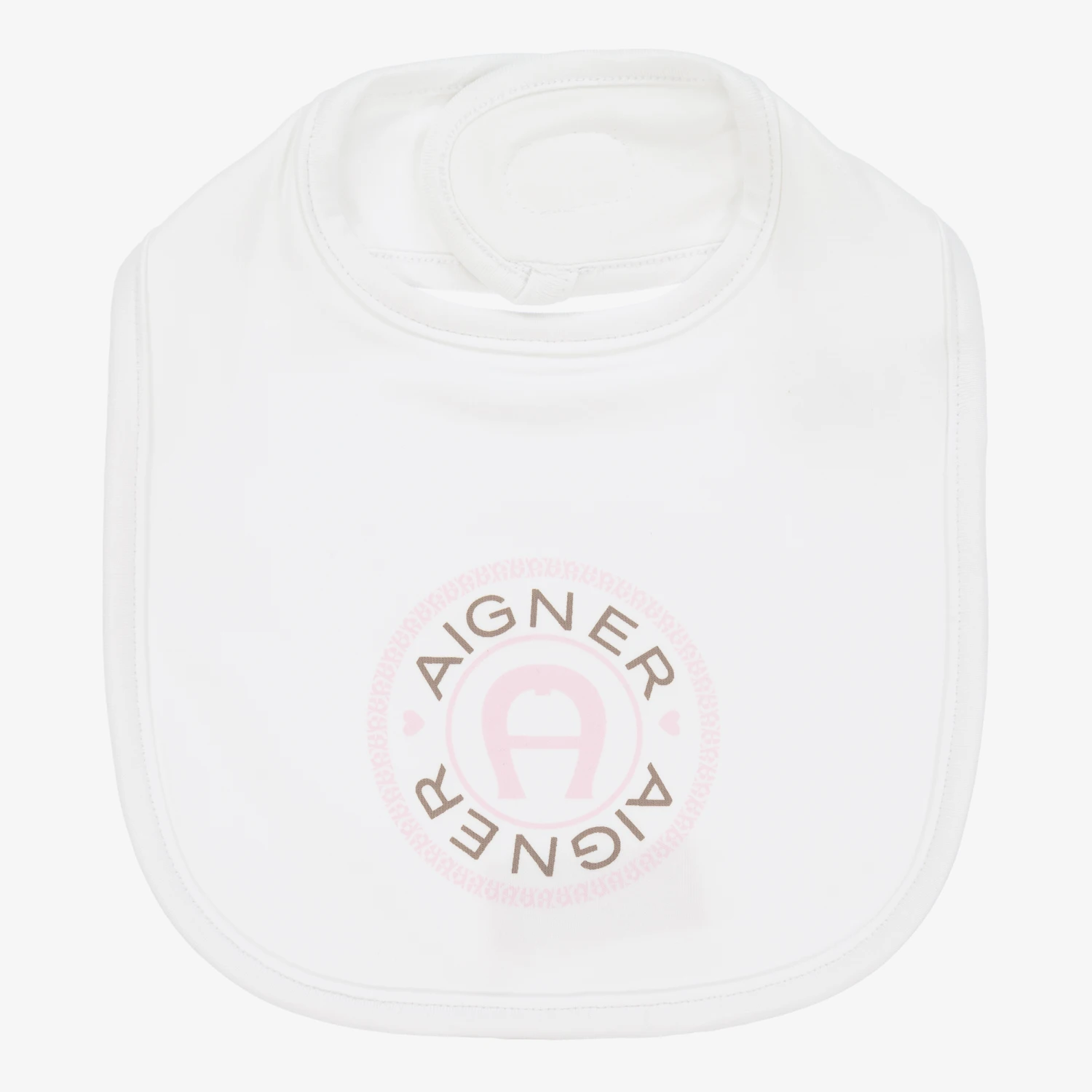 Ivory bib for baby boys and girls by AIGNER, made in a double layer of super soft Pima cotton jersey. It features the brand’s logo print on the front with the signature ‘A’ horseshoe in pink and fastens easily at the back with velcro for a comfortable fit.