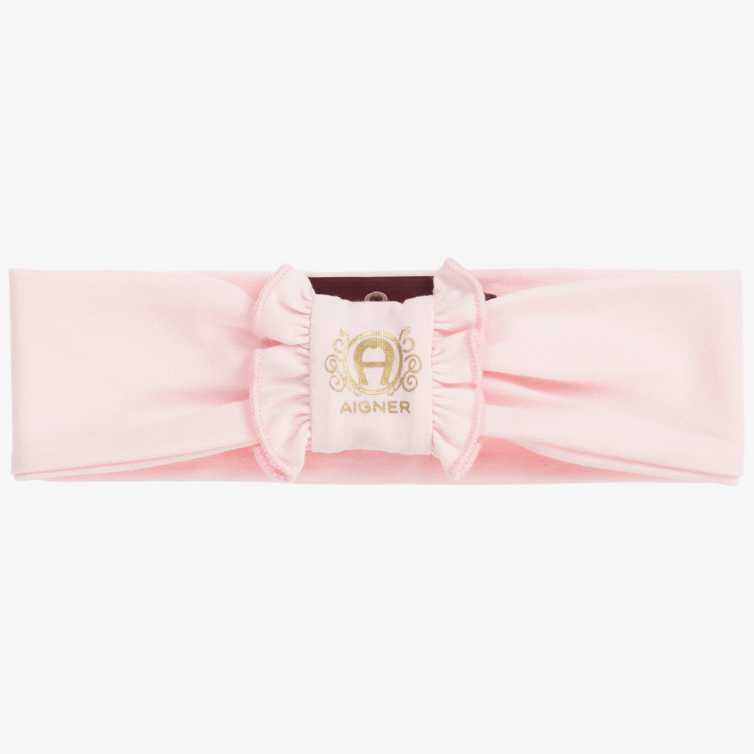Baby girls pink headband by AIGNER, made in super soft and comfortable Pima cotton jersey. It has a frilled central knot, printed with the brand’s signature ‘A’ horseshoe logo in shiny gold.