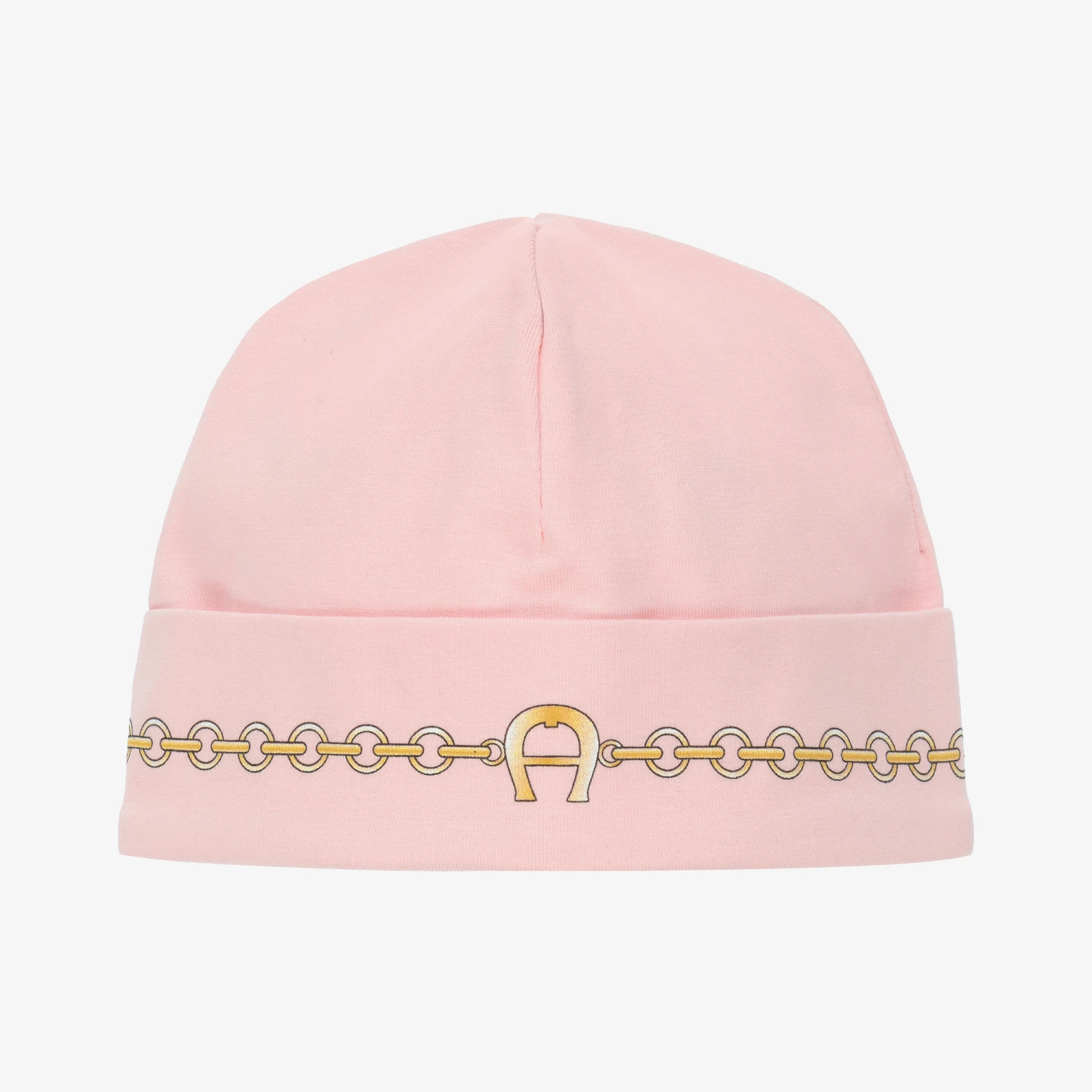 Pink hat for baby girls by AIGNER, made in super soft Pima cotton jersey. It has a gold chain print along the brim, with the brand’s signature ‘A’ horseshoe logo.