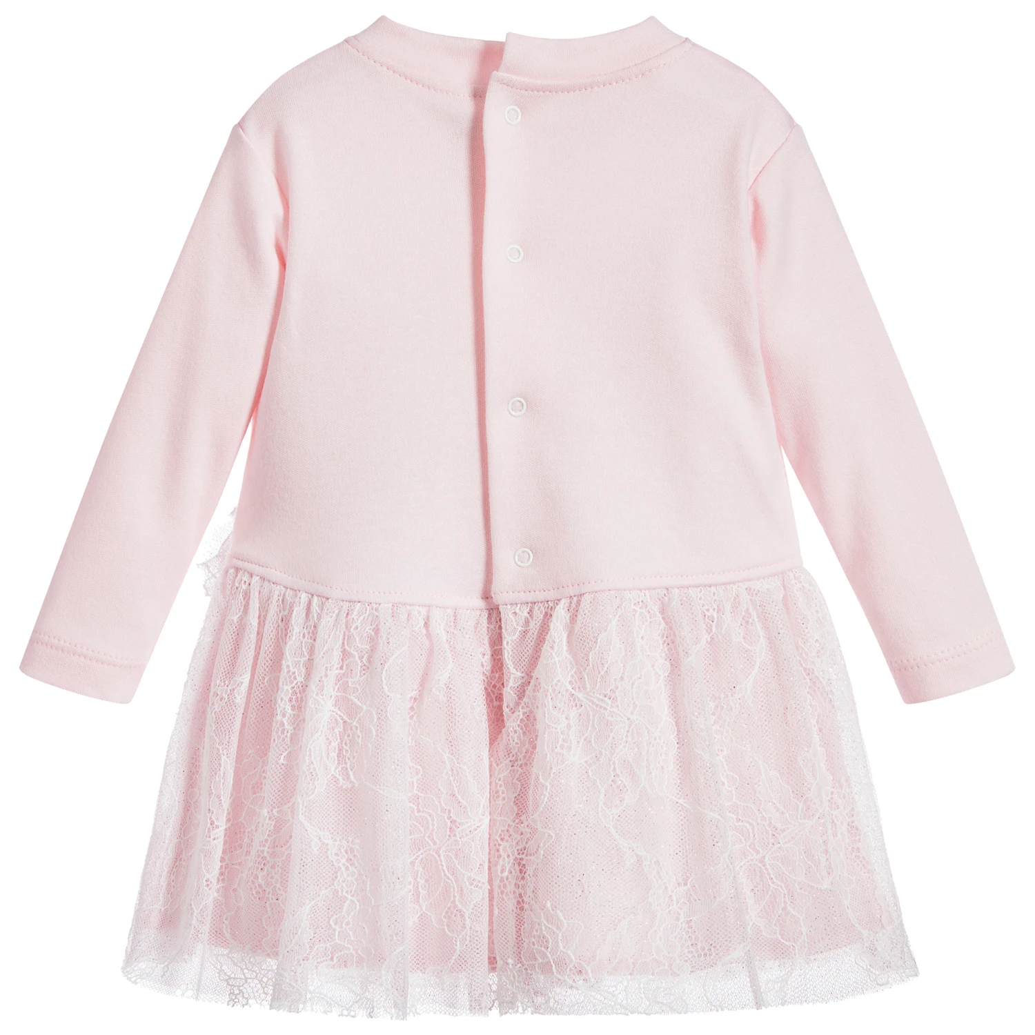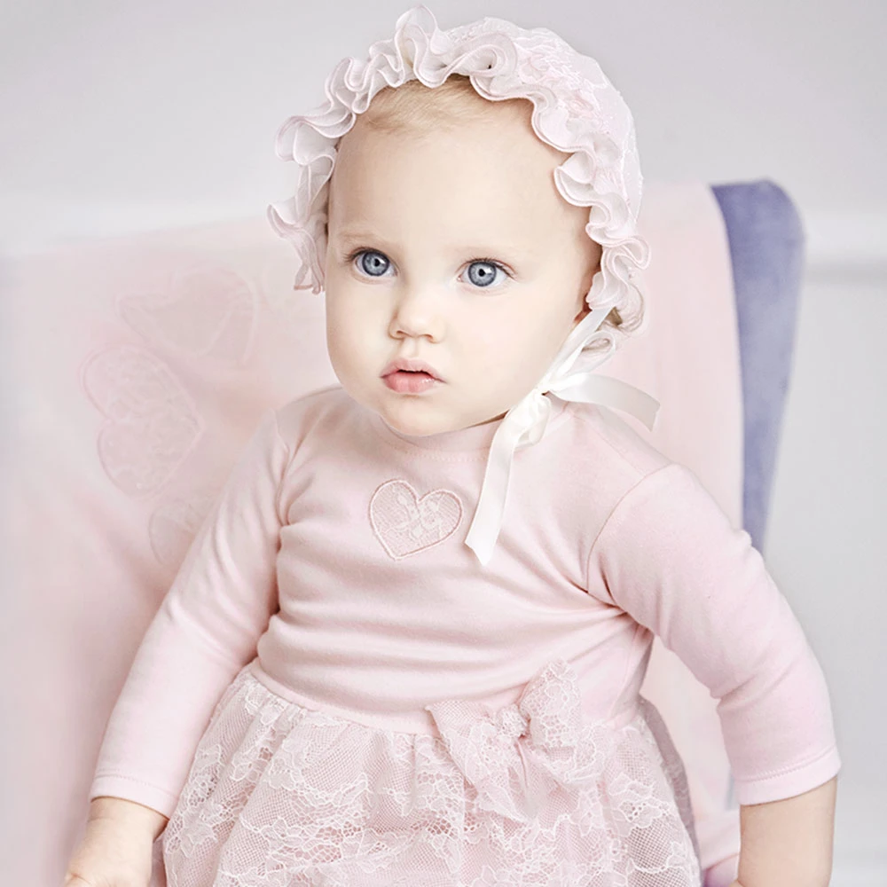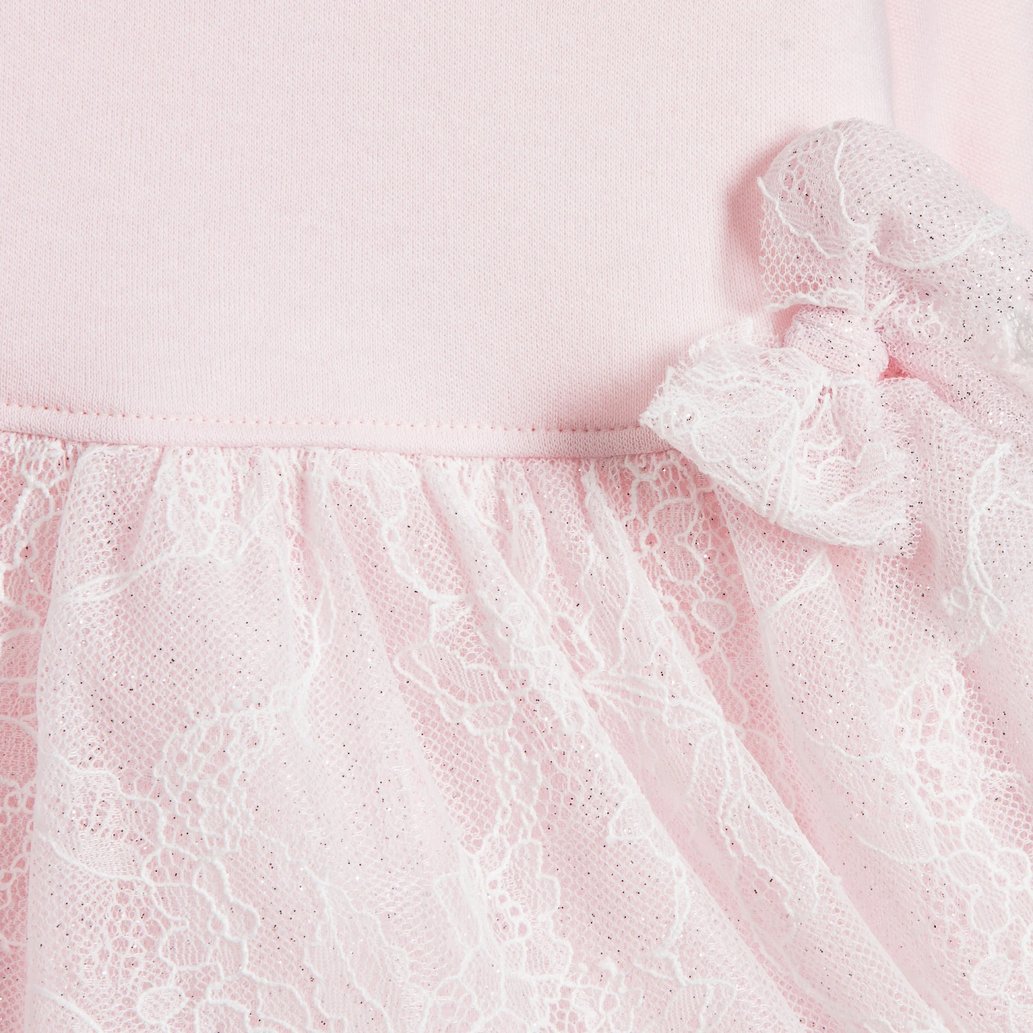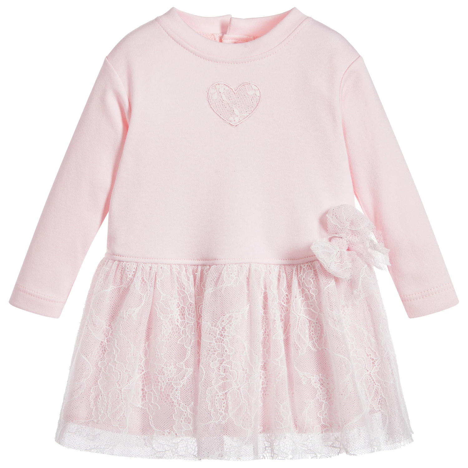 Beautifully soft and comfortable, this pale pink Aletta dress is made in lightweight jersey with a cosy fleece feel inside. The skirt has a gorgeous sparkly lace overlay which matches the heart appliqué.