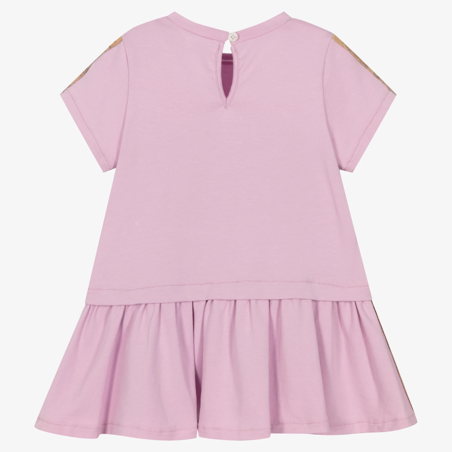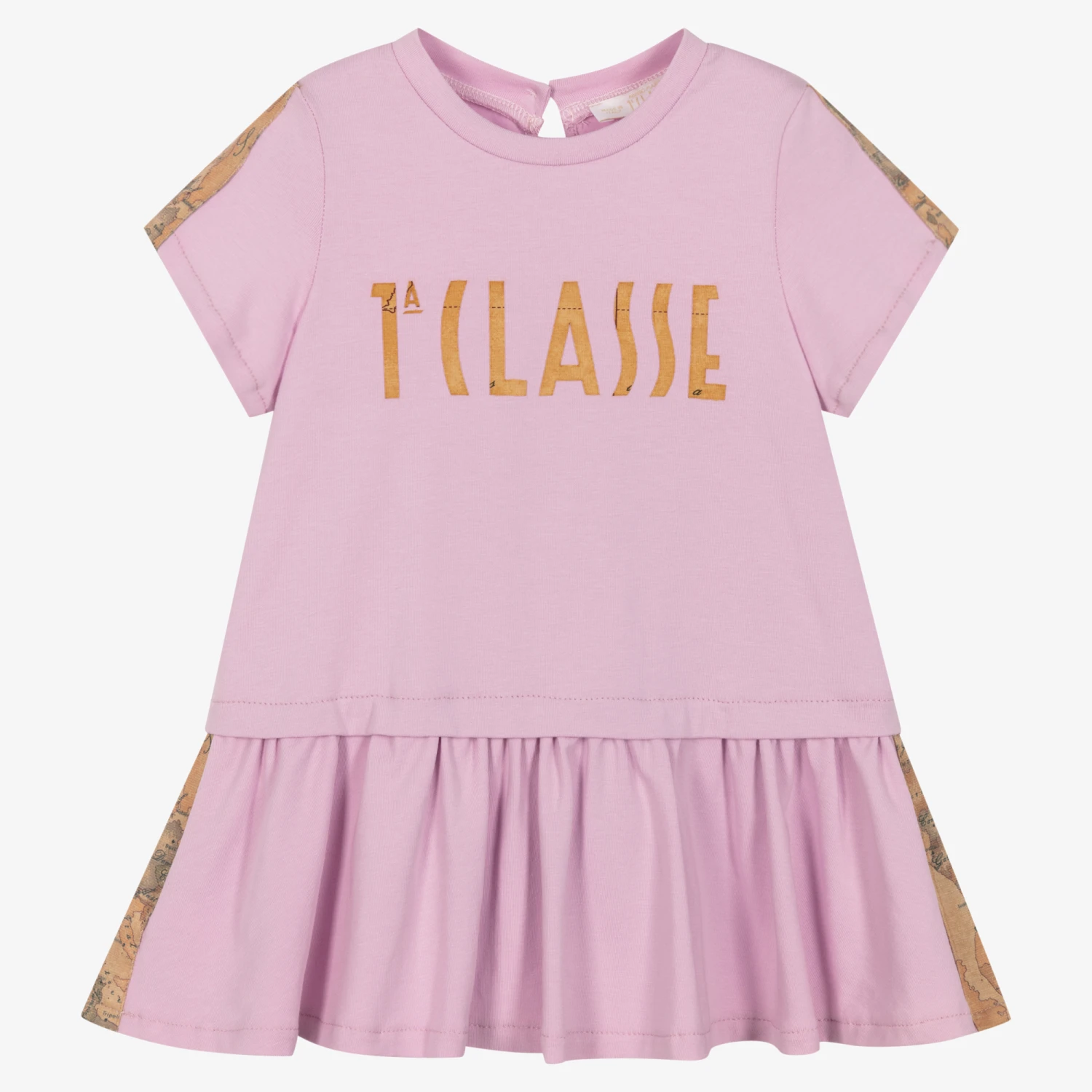 A comfortable and casual lilac purple dress for little girls with signature Alviero Martini style. Made in soft and stretchy cotton jersey, it is trimmed with the Italian designer’s recognisable dark beige Geo map print for a sporty look. An easy-to-wear slip-on style, it has a pretty dropped waist gathered skirt and an eye-catching 1a Clase logo on the front in matching Geo map print.