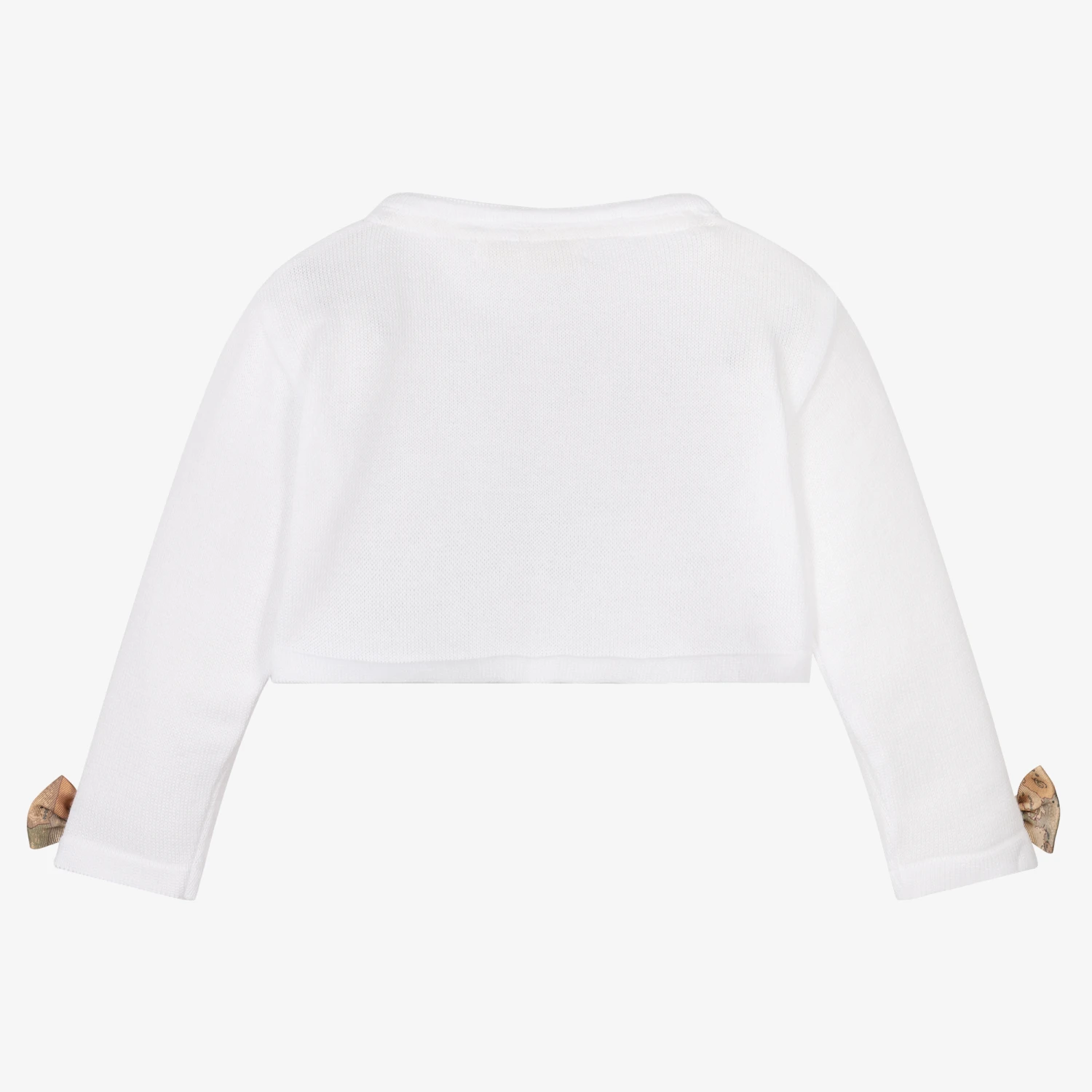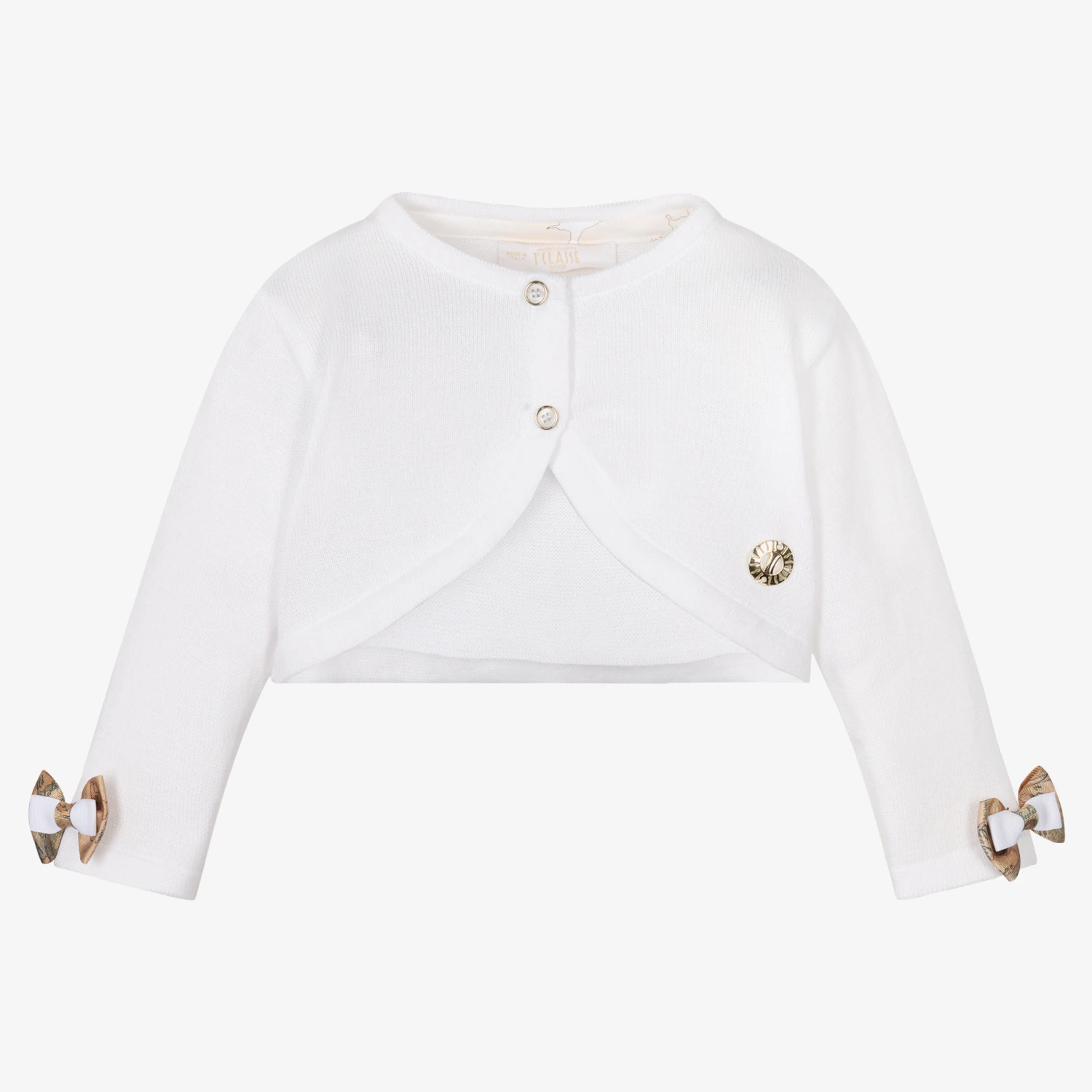 Ivory bolero cardigan for baby girls by Alviero Martini, knitted in soft cotton. This stylish cropped design has a shaped front with branded button fastenings, and a shiny gold metal Monogram logo stitched in one corner. The designer’s distinctive dark beige Geo map ribbon bows are stitched at each cuff for an extra branded touch.
