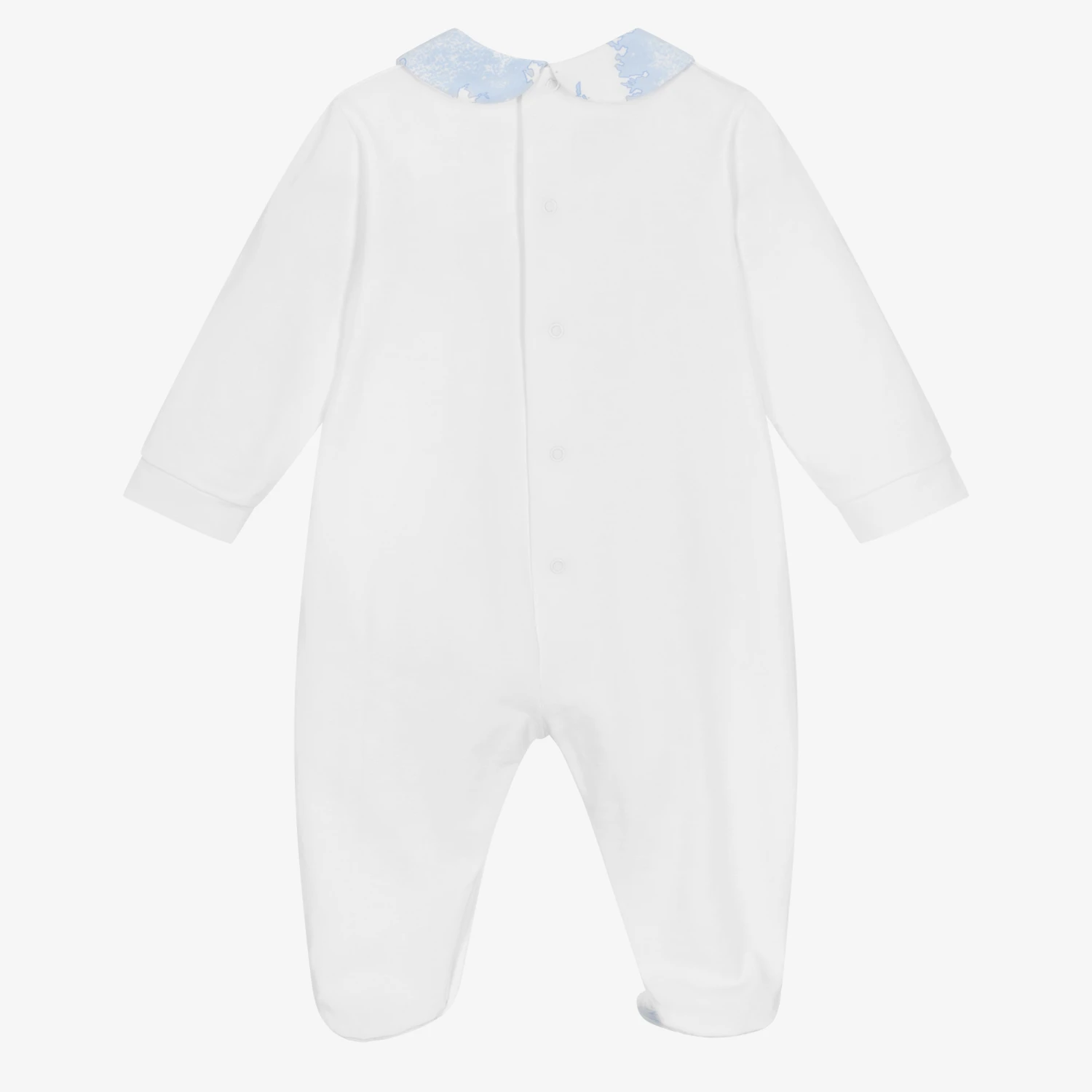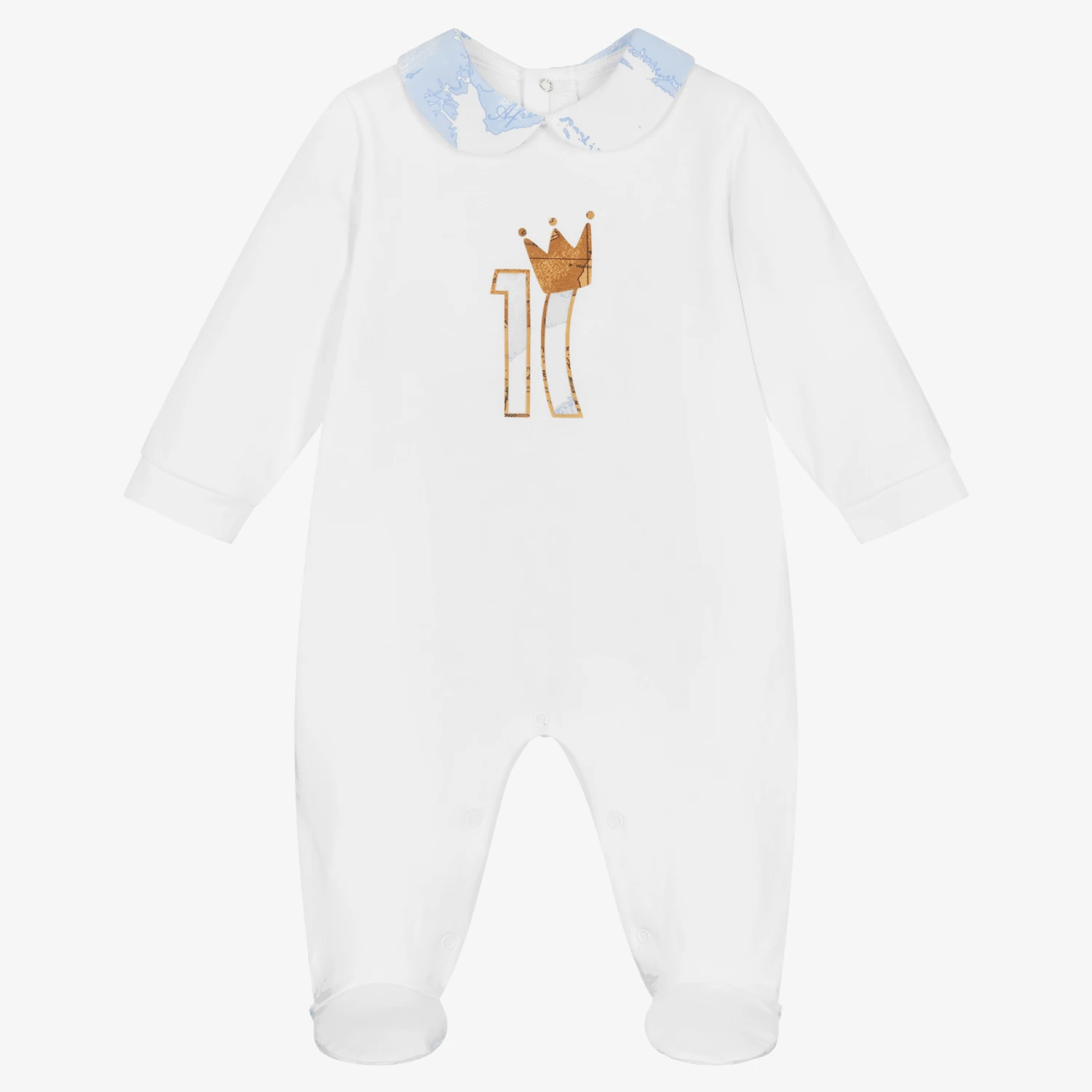 White cotton babygrow for baby boys and girls by Italian designer Alviero Martini. Made in soft and stretchy jersey, this comfortable babygrow has the brand’s distinctive blue and white Geo map print on the Peter Pan collar and on the soles of the feet. It has a signature Monogram and dark beige Geo Map crown appliqué on the front for an extra designer touch. There are popper fastenings on the back and between the legs for quick and easy dressing.