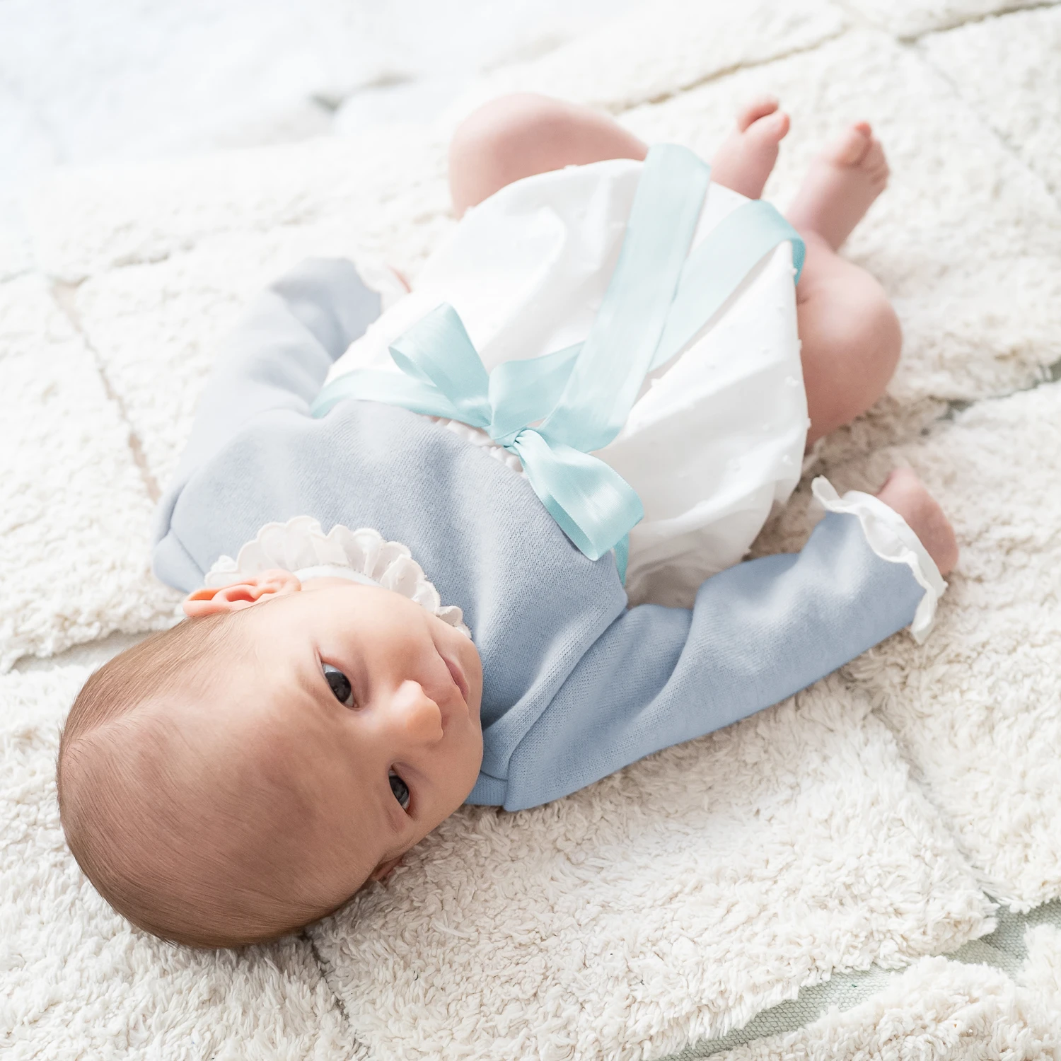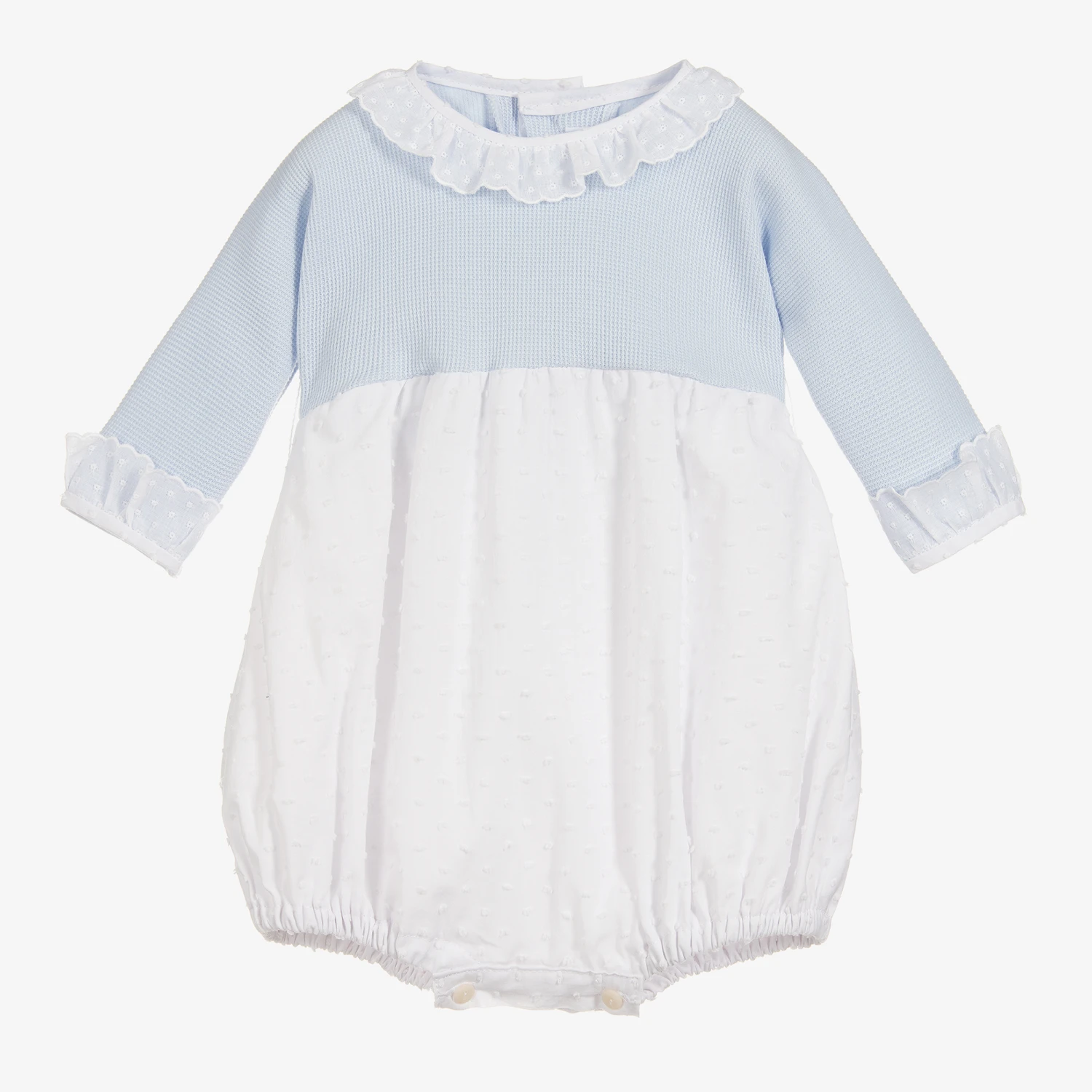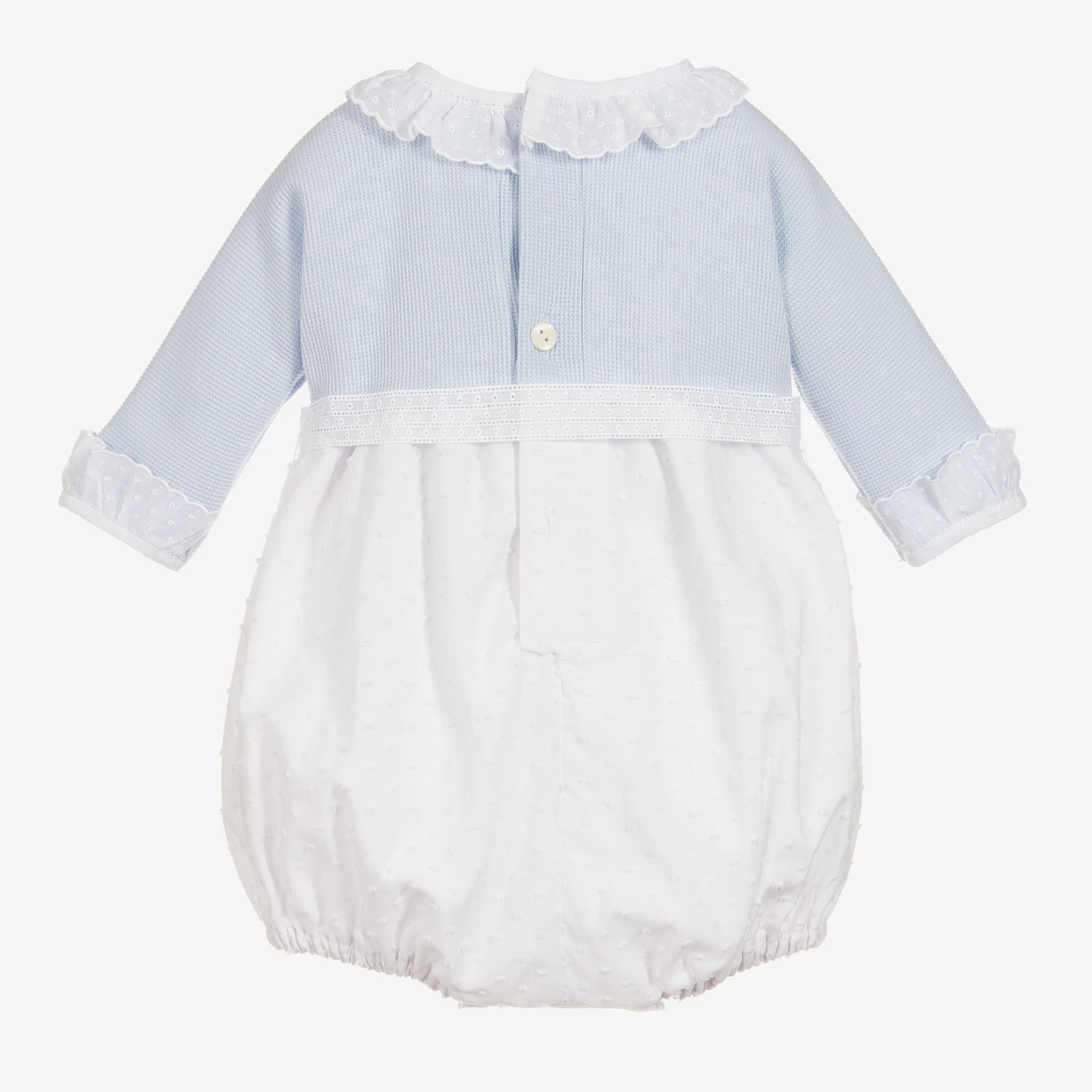 Blue and white traditional-style shortie for baby boys and girls by Ancar, it is made in a soft cotton blend, in a comfortable bubble shape. With elasticated legs and buttons down the back and underneath, it ties with a detachable, satin bow belt.