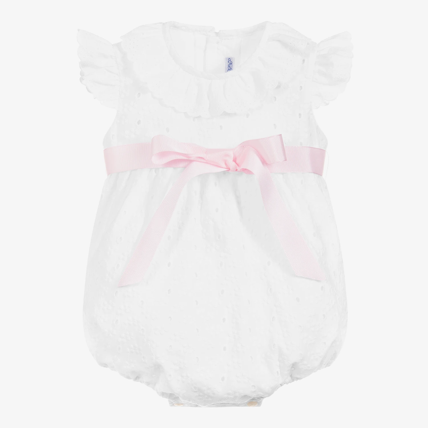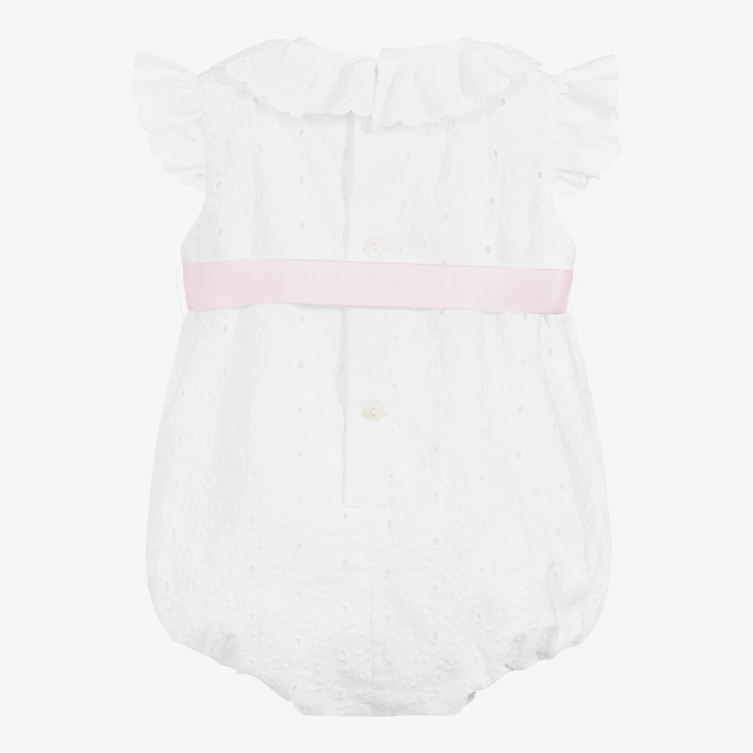 An adorable white shortie for baby girls by Ancar, made in lightweight cotton broderie anglaise and fully lined. With frilled sleeves and collar, it is finished with a pink grosgrain ribbon and bow. There are button fastenings on the back and between the legs.