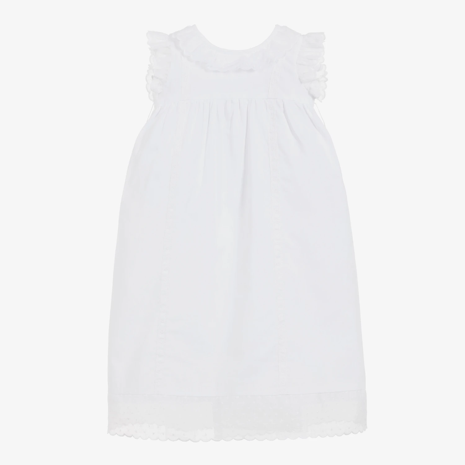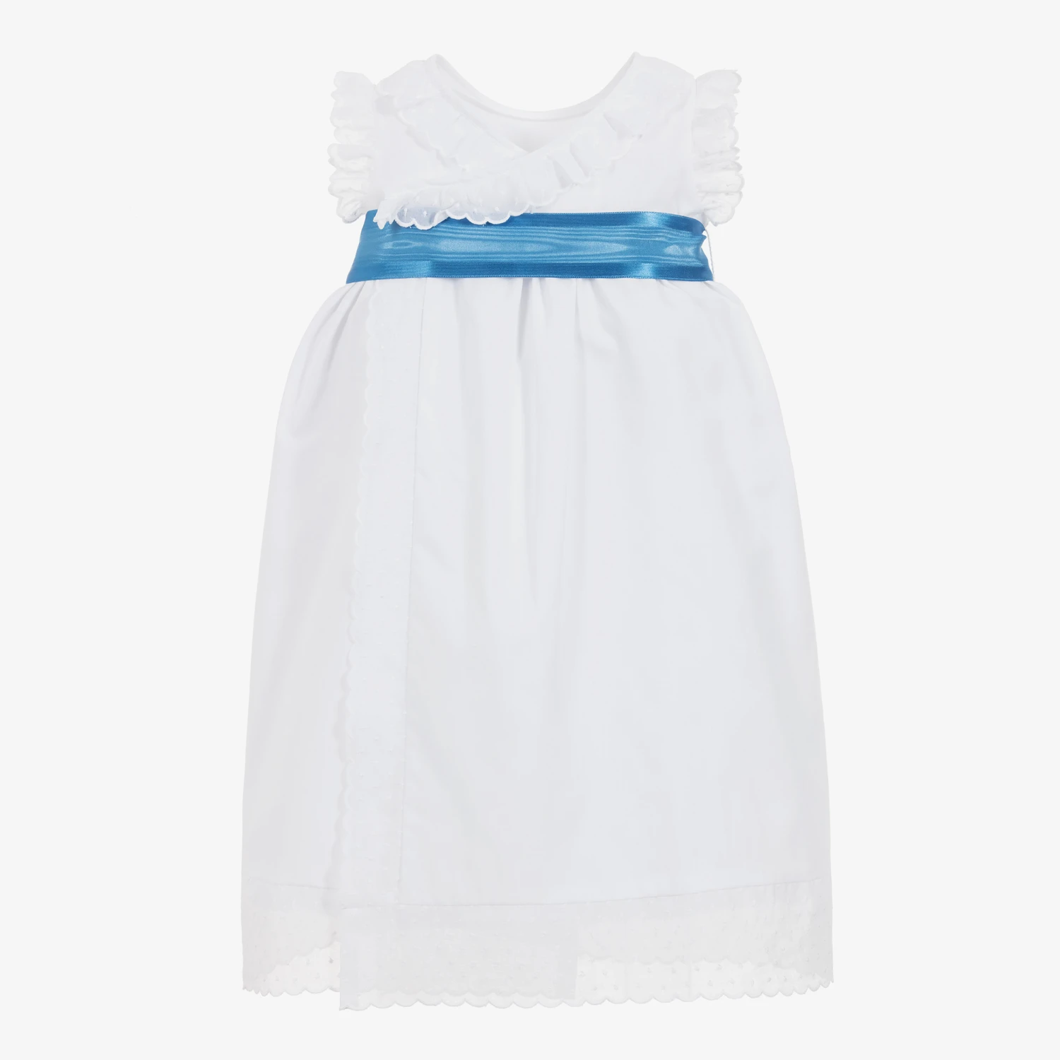 Beautiful white full length day gown by Ancar for newborn baby girls. It is made from a soft, lightweight cotton with delicate ruffles on the neckline and sleeves. Fully lined, it has a crossover button fastening at the back and detachable blue ribbon belt tied around the waist.