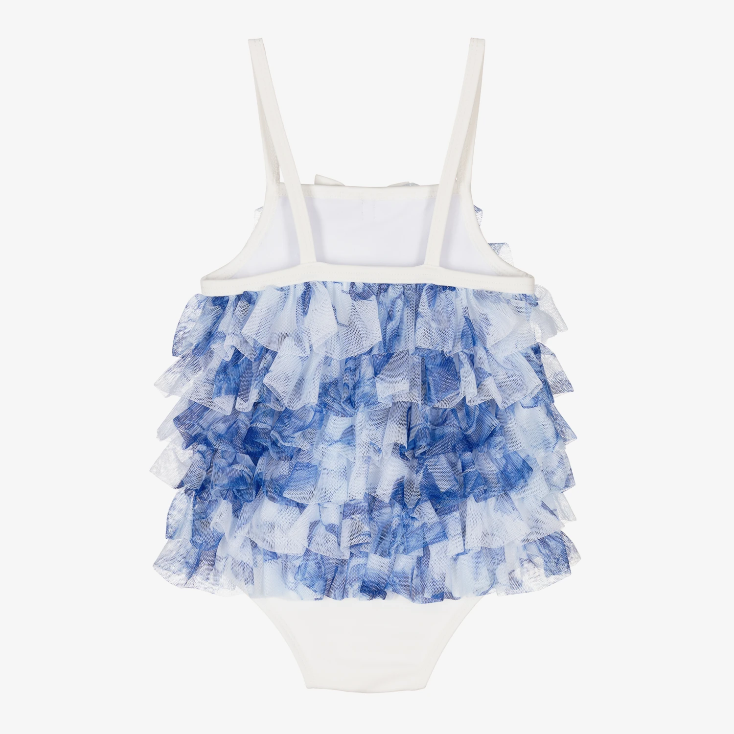 Lovely white and blue swimsuit for baby girls from British designer Angel’s Face. Decorating the silky, stretchy fabric are layers and ruffles of rose print tulle, with a pretty bow stitched on the front. It is fully lined for comfort and has popper fastenings between the legs for quick and easy dressing.