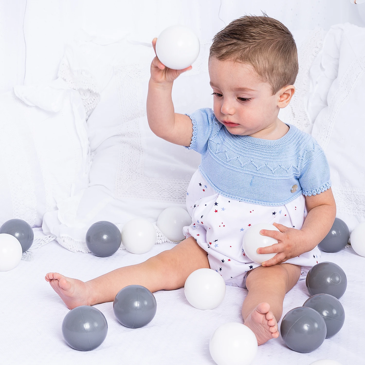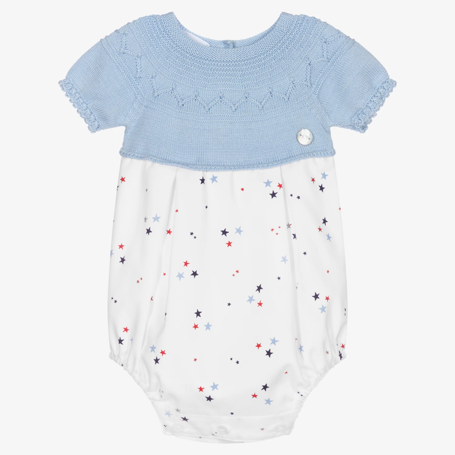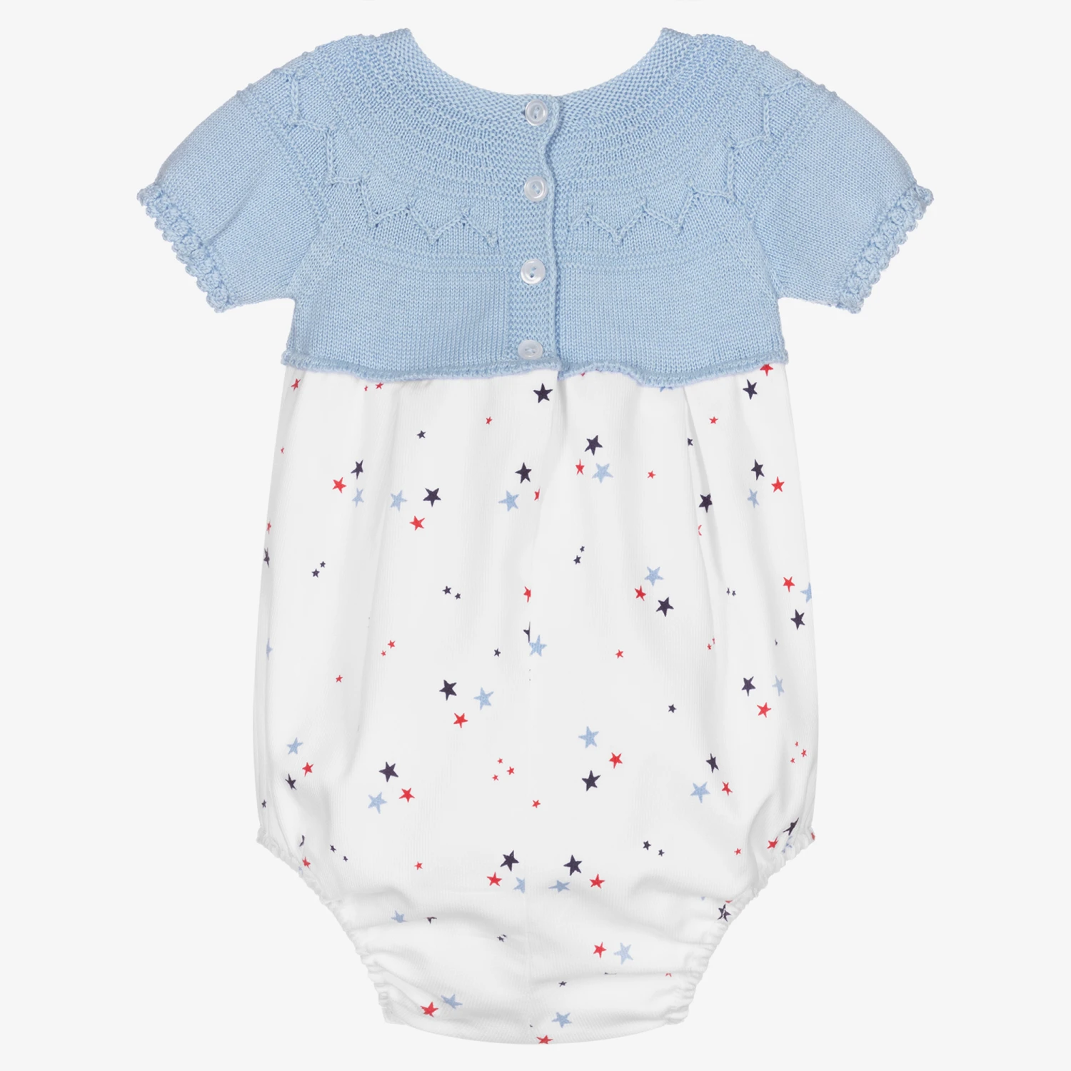Blue and white star print shortie for baby boys by Artesania Granlei, exclusive to Childrensalon. The top half is knitted in fine blue polycotton in an intricate pattern. The lower half is woven and has a blue and red star print and is fully lined. There are buttons to fasten between the legs and on the back.