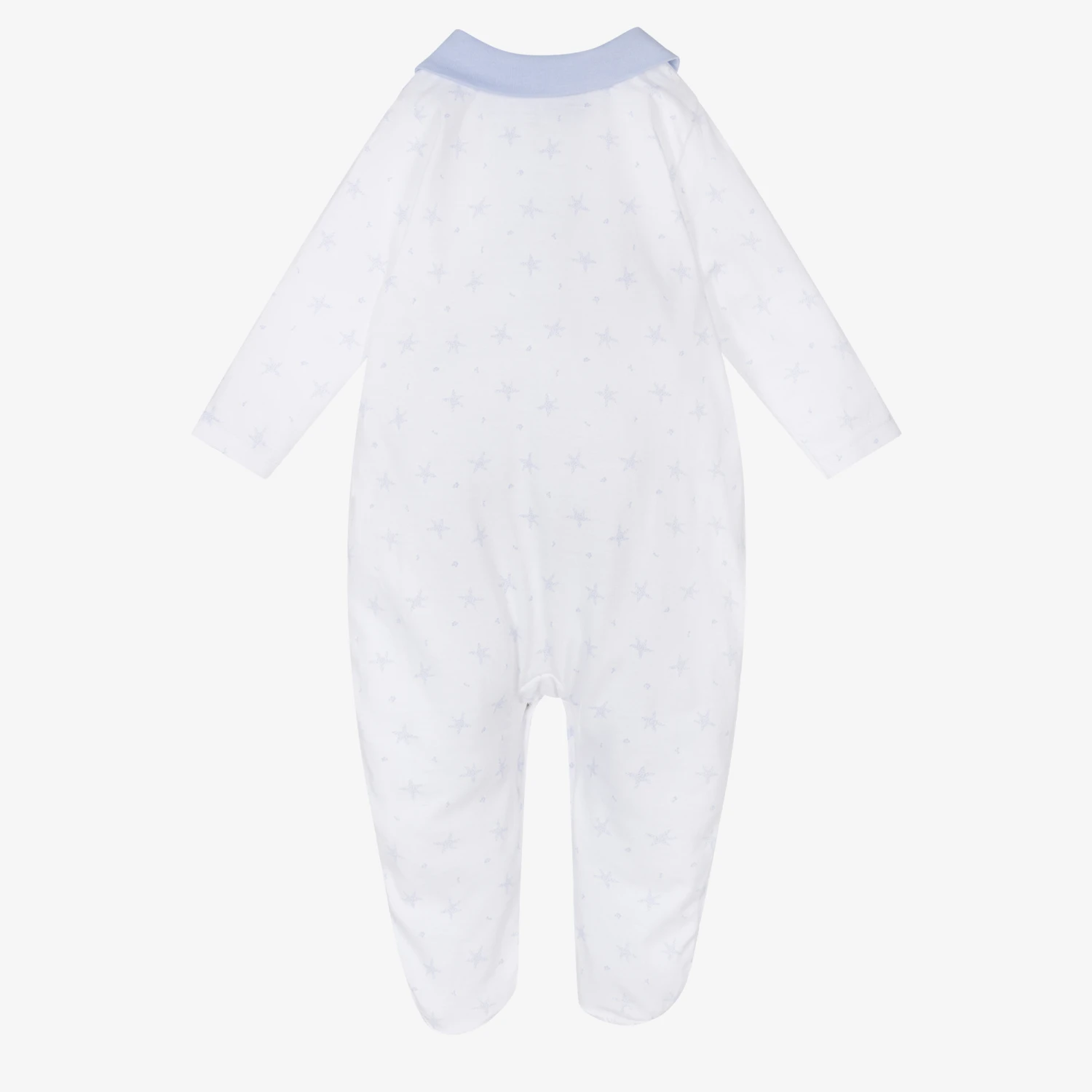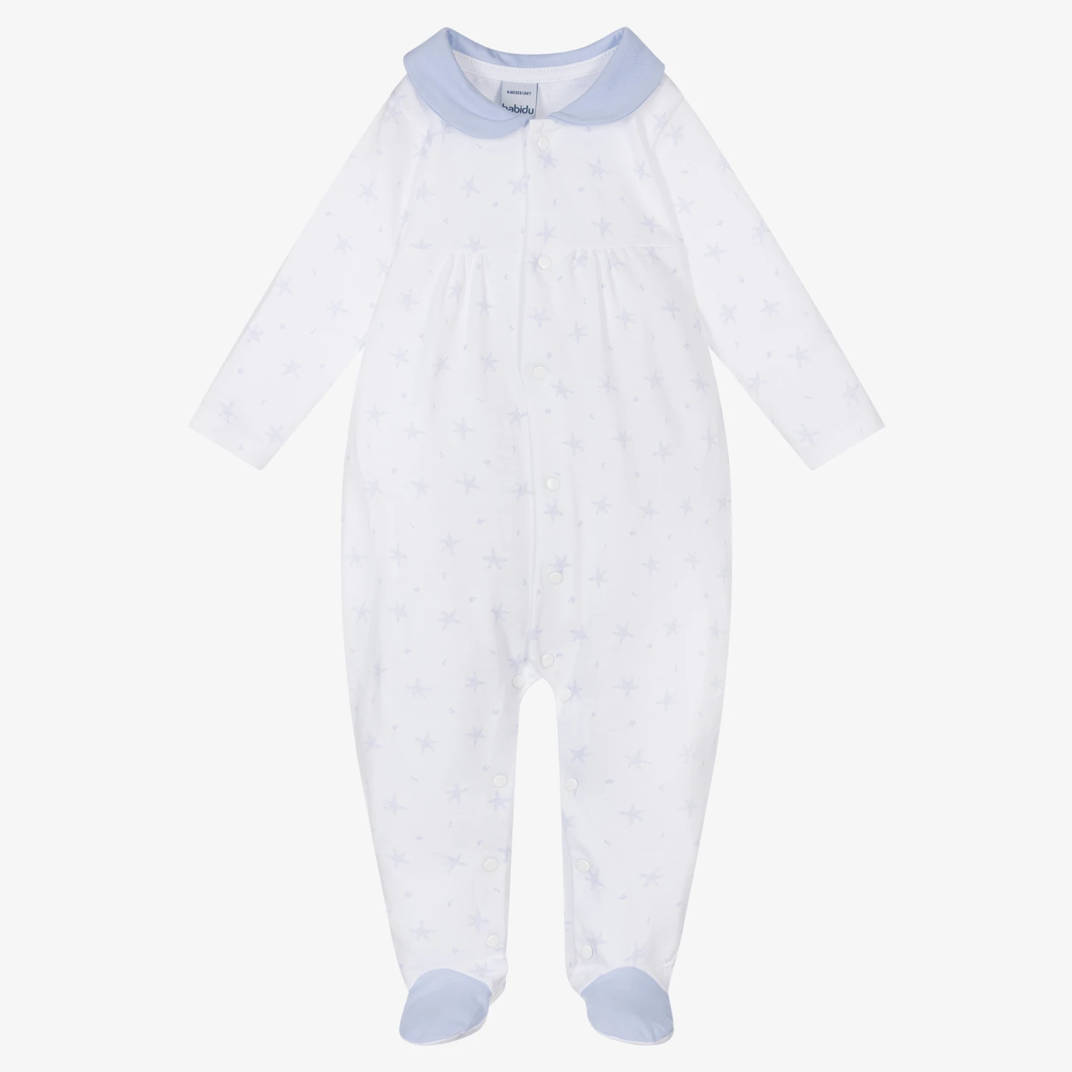 Adorable white babygrow for boys with pale blue spotty stars by Spanish designer Babidu. Made in soft and breathable cotton jersey, it has a cute peter pan collar with useful popper fastenings on the front and between the legs.