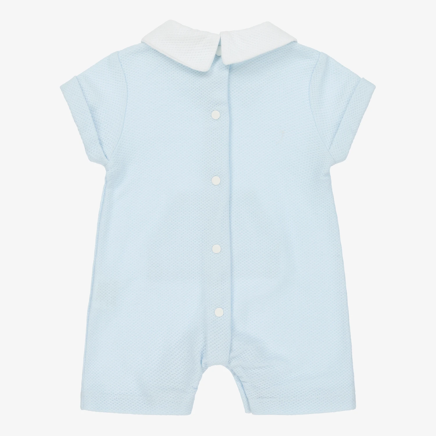 Pale blue and white shortie for baby boys by Babidu, made from soft cotton waffle jersey. Fastening with poppers on the back and between the legs, it has a cute pointed collar, an adorable front pouch pocket, and turned up sleeves.