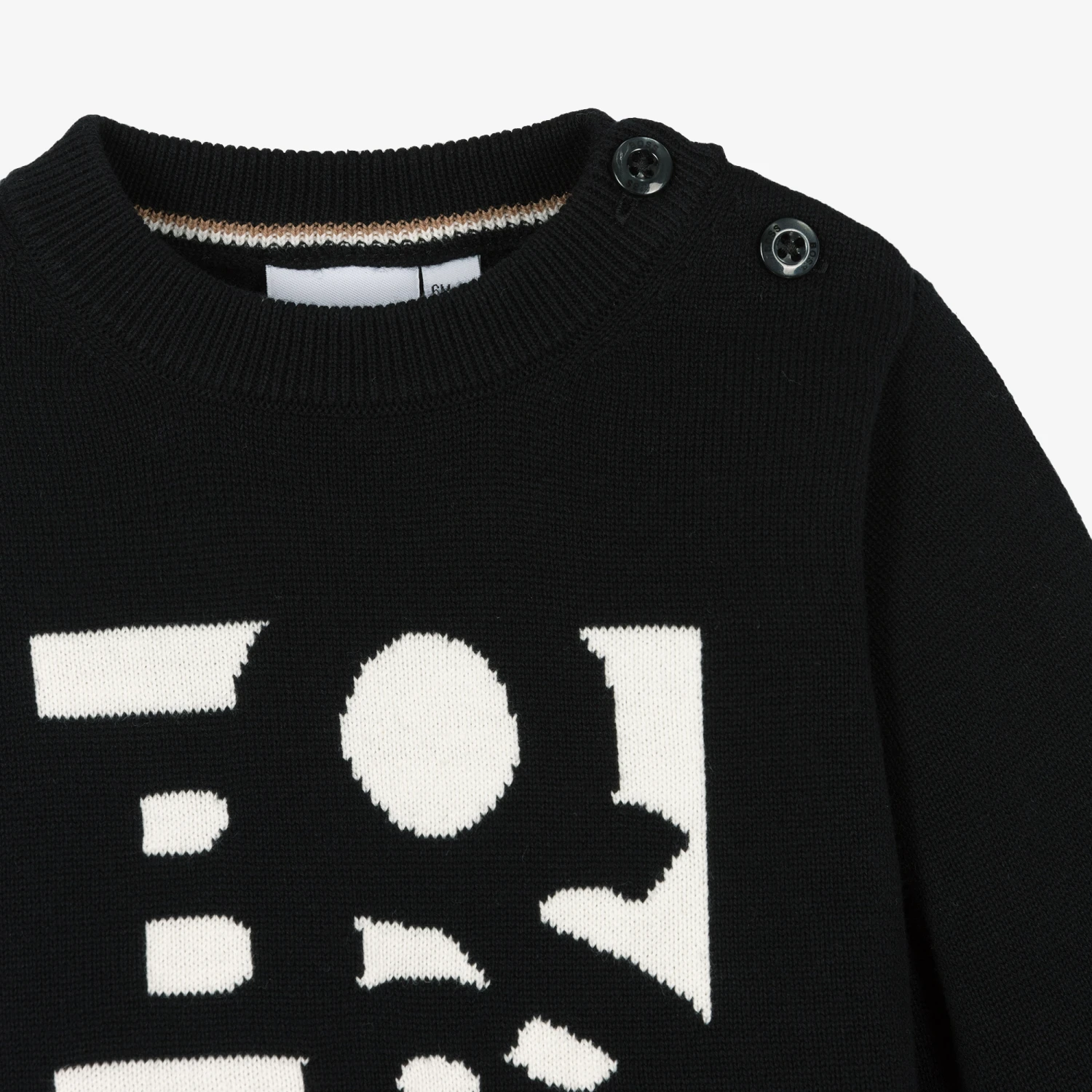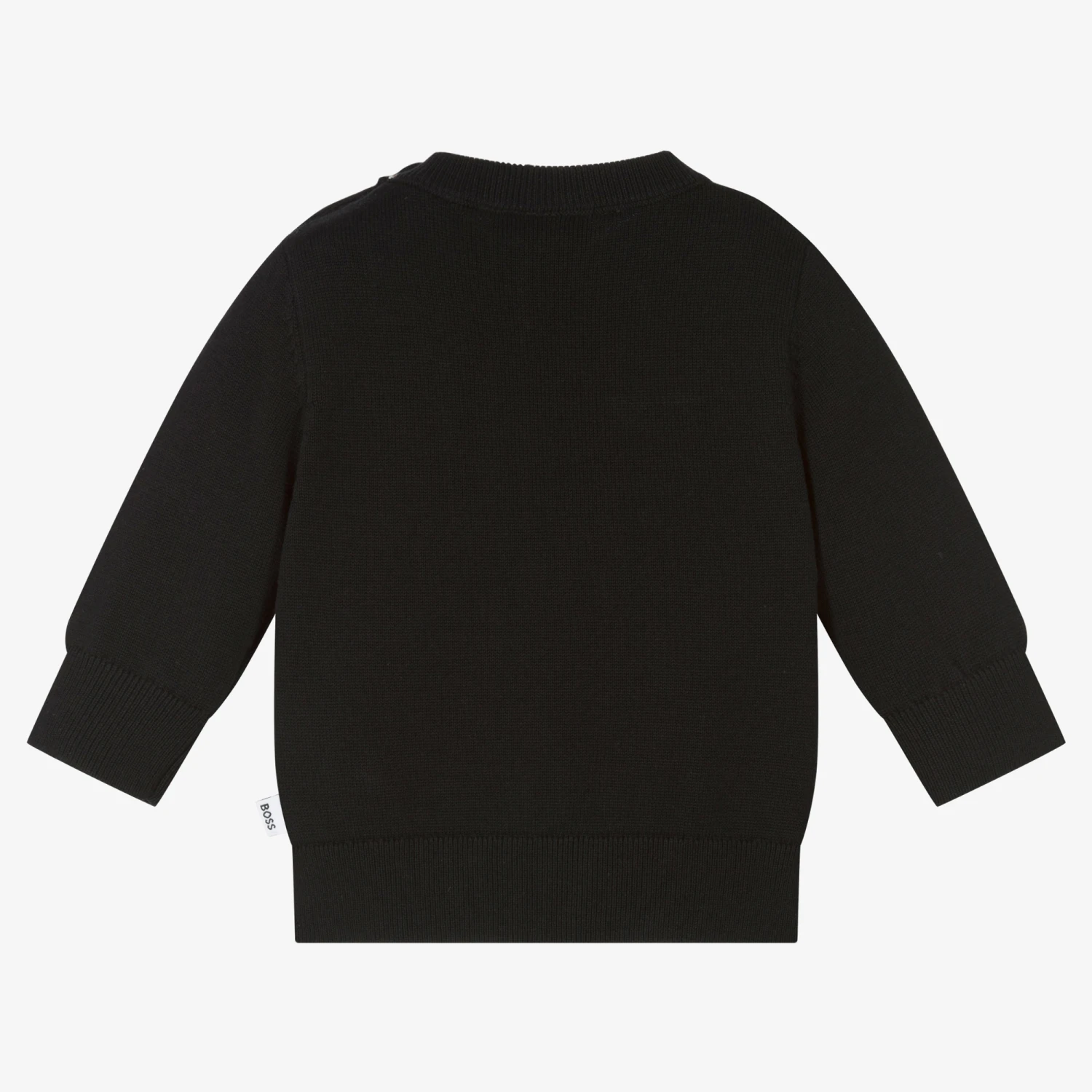 Black Mini-me jumper for baby boys by BOSS, with a bold white logo design on the front and a white logo tab on the side seam. It is knitted in comfortable, lightweight cotton with cosy ribbed trims and button fastenings on one shoulder for easy dressing.