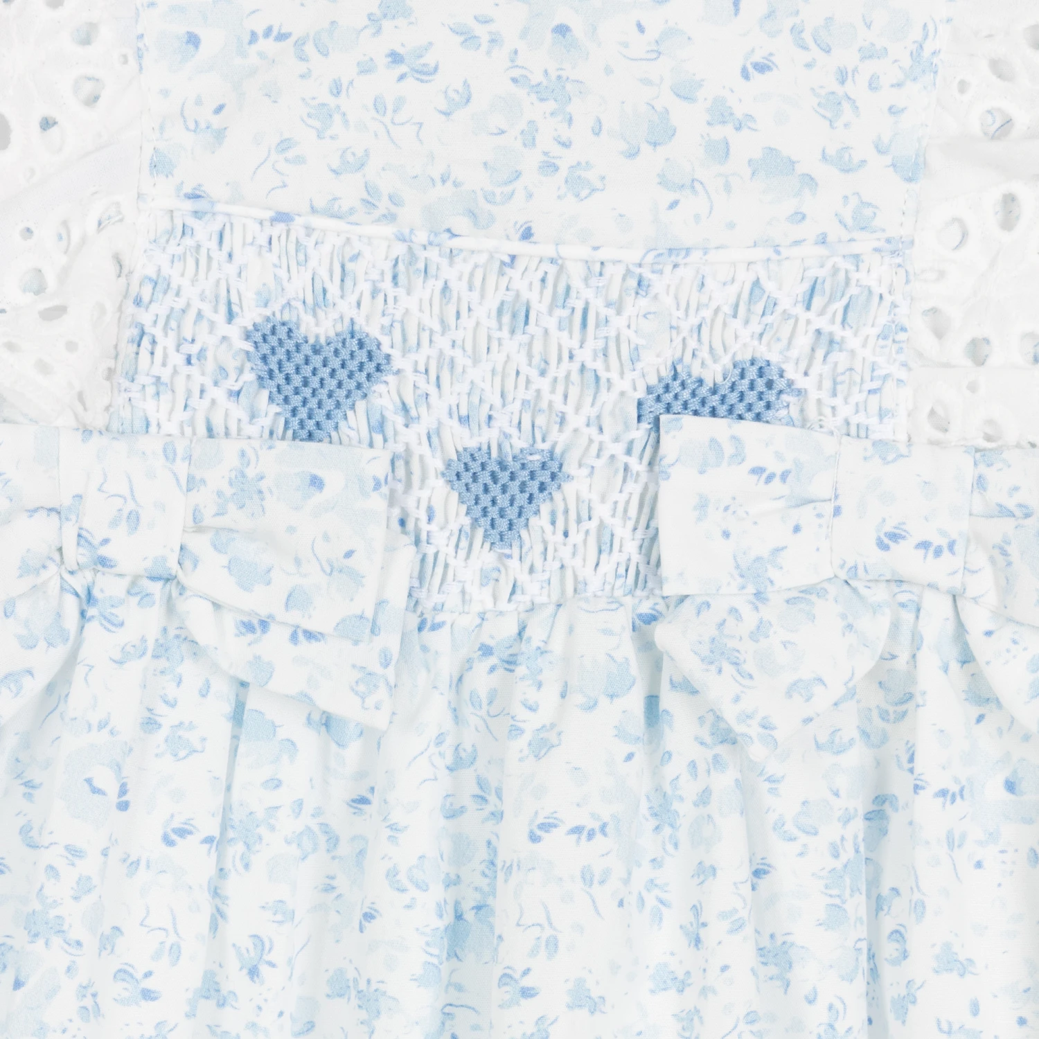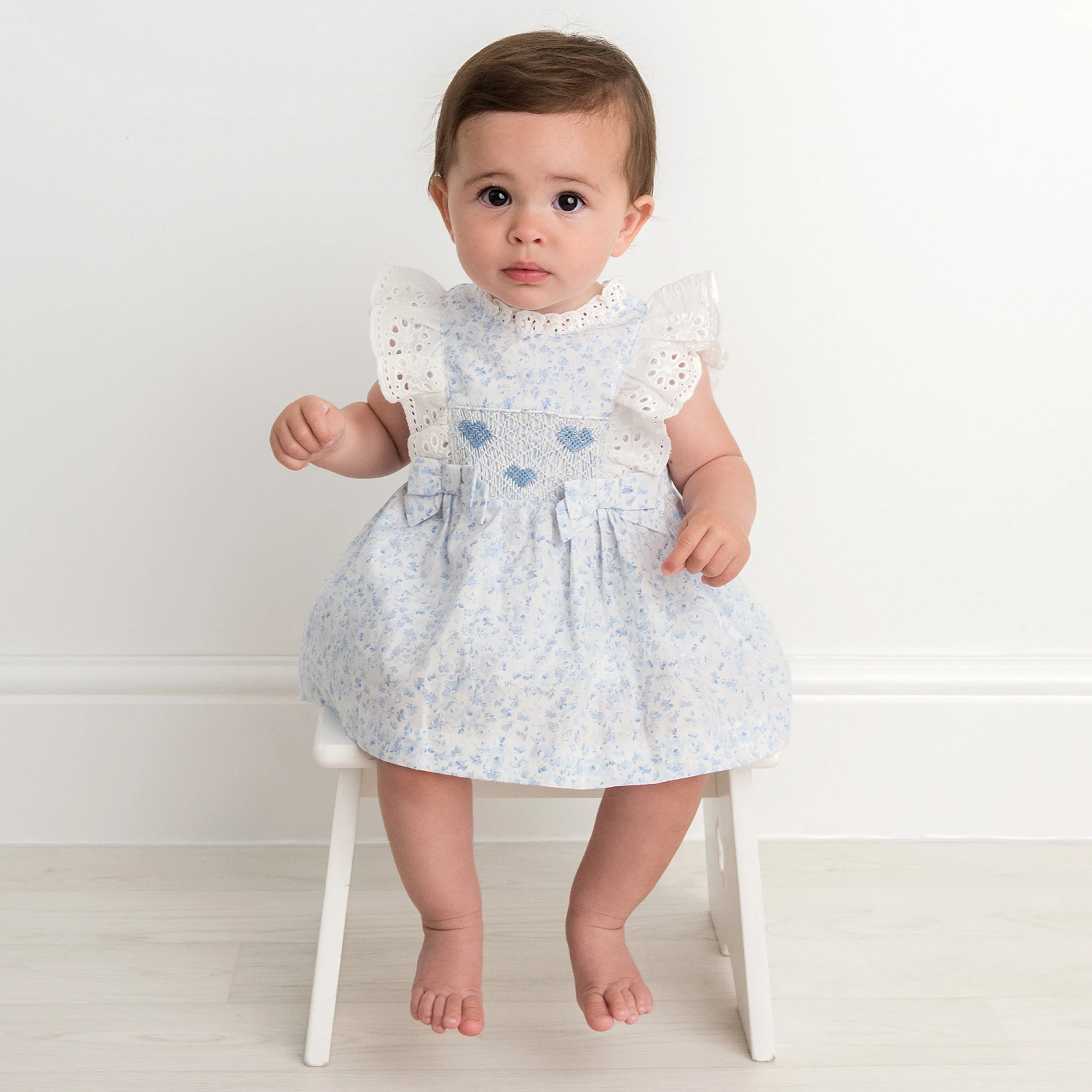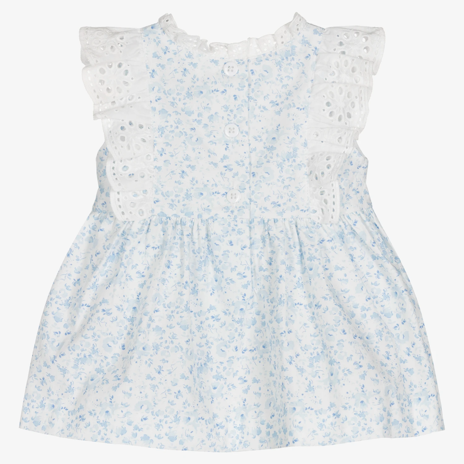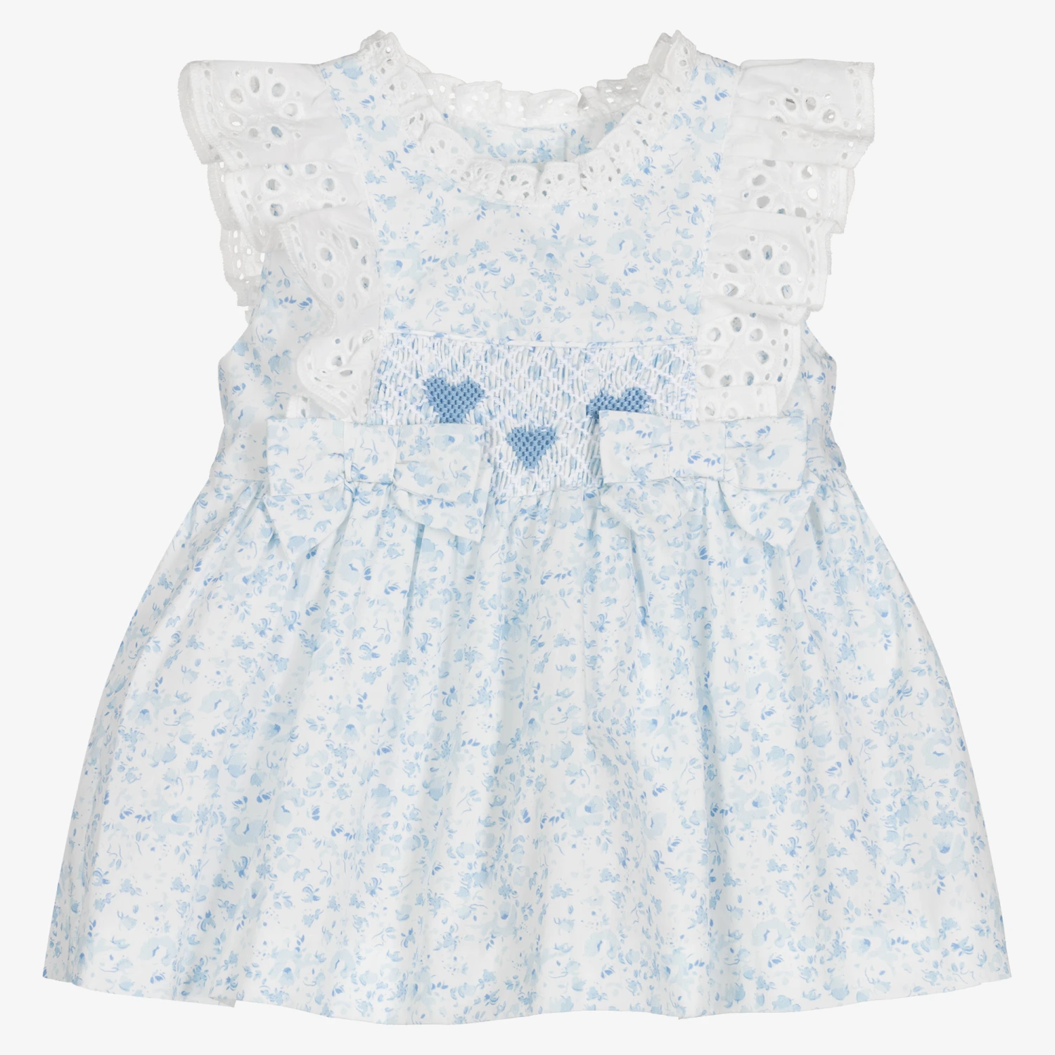 Patterned in a charming blue floral print, this white cotton dress for baby girls is by British brand Caramelo Kids. It has classic smocking detail, beautiful ivory broderie anglaise ruffles, and pretty bow trims. It fastens with buttons on the back. A pair of matching knickers completes this classic look.
