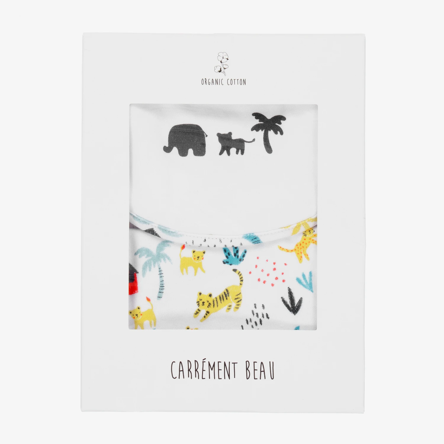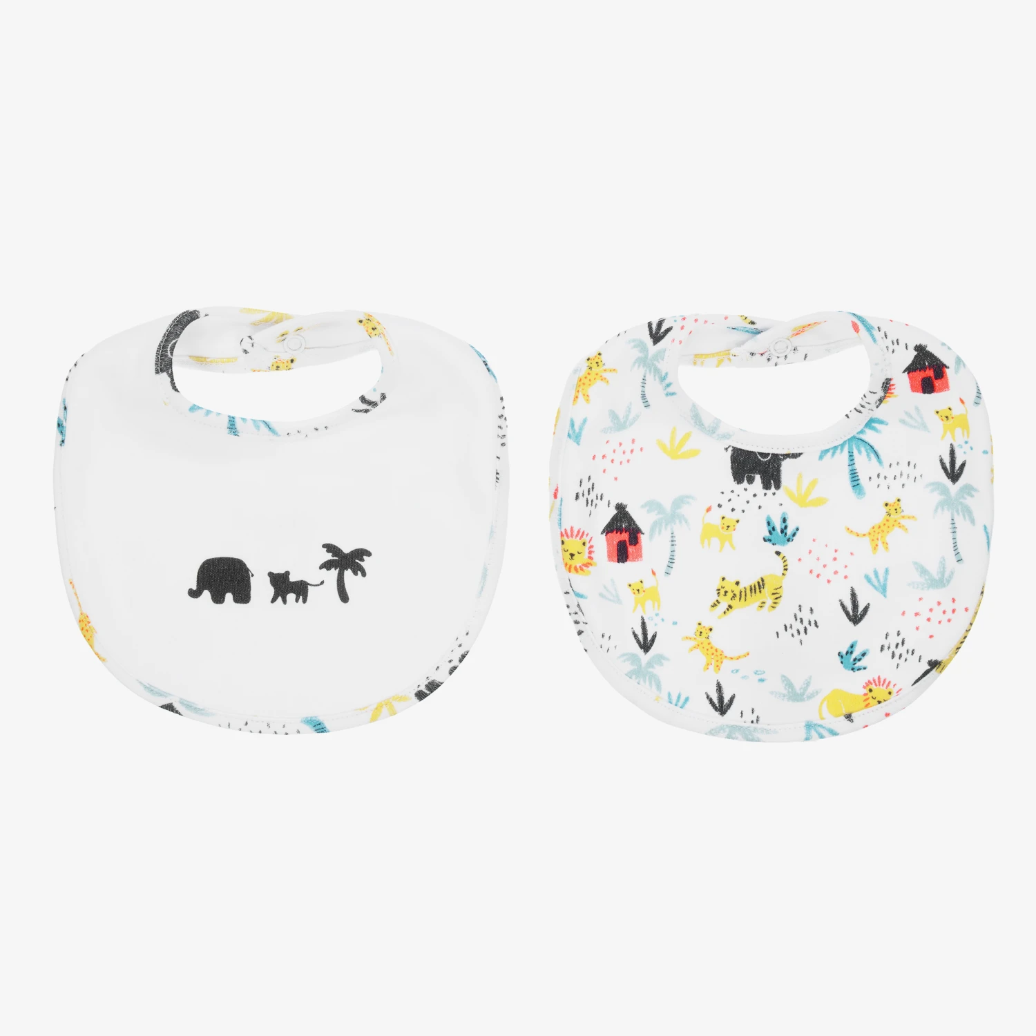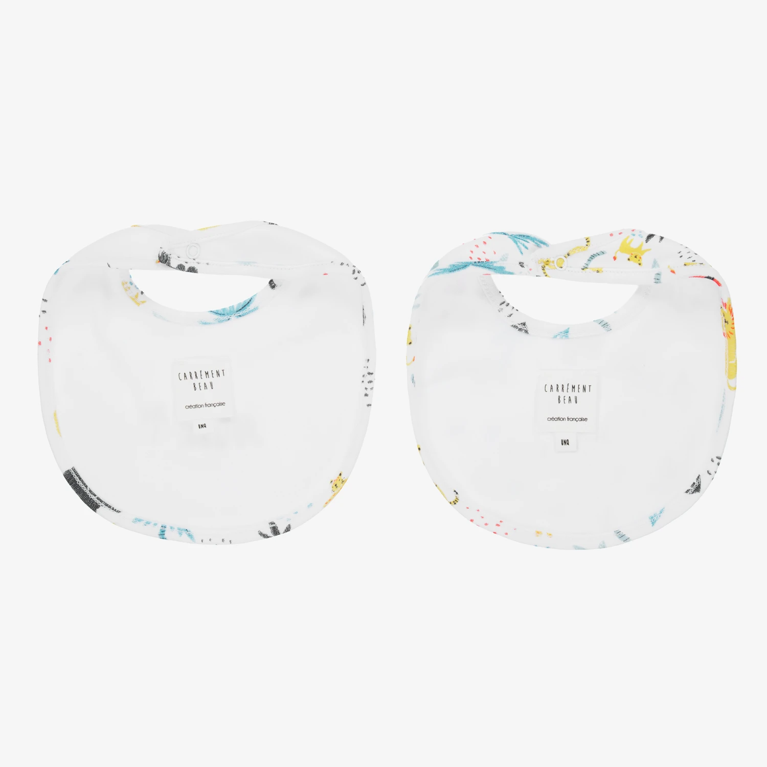 Pack of two bibs for baby boys by Carrément Beau, made in soft organic cotton jersey, with popper fastenings behind the neck. One bib is white with a black animal print on the front and the other has a colourful all over animal print.