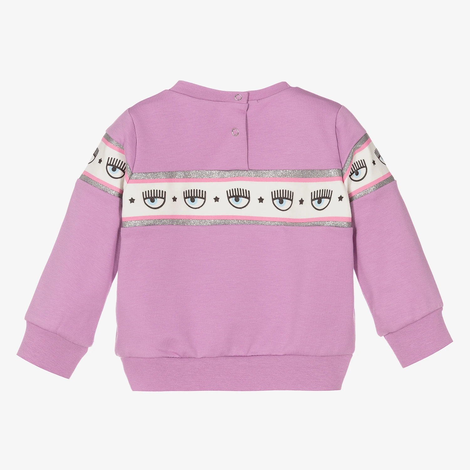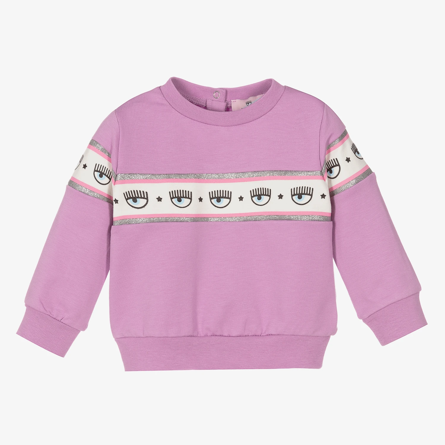Lilac purple sweatshirt for baby girls by Chiara Ferragni Kids. Made in soft, stretchy cotton jersey it is cool and comfortable to wear with the brand’s Logomania print around the top, bordered with silver glitter for a touch of sparkle. There are popper fastenings on the back for easy dressing.