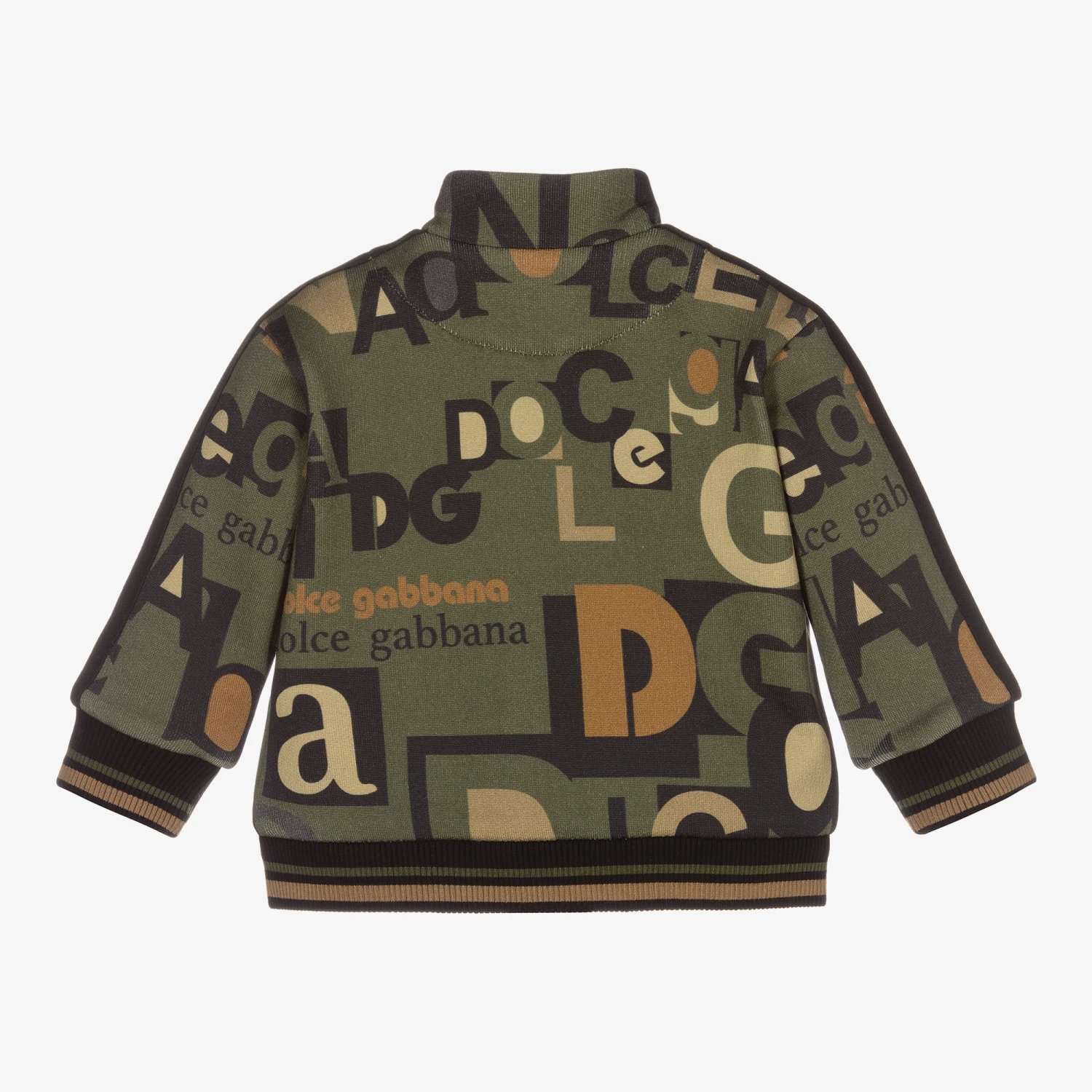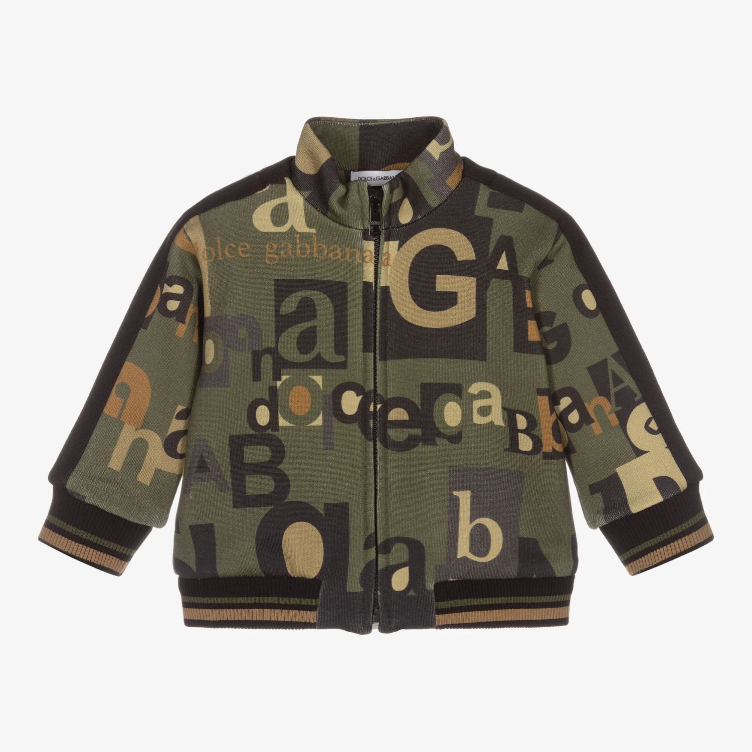 Green and black zip-up top for baby boys by luxury Italian designer Dolce & Gabbana, directly inspired by the adult collection. Made in soft cotton sweatshirt jersey, it has a beige and black repeat spell-out logo print all-over, and sporty ribbed trims.