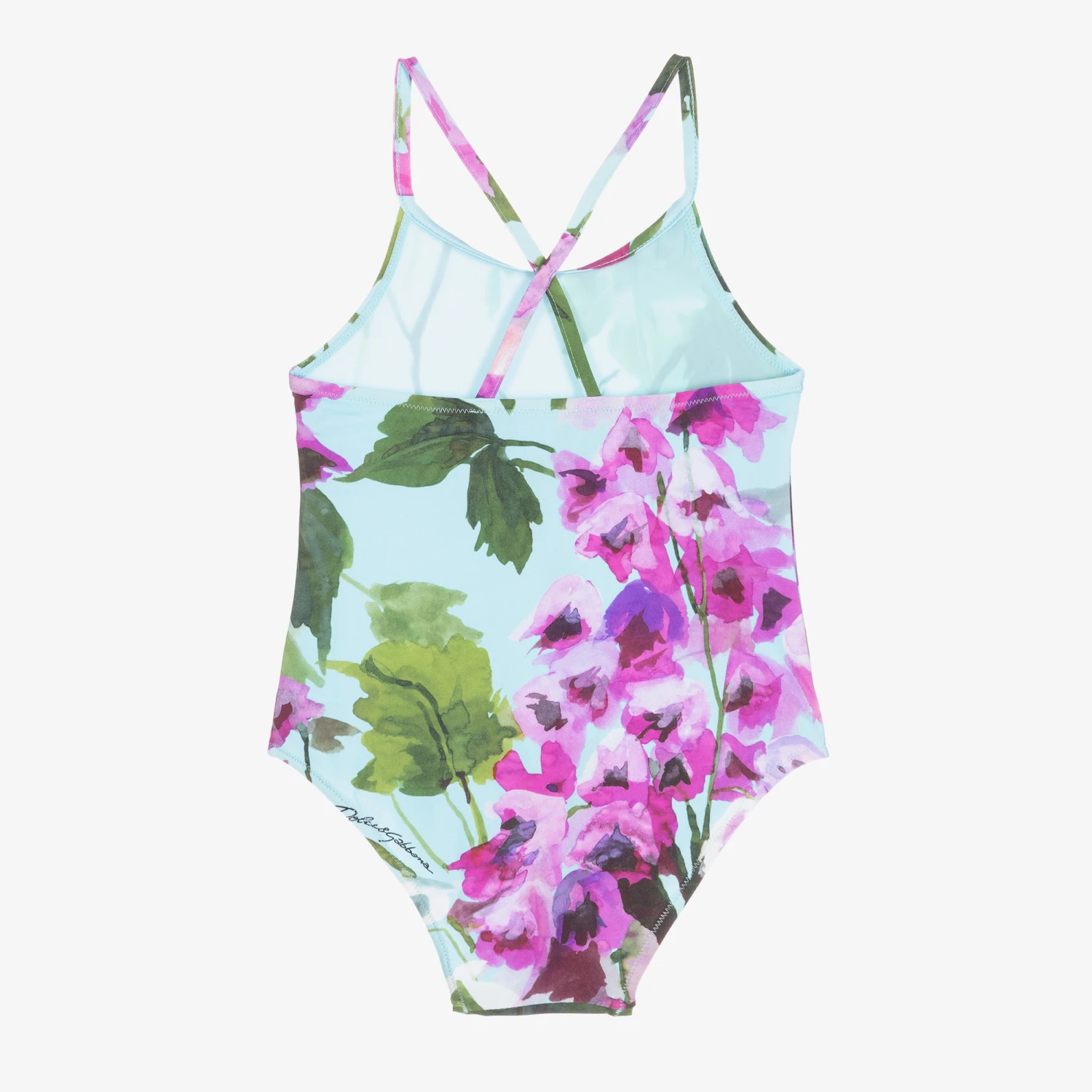 Baby girls blue bellflower swimsuit by luxury brand, Dolce & Gabbana. Silky and stretchy, the fabric has a pretty floral print and a DG gold logo badge stitched at the side. There are cross-over straps on the back.