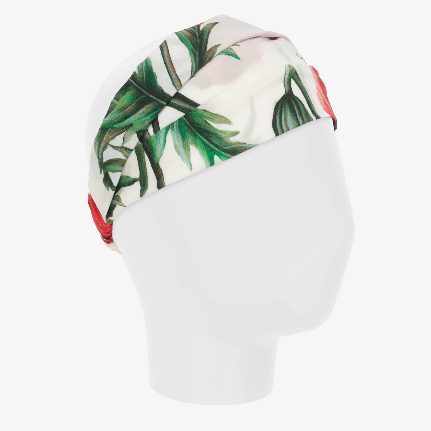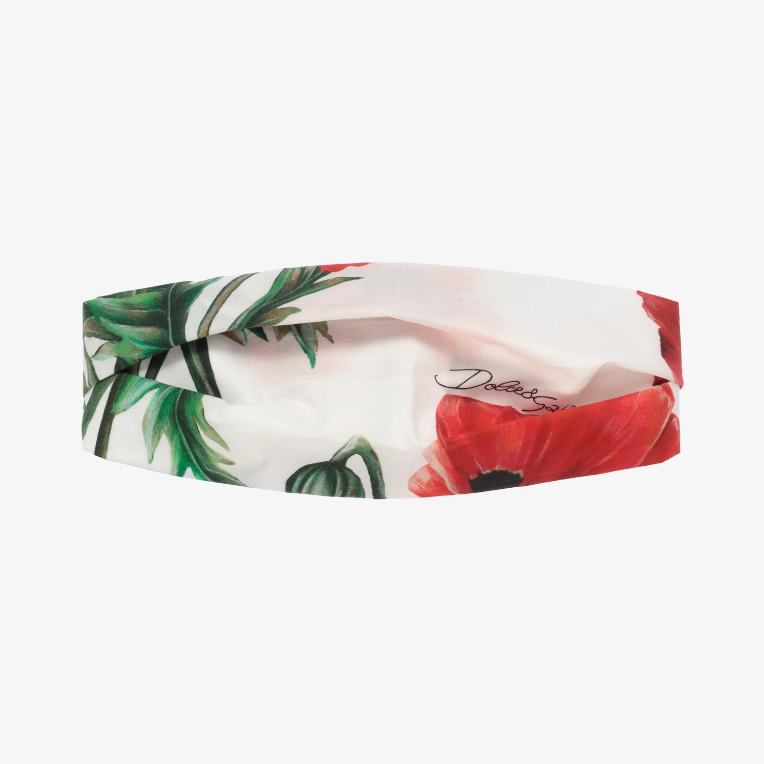 A gorgeous white cotton poplin headband for baby girls from luxury Italian designer Dolce & Gabbana. Intensely romantic, it is patterned with red and green poppy print. It is wide at the top with gathered sides and an elasticated panel on the back for a comfortable fit.