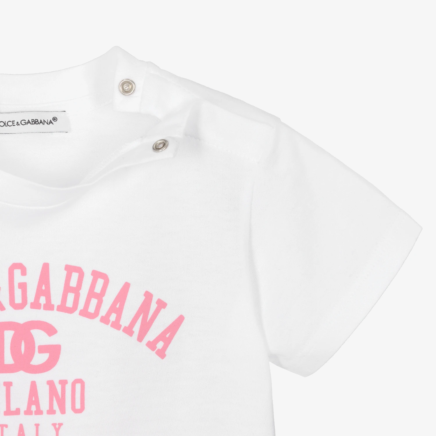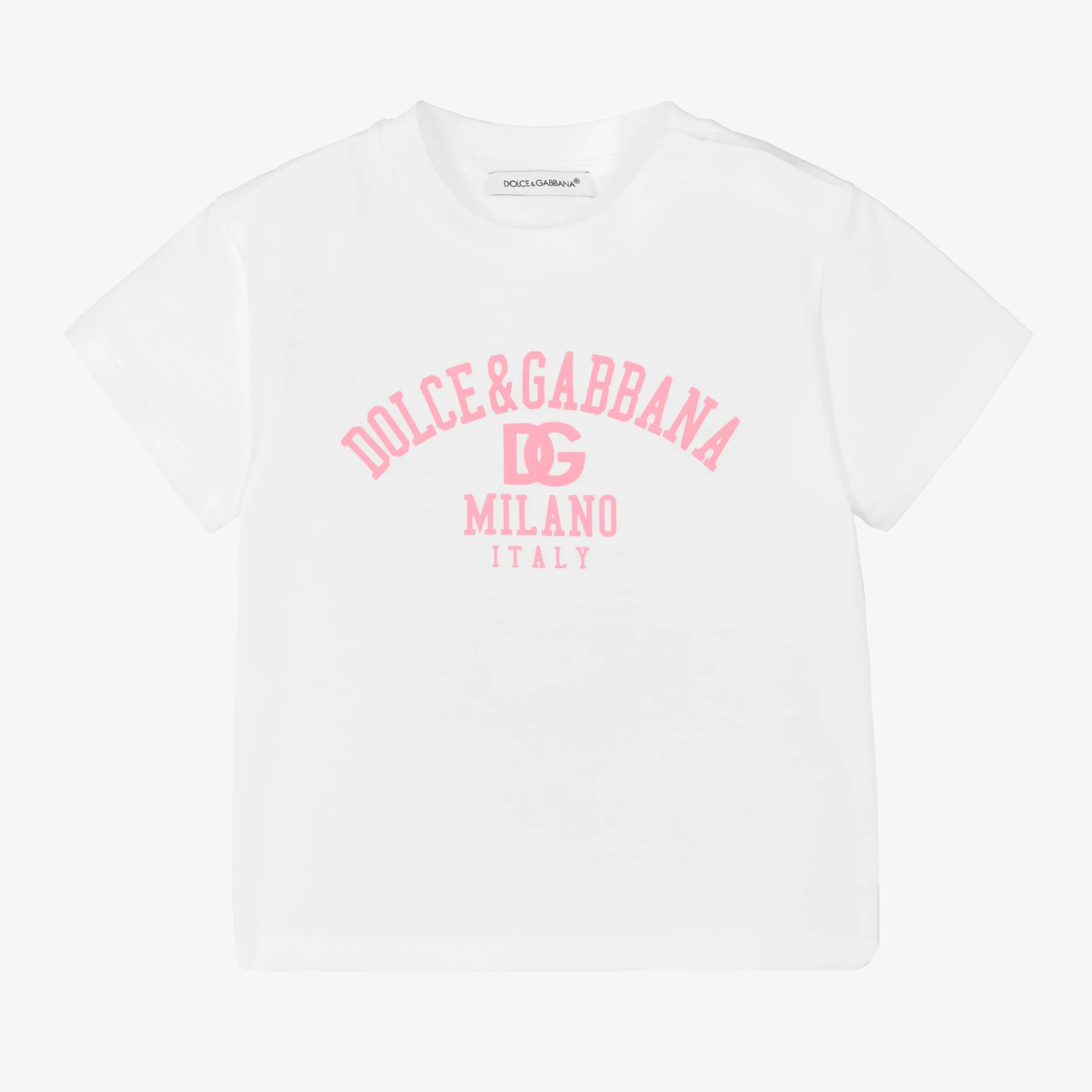 A white logo T-shirt for baby girls by luxury Italian brand Dolce & Gabbana, made in soft cotton jersey. This cool crew neck tee will elevate everyday casual look with the pink logo print on the front.