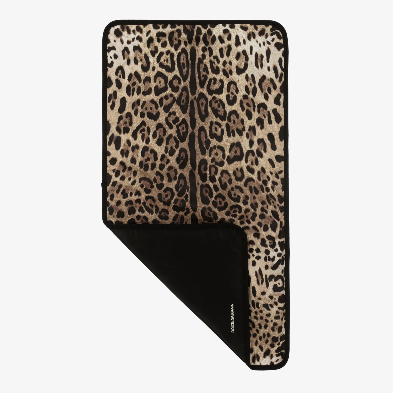 From luxury brand Dolce & Gabbana, beige and black leopard print changing bag with a metal logo tile on the front. Made in durable nylon it has a large main compartment which fastens with a zip for added security, two pouch pockets on the outside and three smaller internal pockets for easy organisation. It has carry handles and an adjustable, detachable shoulder strap for easier use. For added convenience, it comes with a matching changing mat.