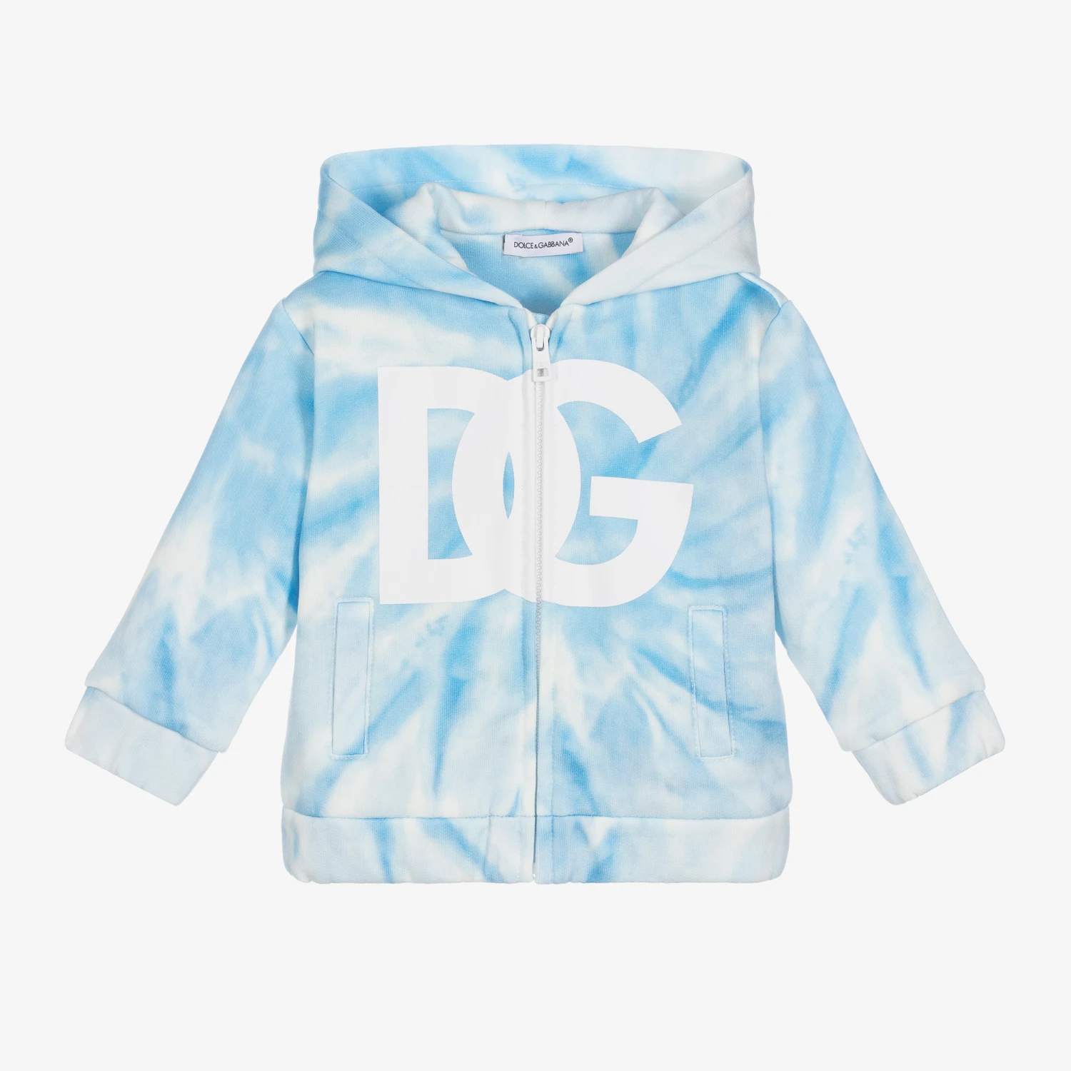 A jersey zip-up top for little boys from Italian label Dolce & Gabbana, comfortable in soft blue and white cotton. This cool hoodie, characterised by its ’60s tie-dye-effect print, is sure to stand out with its free-spirited style. A white Crossover DG logo is stamped on the front and the easy-fastening zip is engraved with the luxury brand’s name for designer recognition.