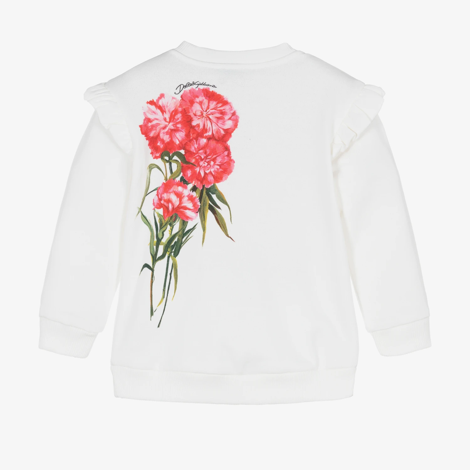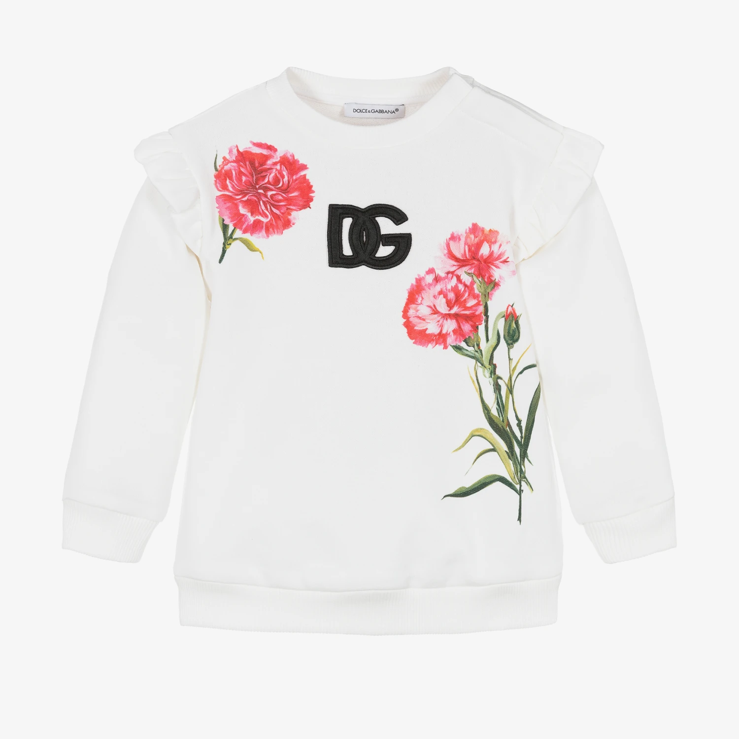 Beautiful white sweatshirt for baby girls by luxury Italian designer, Dolce & Gabbana. On the front, it has the instantly recognisable black DG logo appliqué, with eye-catching pink and green carnation prints on the front and back, inspired by the main collection. Made in soft cotton sweatshirt jersey, this classic top is detailed with ruffles on the shoulders for a feminine finish.
