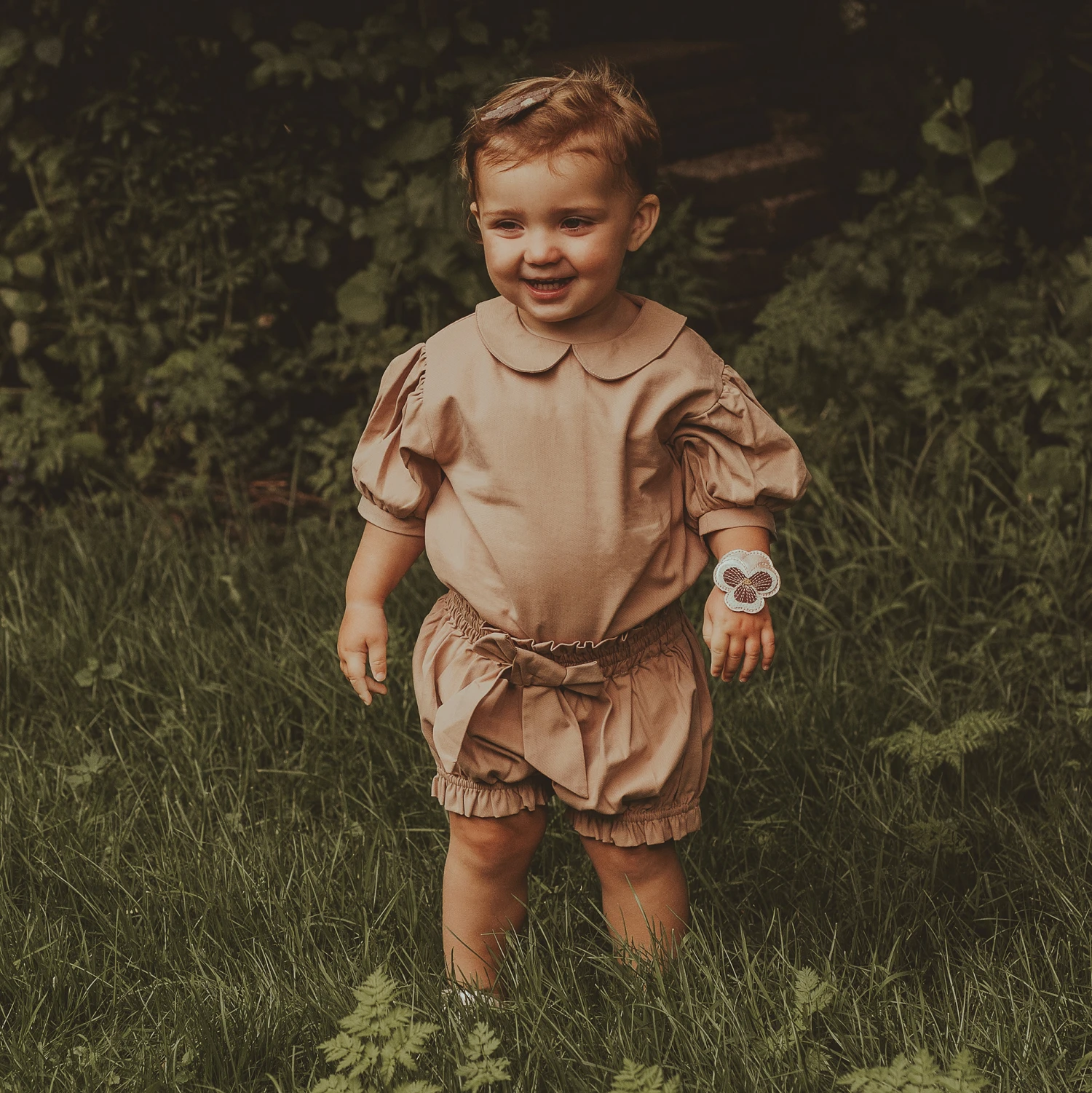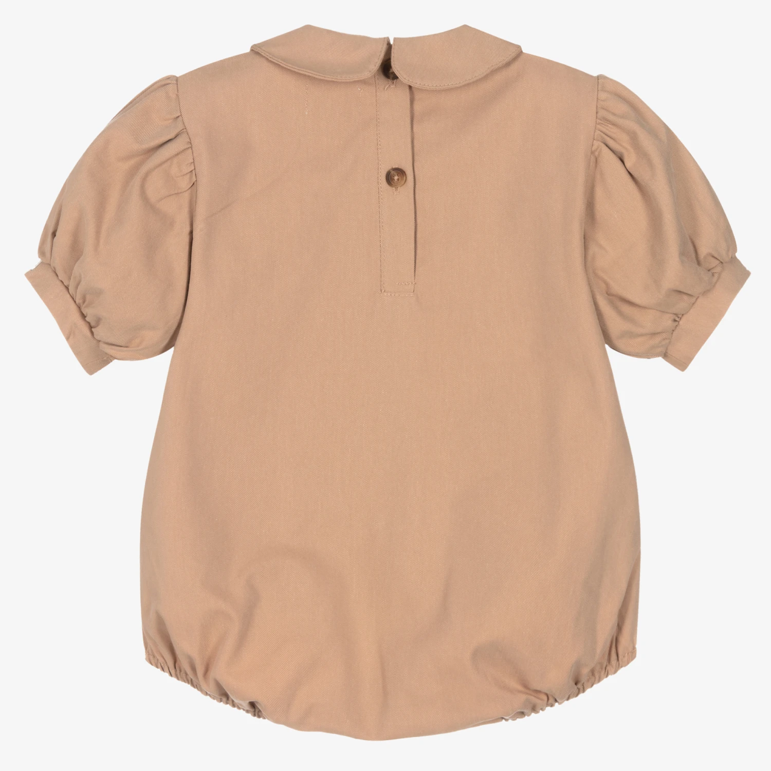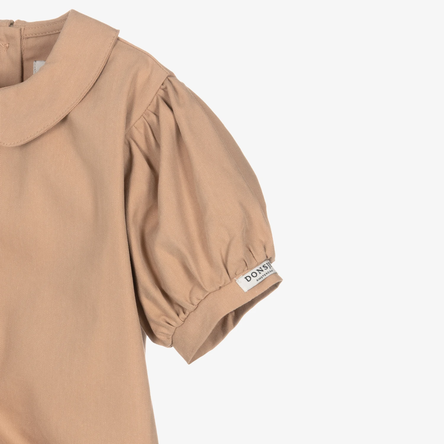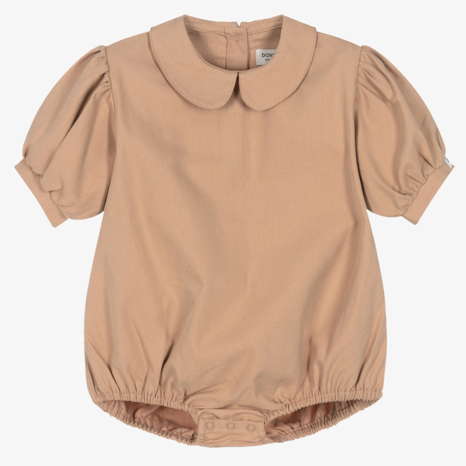 Beautifully handmade by Dutch brand Donsje, this shortie for baby girls is in a lovely muted pink-brown shade. A cute and stylish design, it is made in soft cotton and viscose blend twill, with a sweet rounded collar and full puffed sleeves. There are button fastenings on the back, easy popper fastenings underneath, and the leg cuffs are gently elasticated for comfortable wear. For a discreet designer finish, there is an embroidered logo label on one cuff.