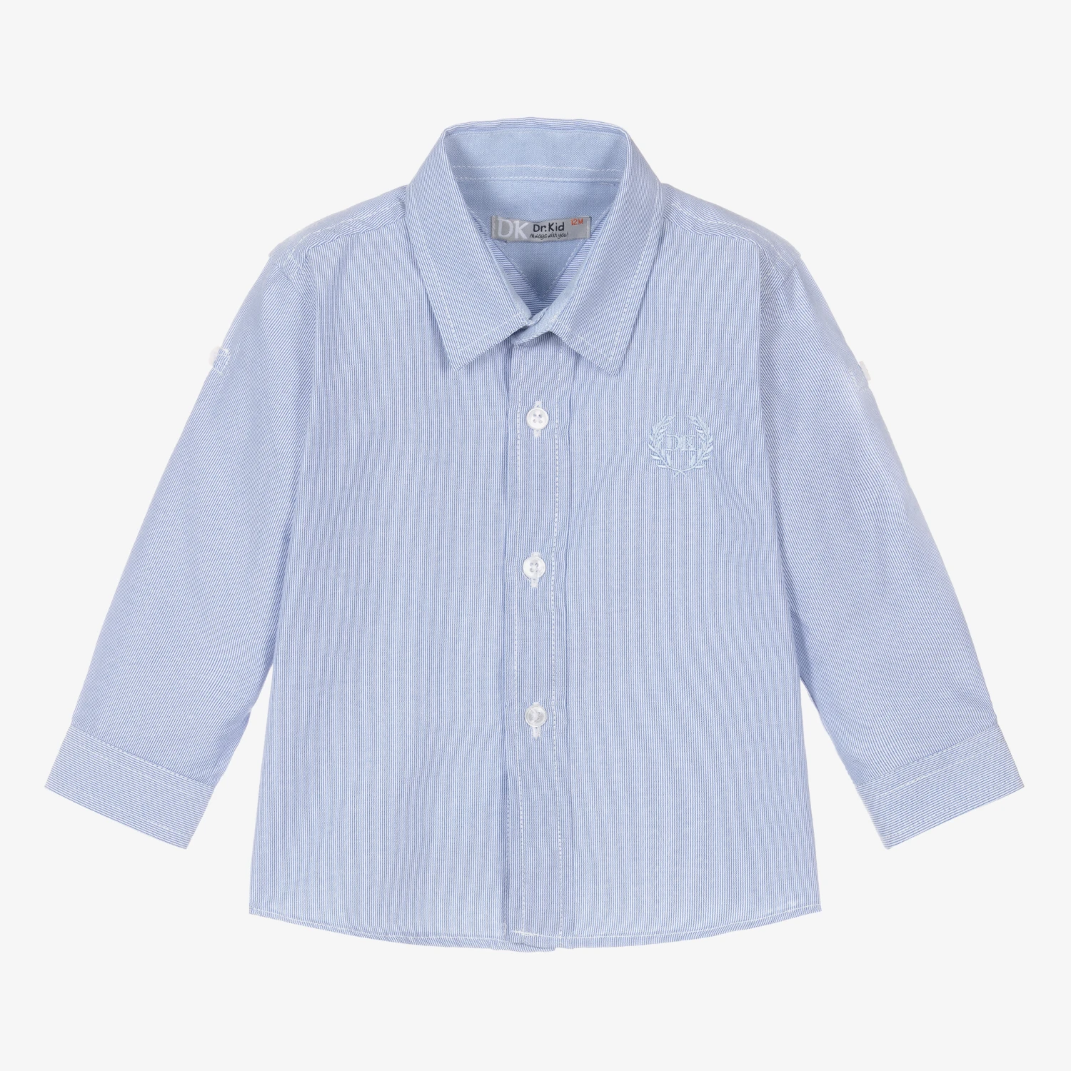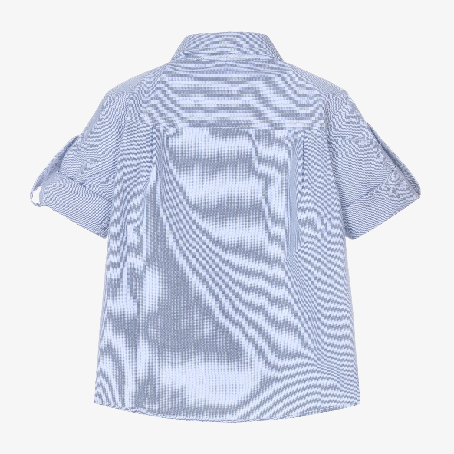 Both smart and casual, this versatile, blue and white stripe shirt for little boys is by Dr. Kid. Made in soft and lightweight cotton, it has a smart pointed collar, an embroidered logo on the chest, and button fastenings on the front. The sleeves can be rolled up, securing with buttons, for a cool, relaxed style.