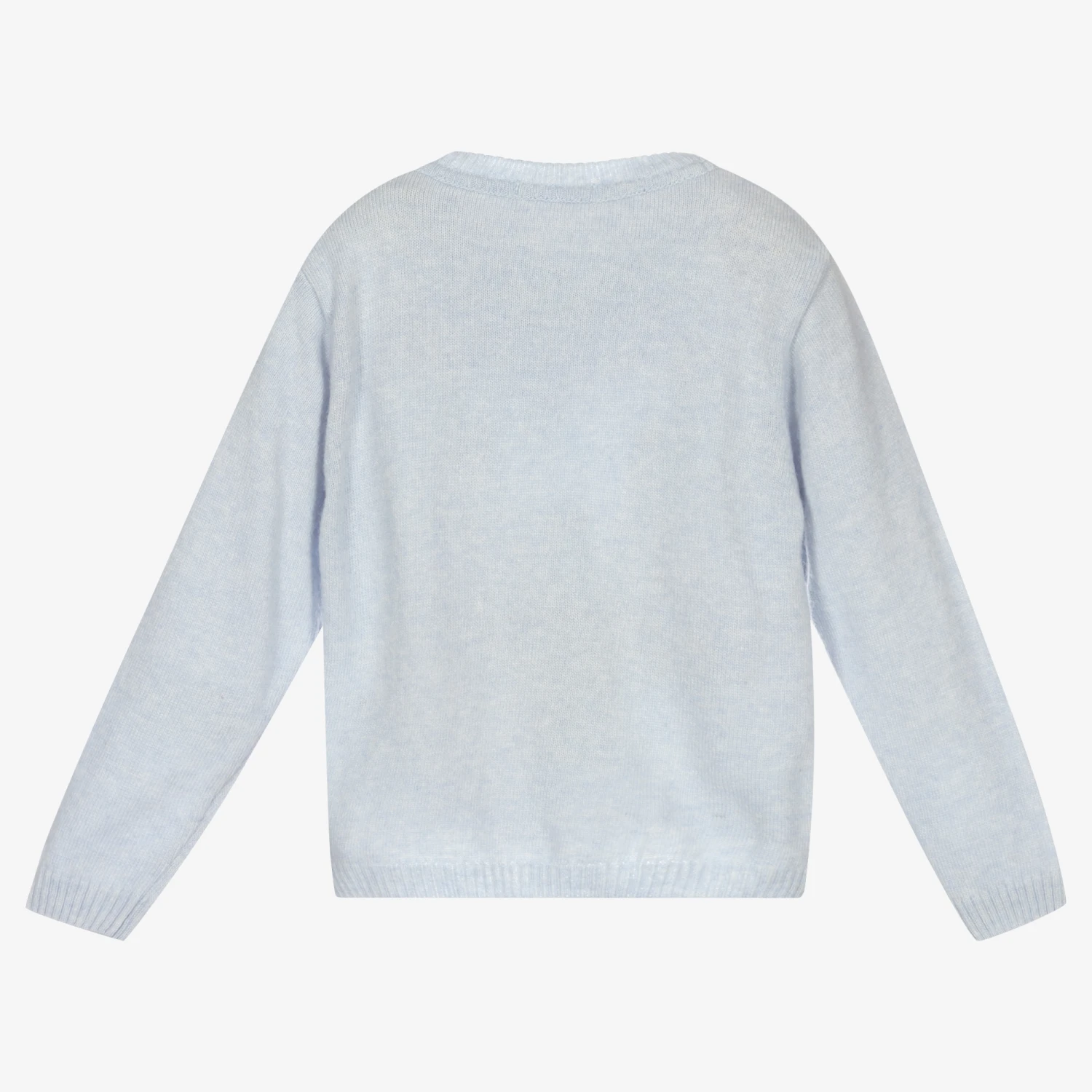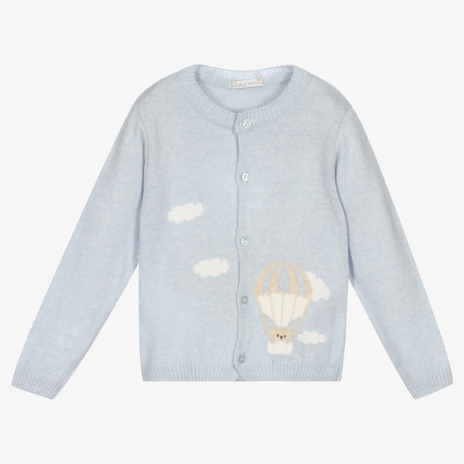 Baby boys pale blue cardigan from Dr. Kid, knitted in a soft wool, cashmere and viscose blend. It has an adorable bear in a hot air balloon design on the front.