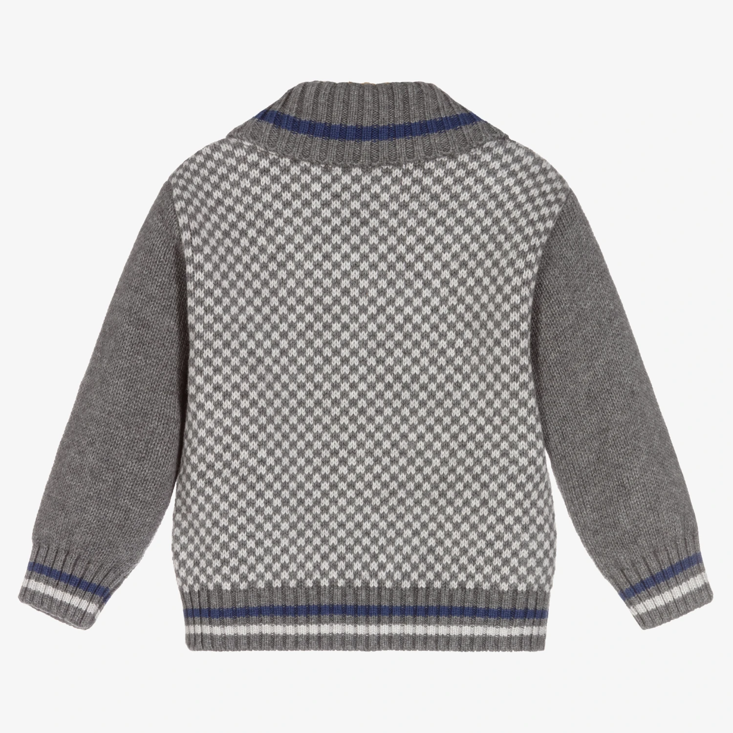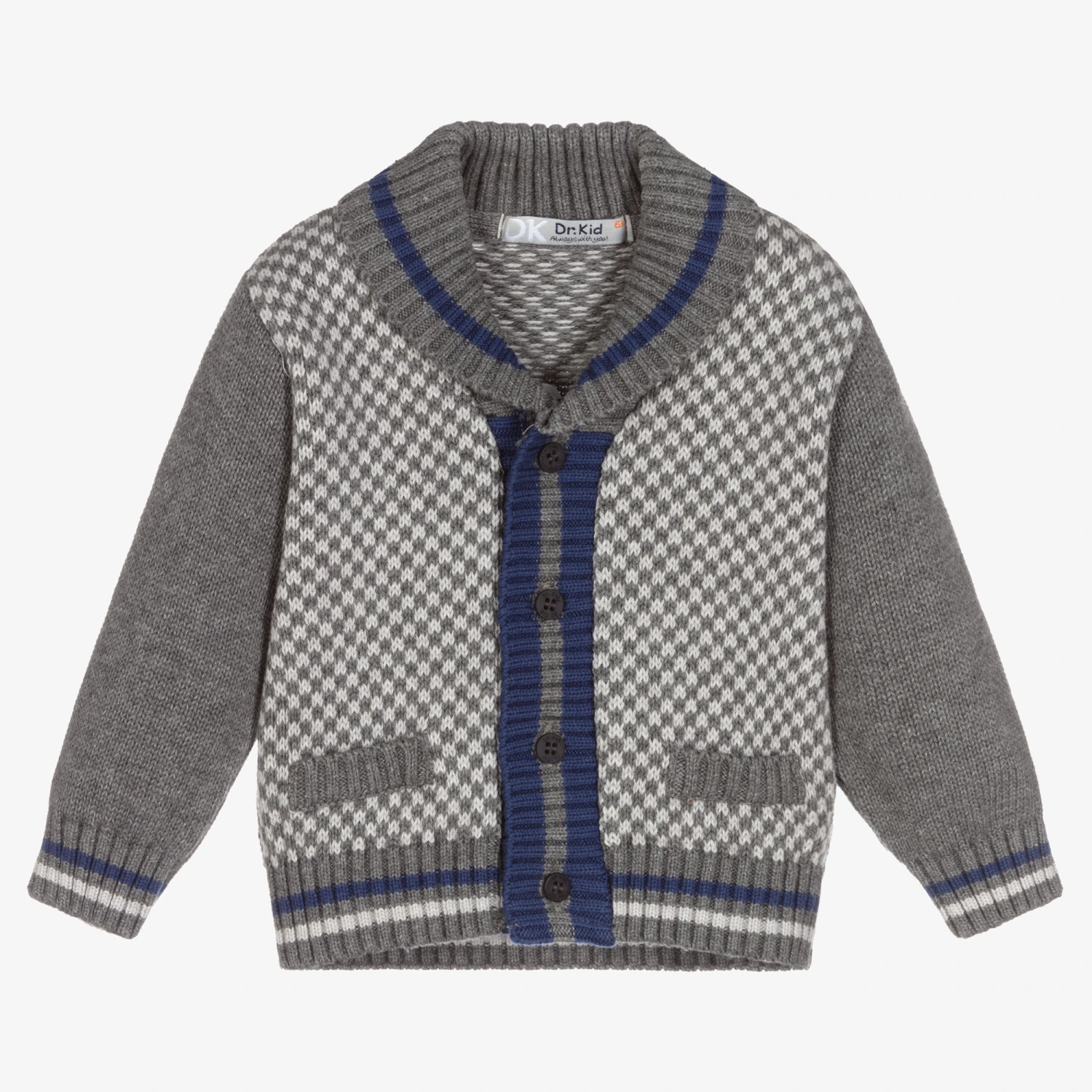 Baby boys grey cardigan from Dr. Kid, with a white checked pattern on the body. Knitted in a soft cotton and wool blend, it has a ribbed shawl collar, faux pockets and navy blue striped trim.