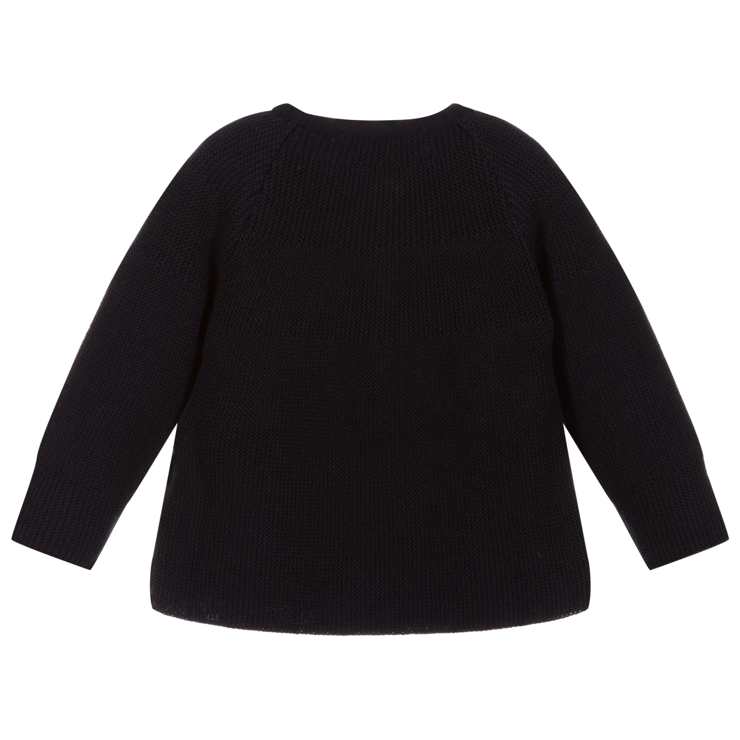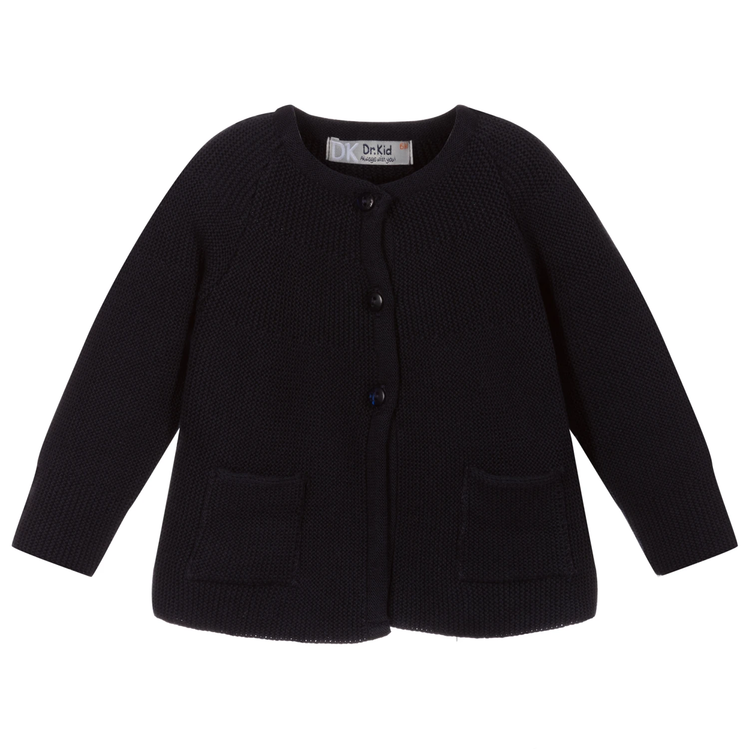 Baby girls navy blue cardigan by Dr. Kid, in a soft cotton knit. It has a textured garter stitch pattern, patch pockets on the front and branded button fastenings.