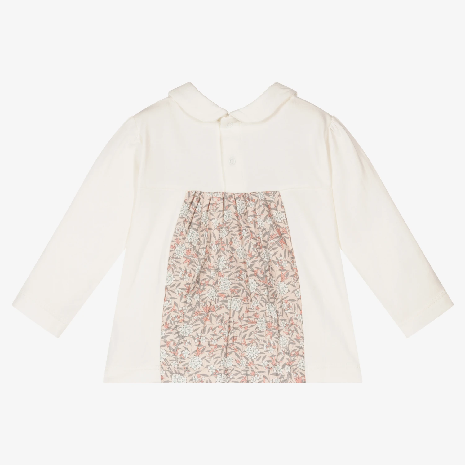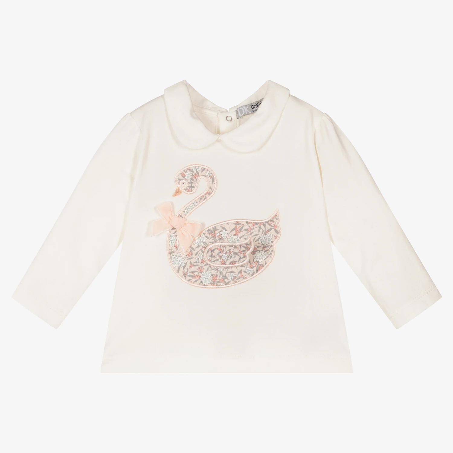 Lovely ivory top for baby girls by Dr. Kid, made in soft cotton jersey. It has a pink floral-patterned swan motif on the front, with a pink velvet ribbon bow. The back has a matching patterned insert, and fastens with poppers.