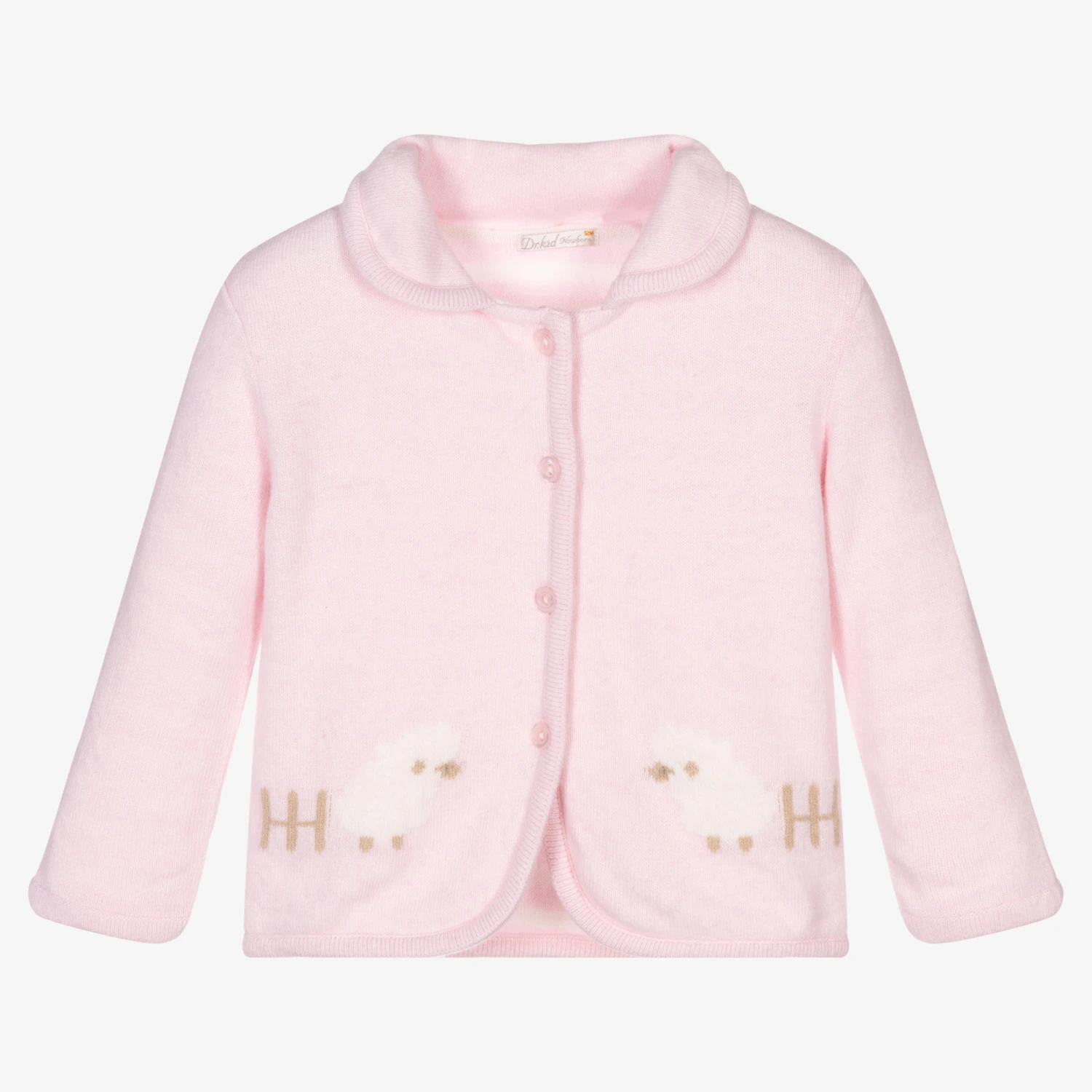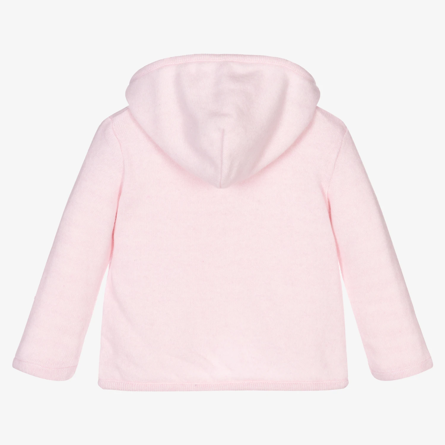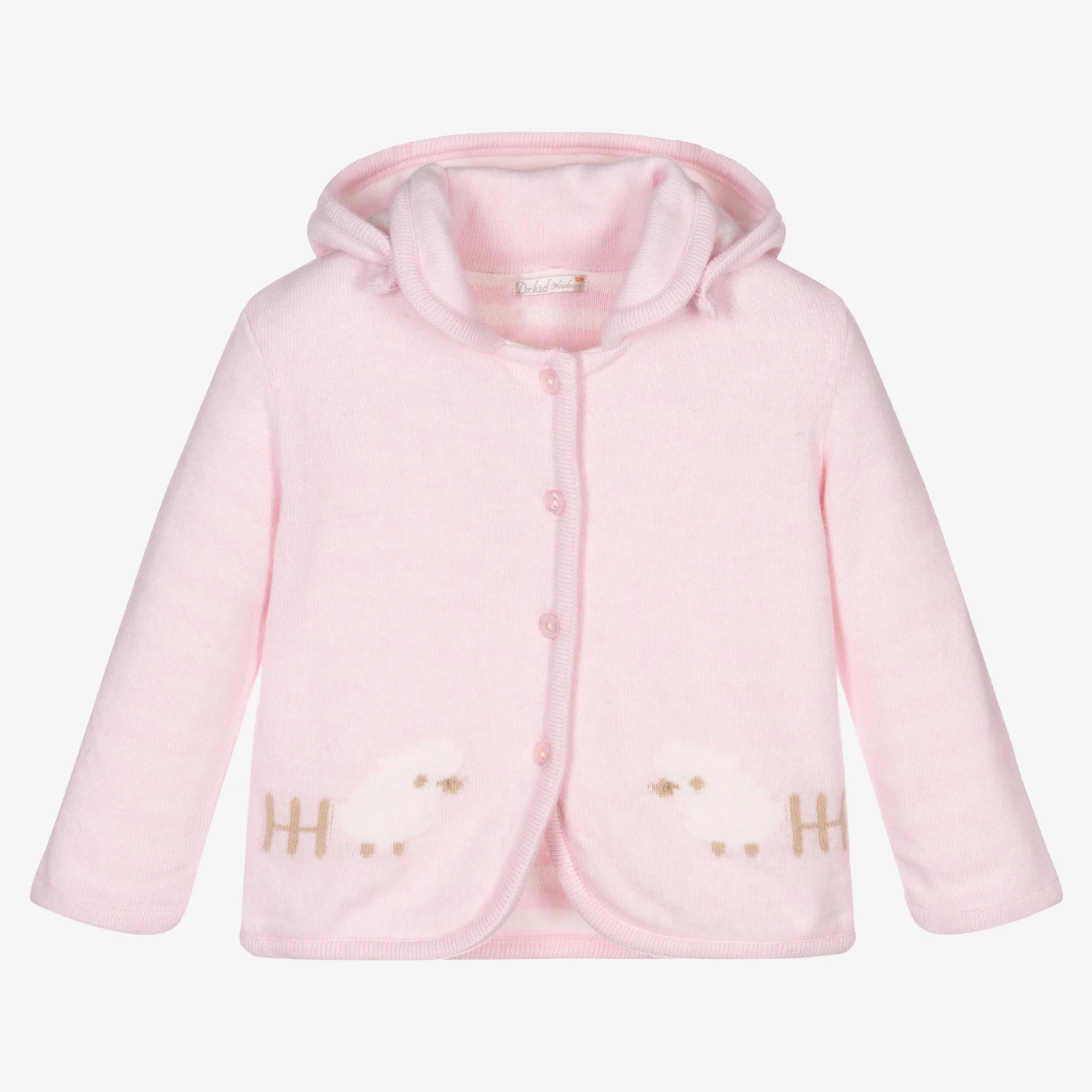 Pink hooded cardigan for baby girls by Dr. Kid. Cosy and soft, it is knitted in a double layer blend of wool, cashmere and viscose, and patterned with cute sheep on the front. The hood is detachable and there is a sweet little collar.