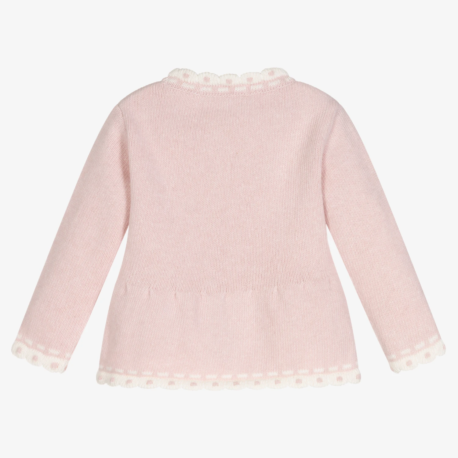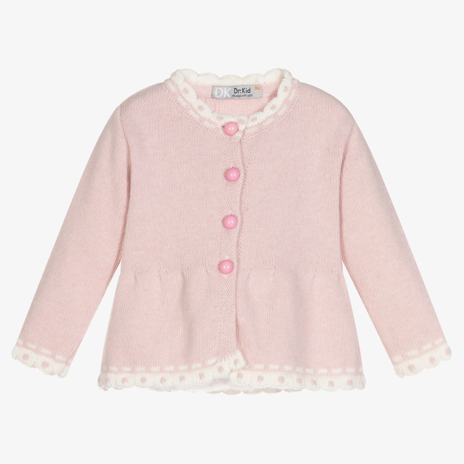 Pretty pink cardigan for baby girls from Dr. Kid. Knitted in a soft wool and cotton blend, it has patterned ivory and pink scalloped trim.