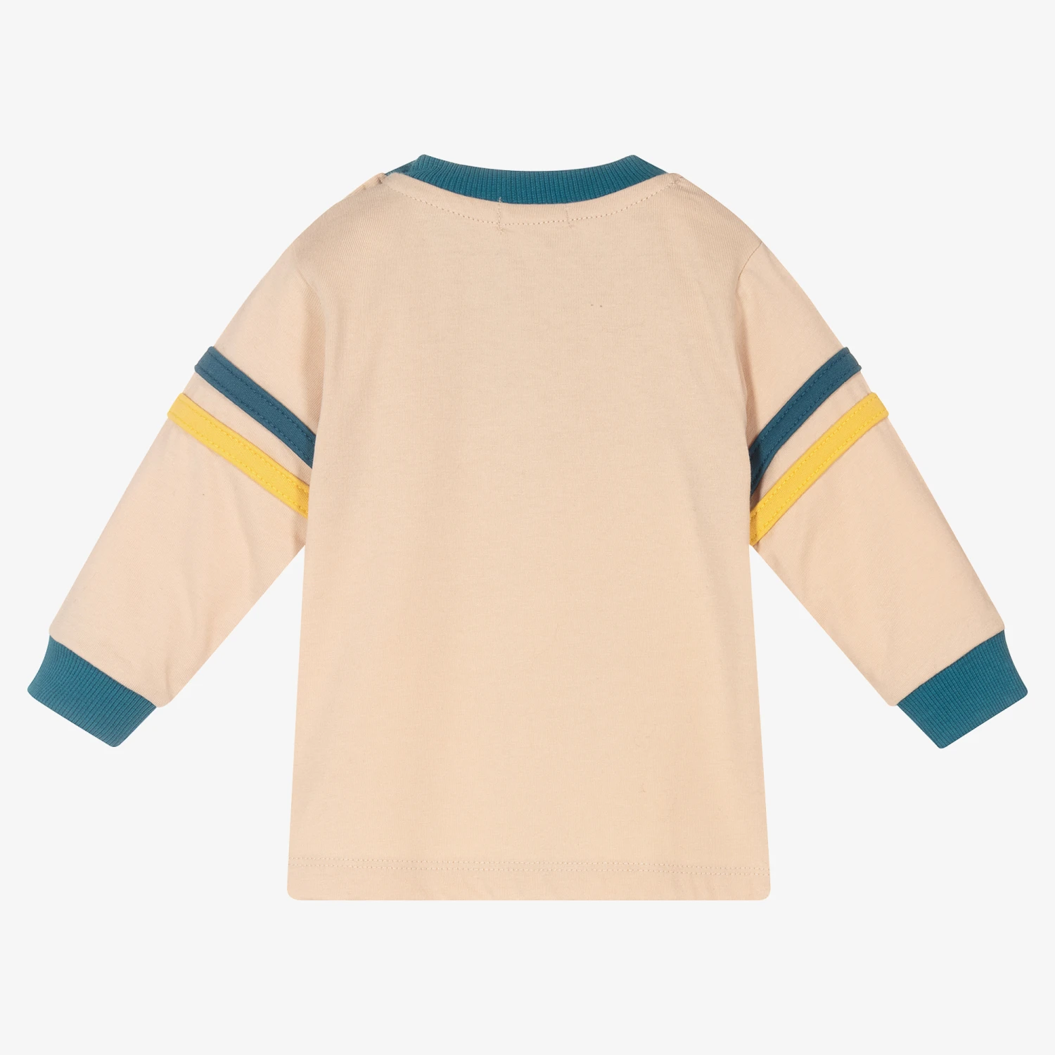 Beige long-sleeved top for boys by Dr. Kid, made in soft cotton jersey. It has a cute dog print and the words ‘Born pack leader’ in teal blue and yellow, with matching trim. There are useful popper fastenings on one shoulder.