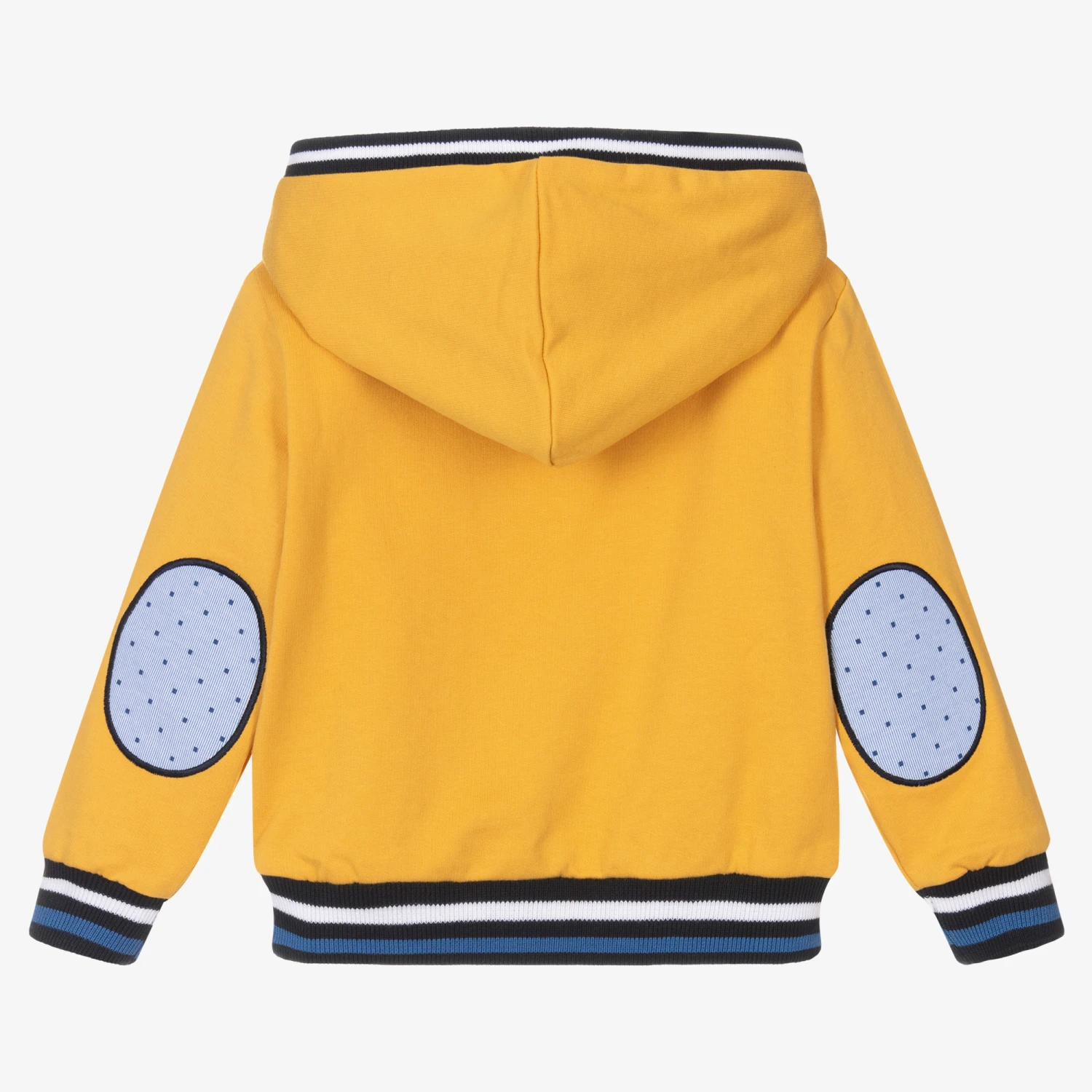 Mustard yellow hooded sweatshirt for little boys by Dr. Kid, made in soft cotton-blend jersey. Easy to wear, this comfortable top has button fastenings on the front, a useful pouch pocket and a sweet ‘Padel Club’ appliqué on the chest. It has stretchy striped trims with a contrast spot pattern on the inside of the hood and on the elbow patches.