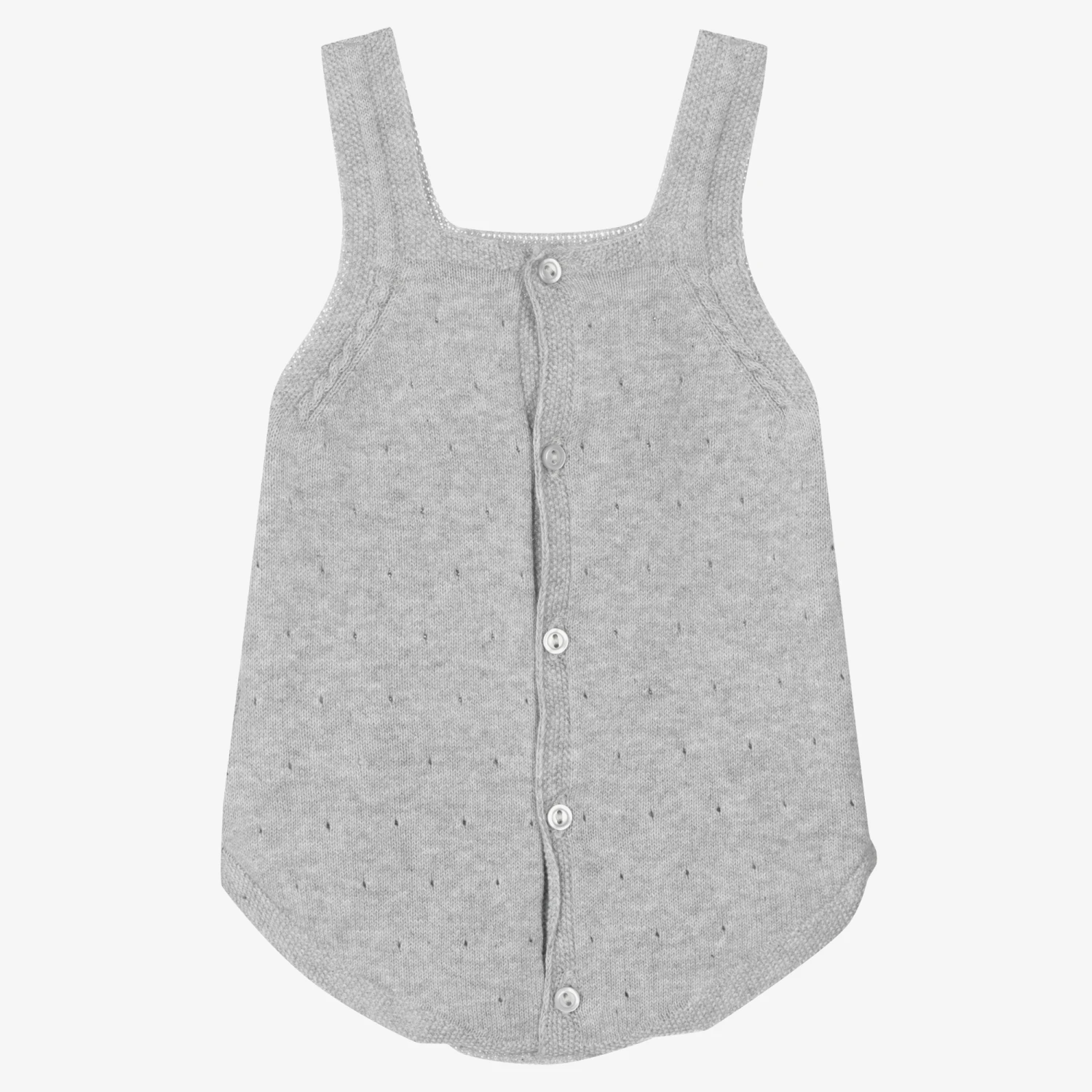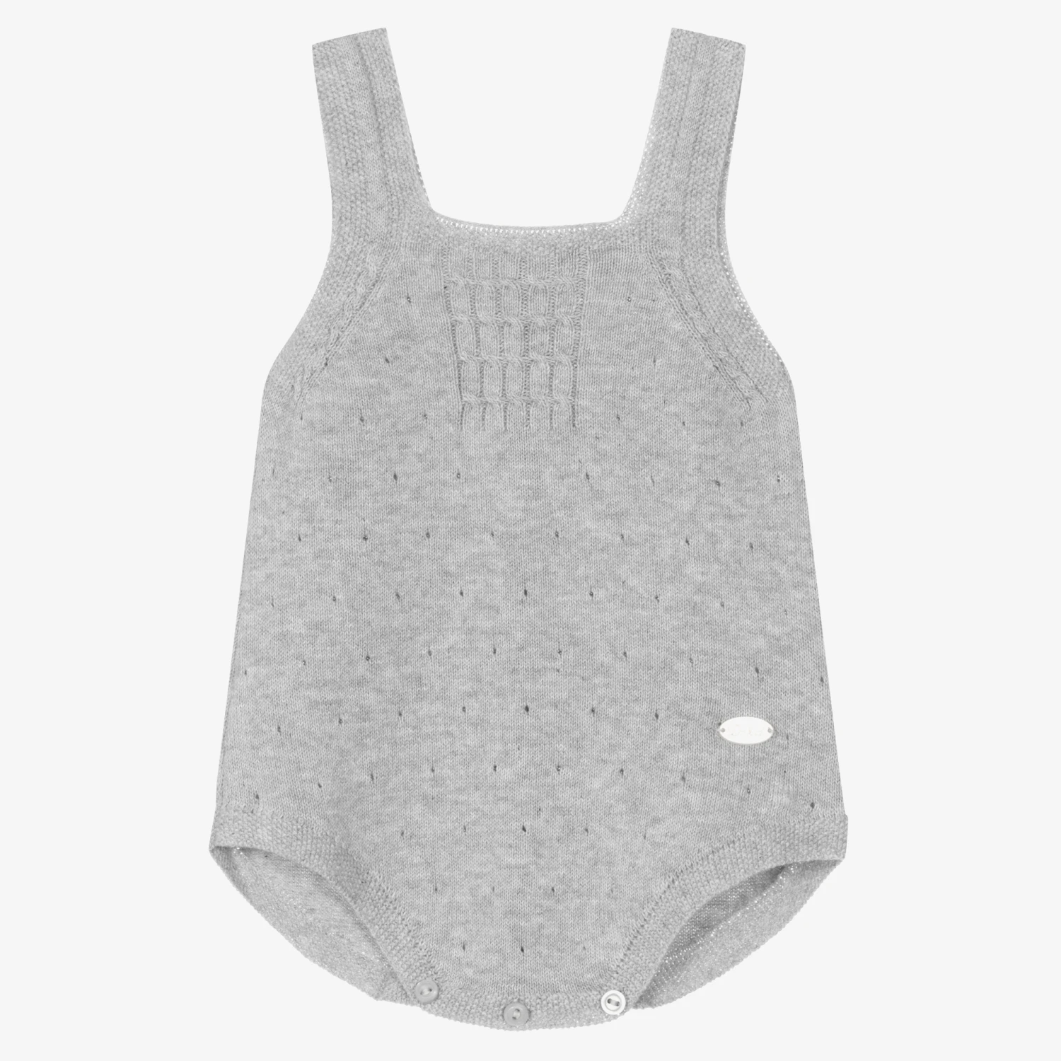 A cute grey shortie for baby boys and girls by Dr. Kid, made in a fine, soft cotton knit. Designed with a square neckline, it has a repeated openwork design on the front and back with twisted cable rib stitch trims on the chest. There are button fastenings on the back and between the legs for convenience when changing.