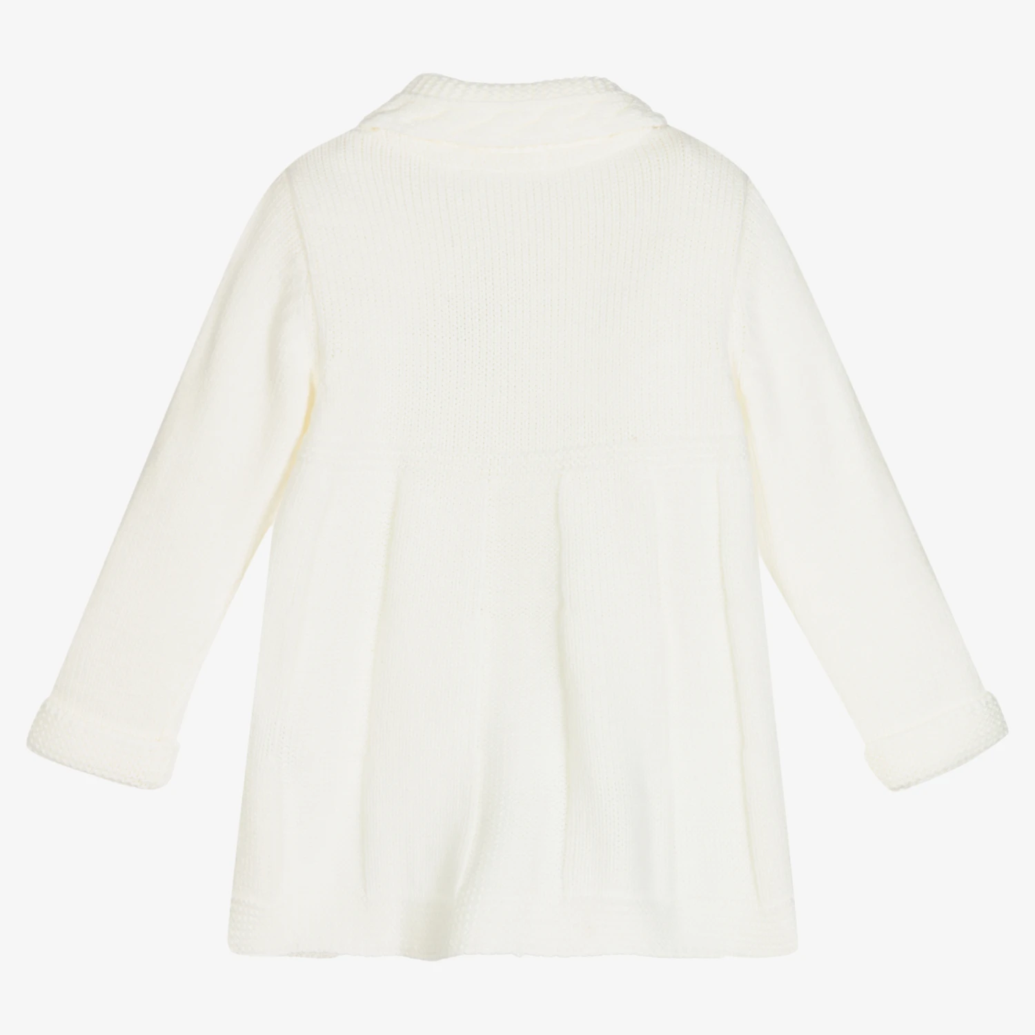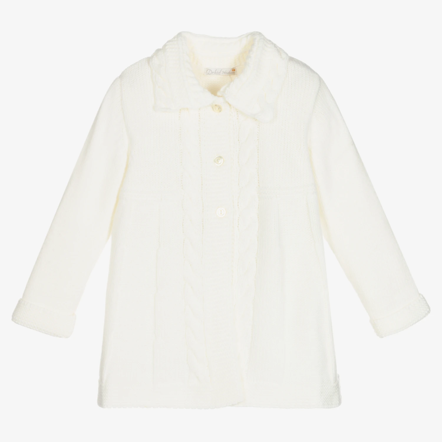 Long length ivory cardigan for baby boys and girls by Dr. Kid, knitted in soft acrylic. It has lovely cable stitch detailing, with front button fastenings.