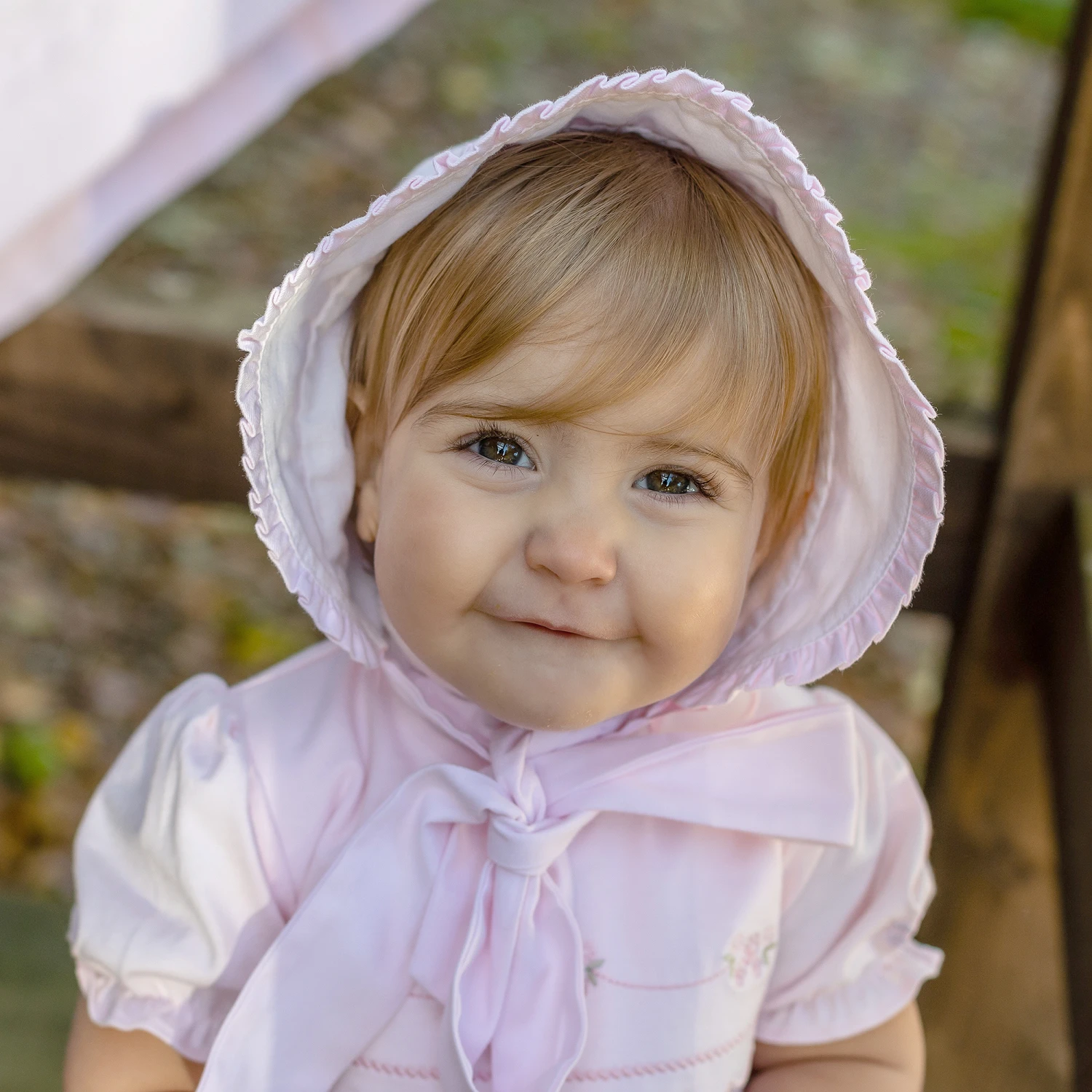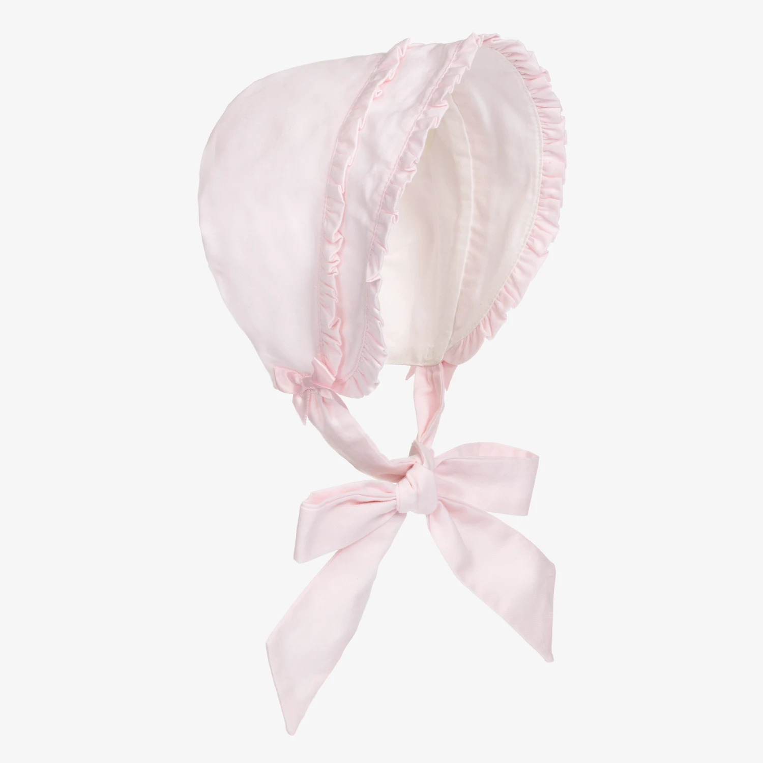 Sweet pale pink bonnet for baby girls by Emile et Rose, made in soft cotton with a brushed feel. Fully lined, it has pretty ruffle trims around the front and pink ribbon bows on the sides. It secures with ties under the chin.